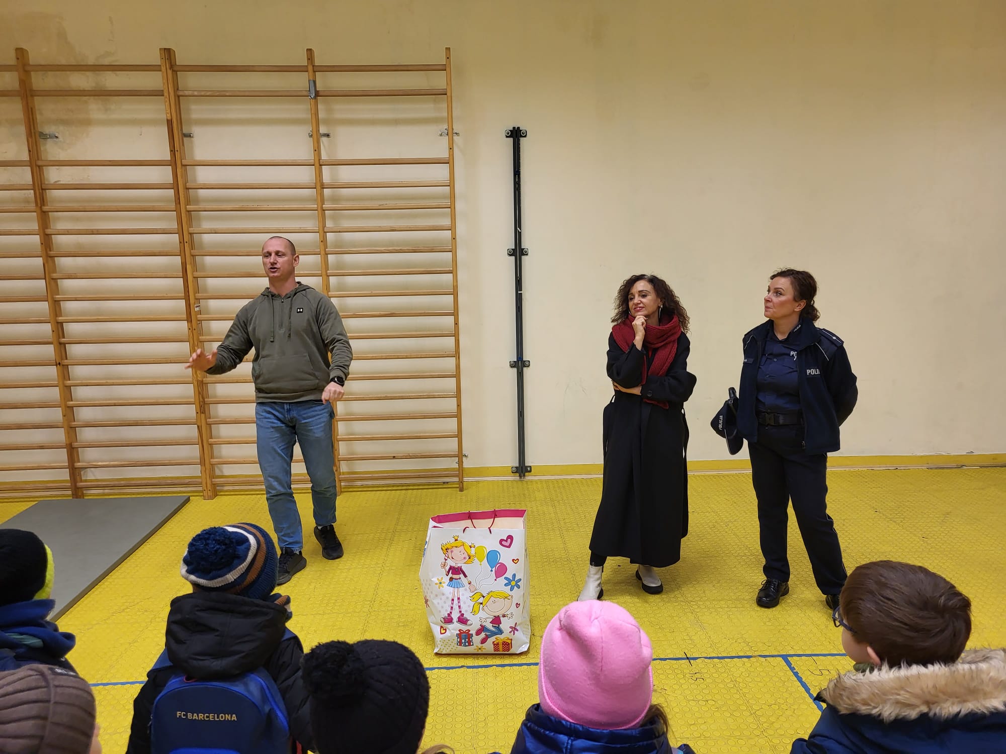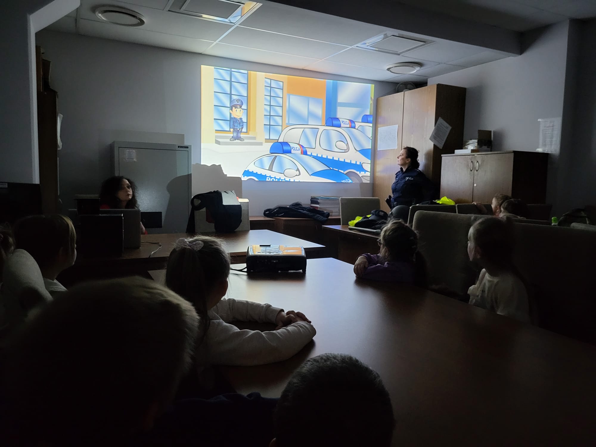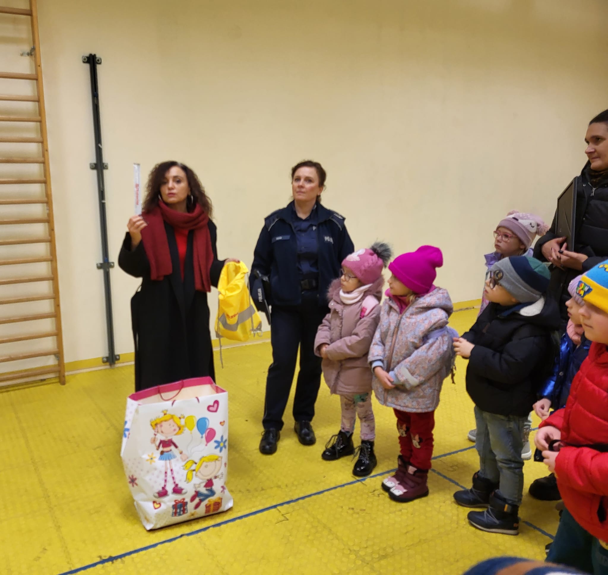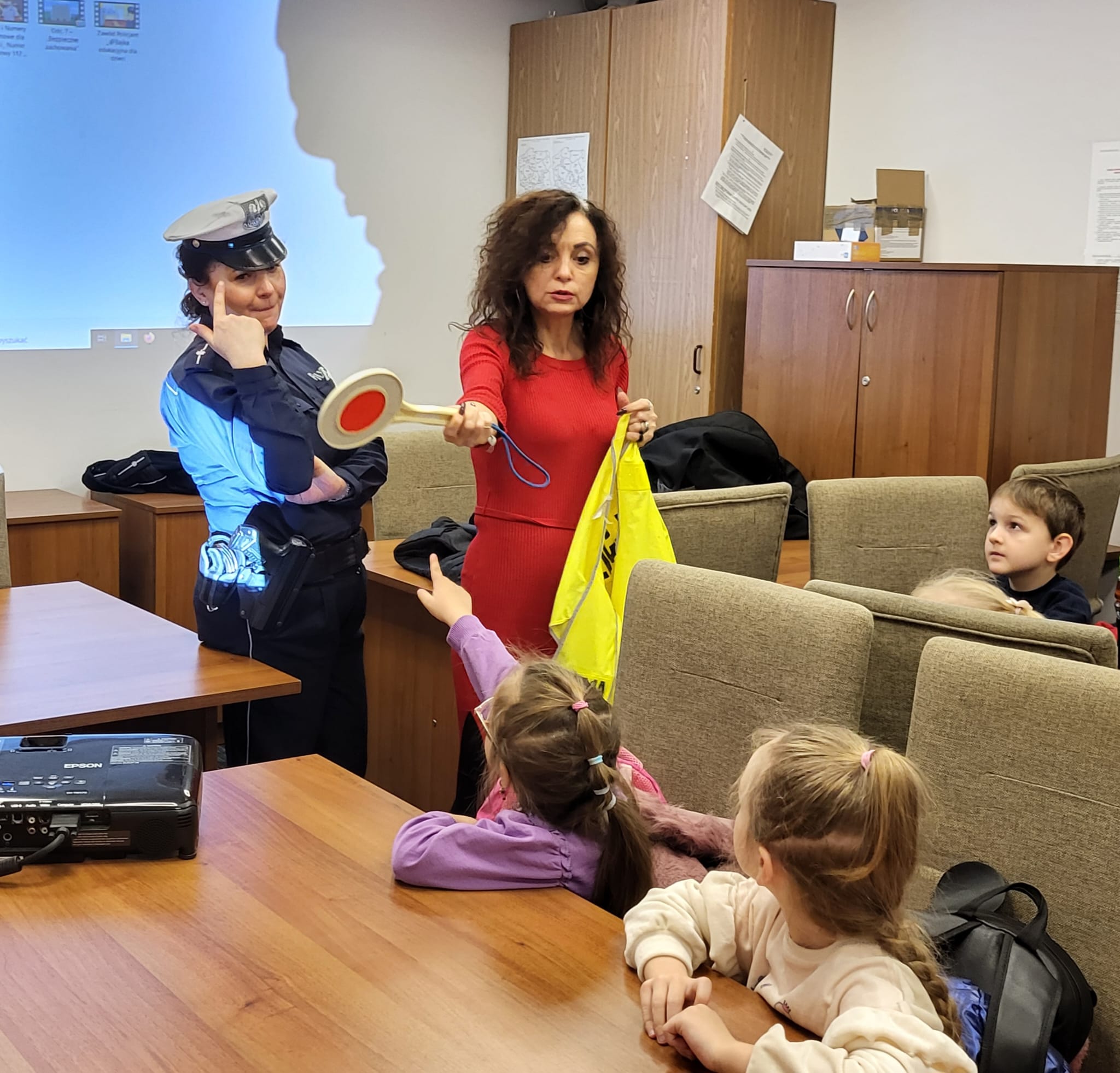 Panie przygotowały dla dzieci specjalne zajęcia edukacyjne. Przedszkolaki dowiedziały się, jak bezpiecznie poruszać się po drodze, dlaczego należy nosić odblaski oraz jak reagować w sytuacjach zagrożenia. Podczas wizyty Pani Magdalena opowiedziała przedszkolakom o swojej codziennej służbie, pokazała elementy umundurowania oraz podstawowy sprzęt, z którego policjanci korzystają.