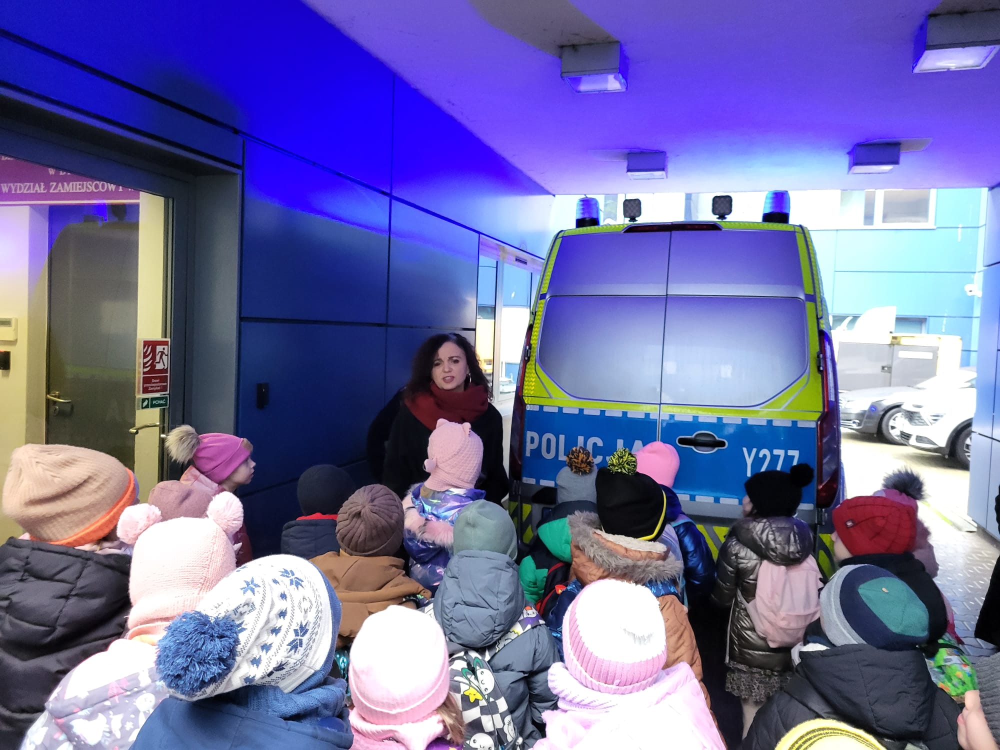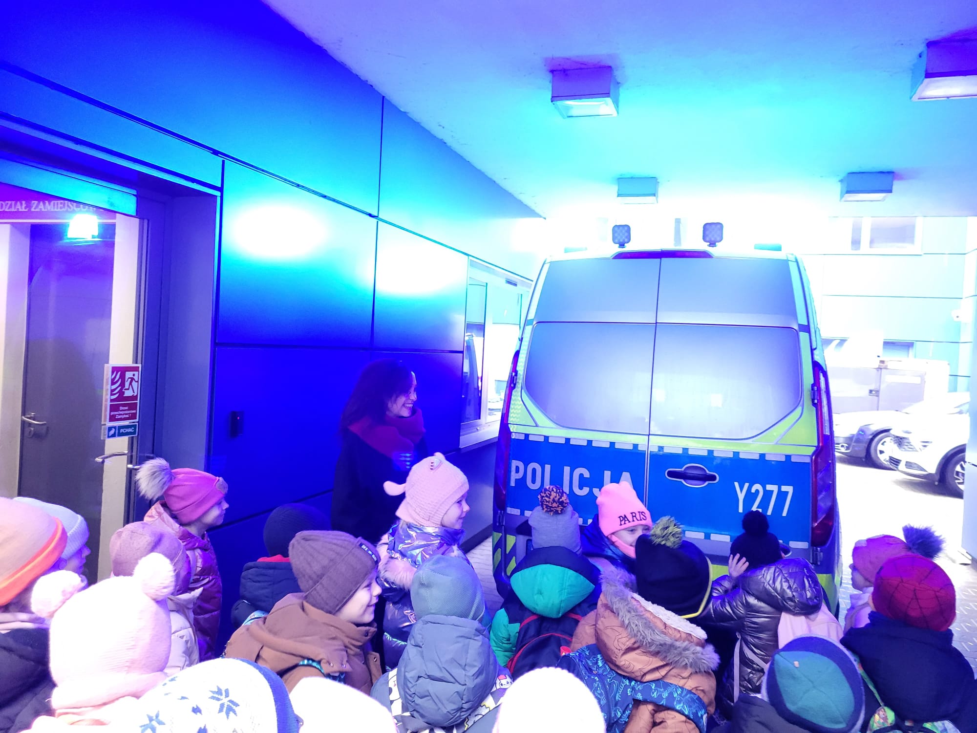 Po przywitaniu przez Panią Katarzynę i Pania Magdalenę mali goście zwiedzili budynek komendy. Dzieci mogły obejrzeć radiowóz policyjny, a także usłyszały, w jakich sytuacjach są one wykorzystywane. Dużą atrakcją okazało się włączanie sygnałów świetlnych i dźwiękowych, co wywołało wiele emocji i uśmiechów.
