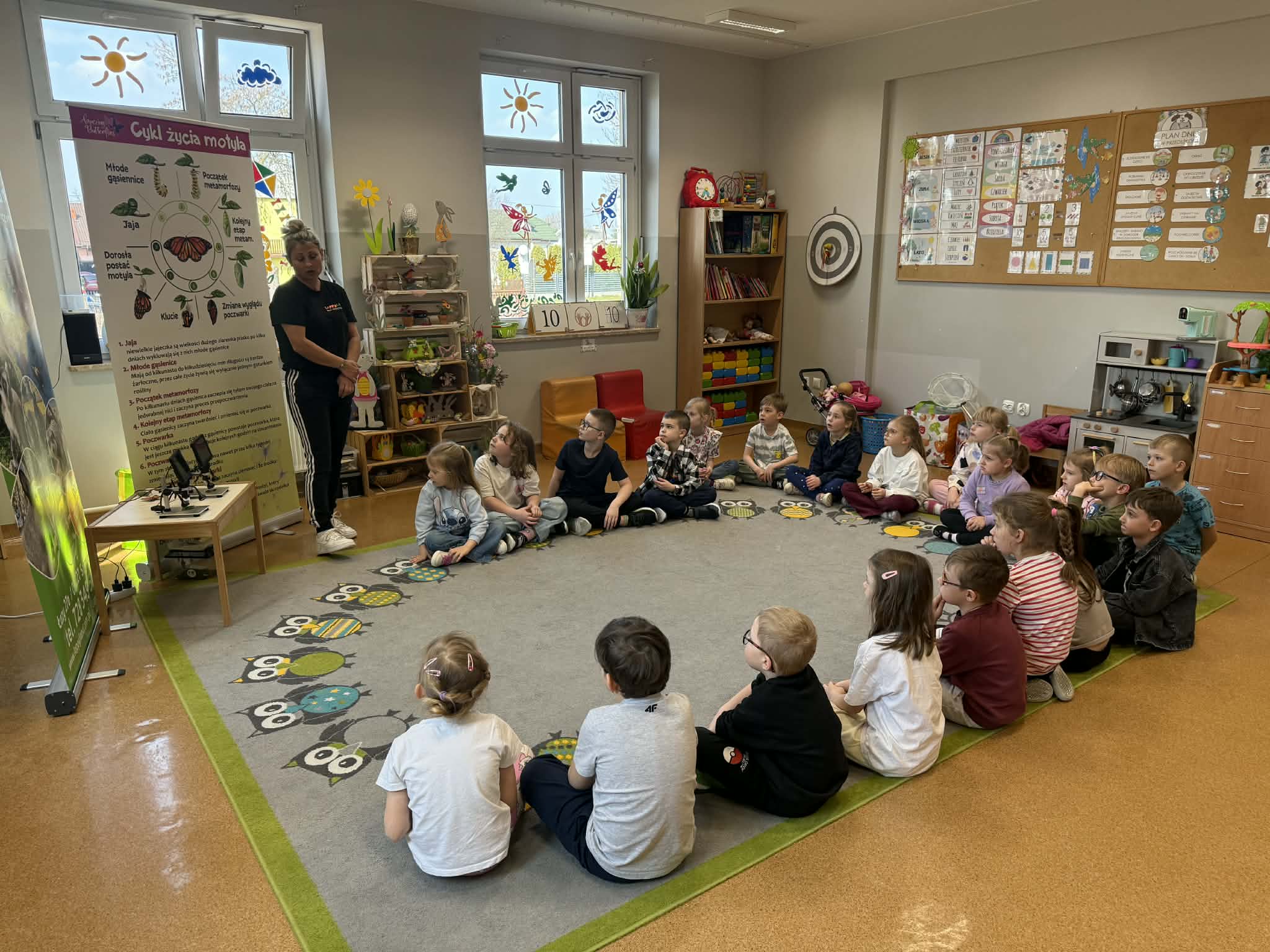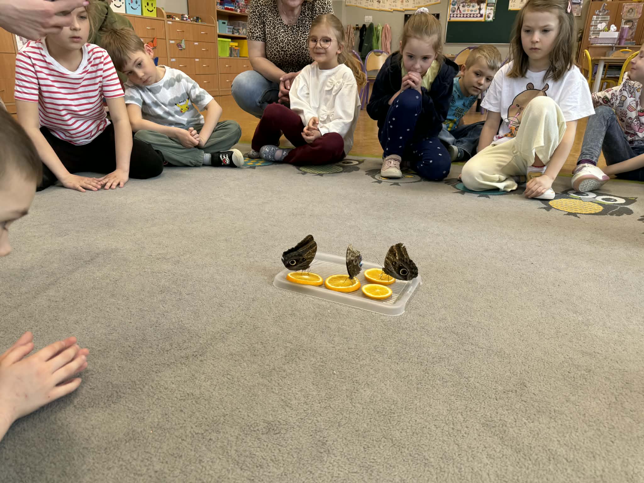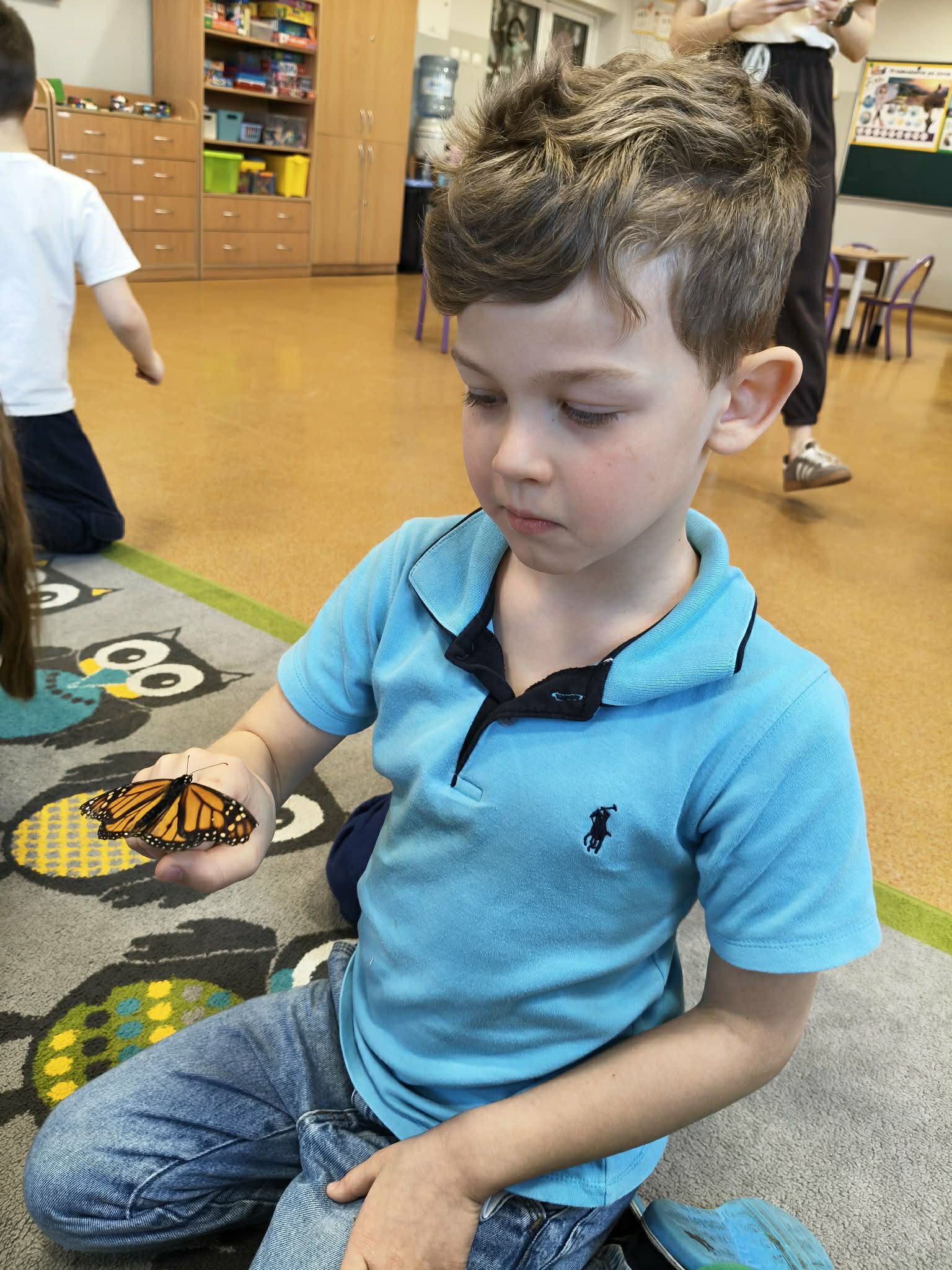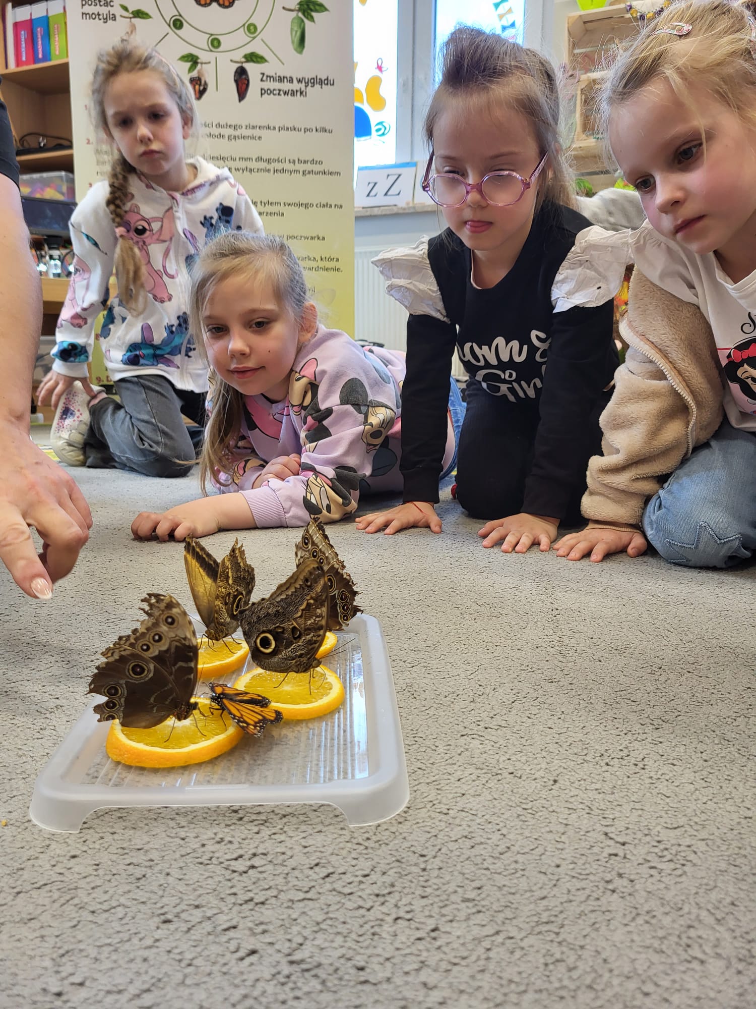 Podczas spotkania przedszkolaki dowiedziały się, jak wygląda cykl życia motyla – od jajeczka, przez gąsienicę i poczwarkę, aż do dorosłego owada. Dzieci z zaciekawieniem obserwowały kolorowe motyle, poznawały ich zwyczaje oraz różnorodność gatunków.
