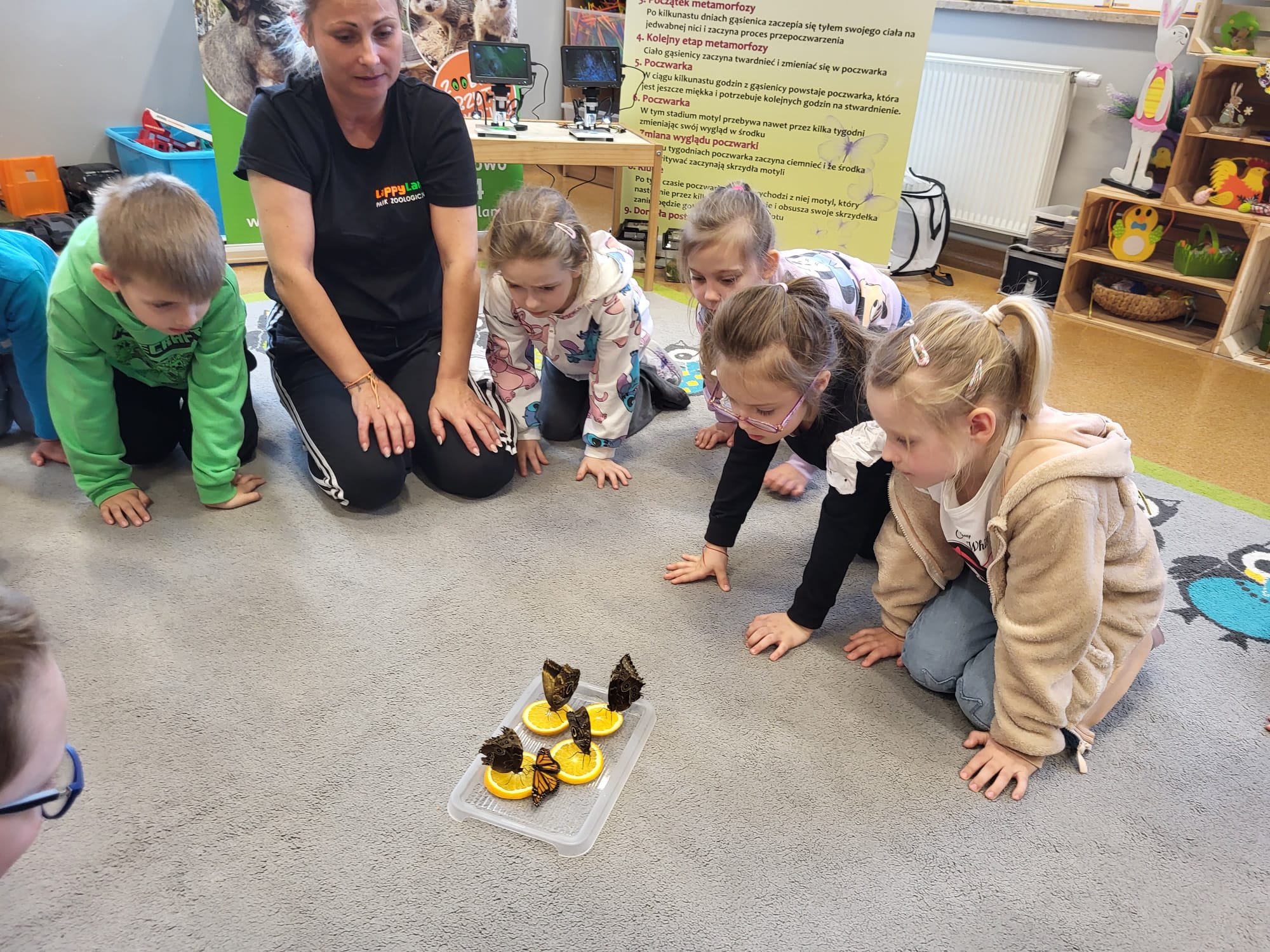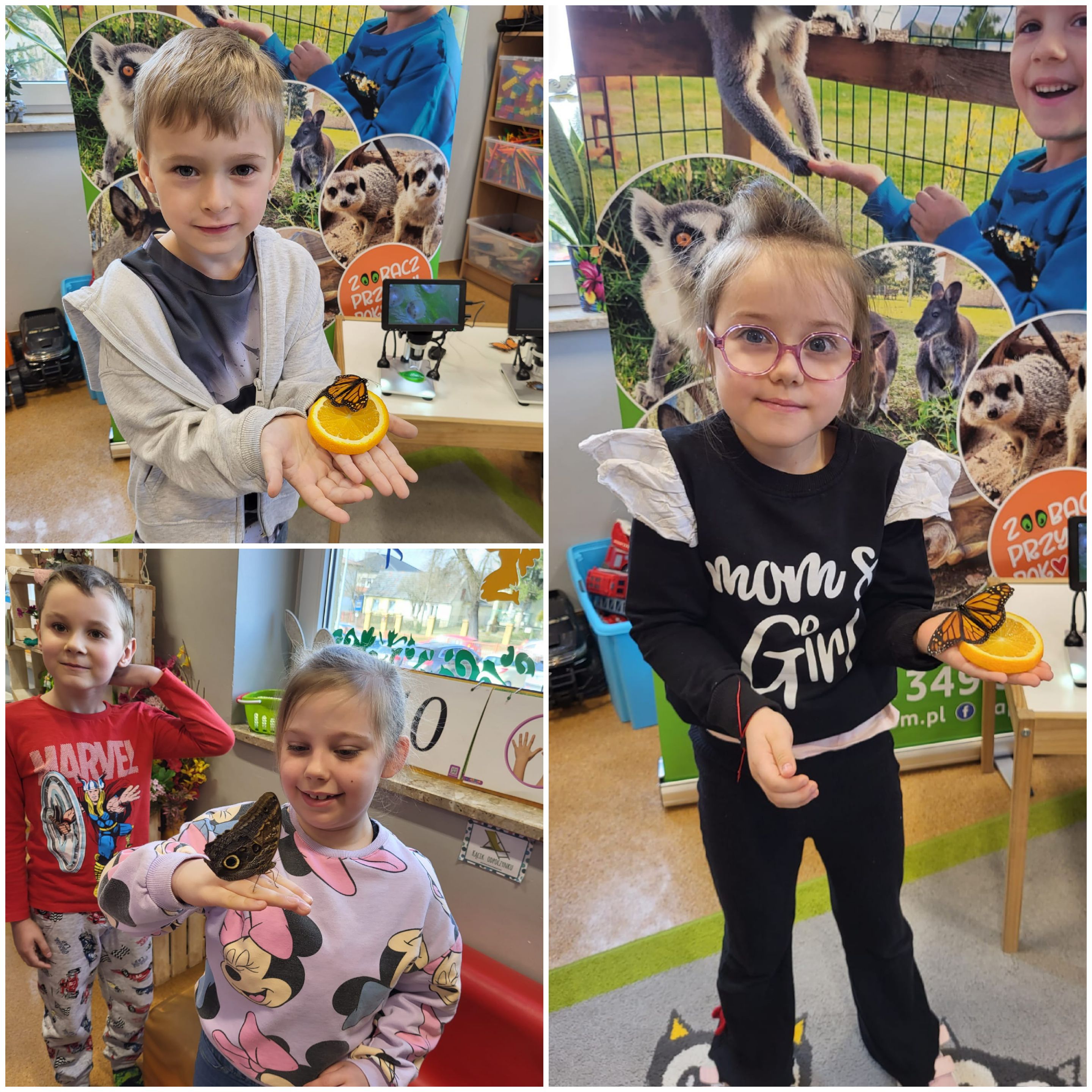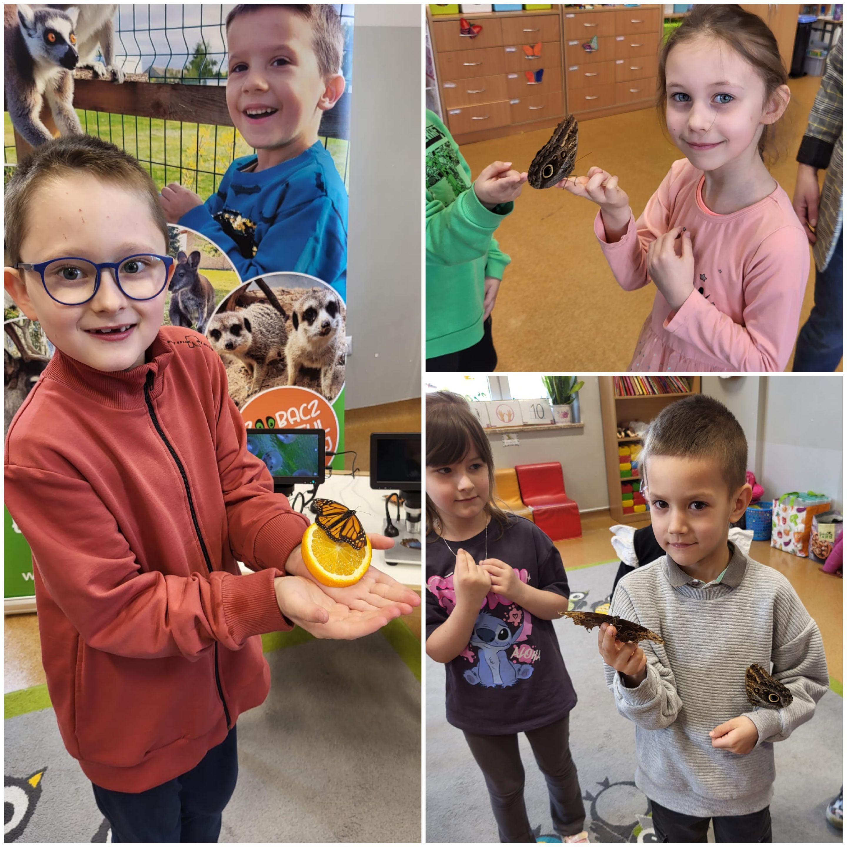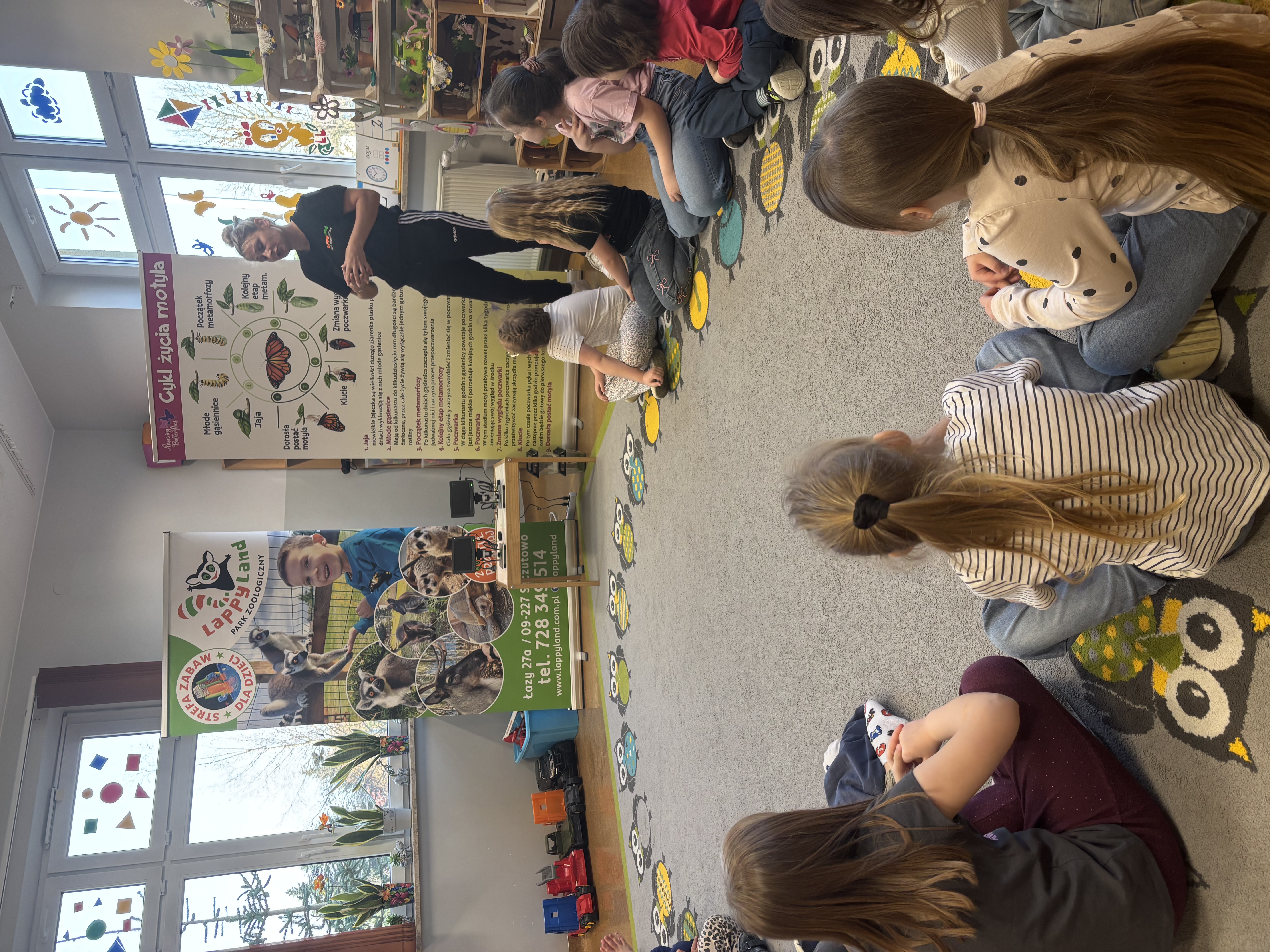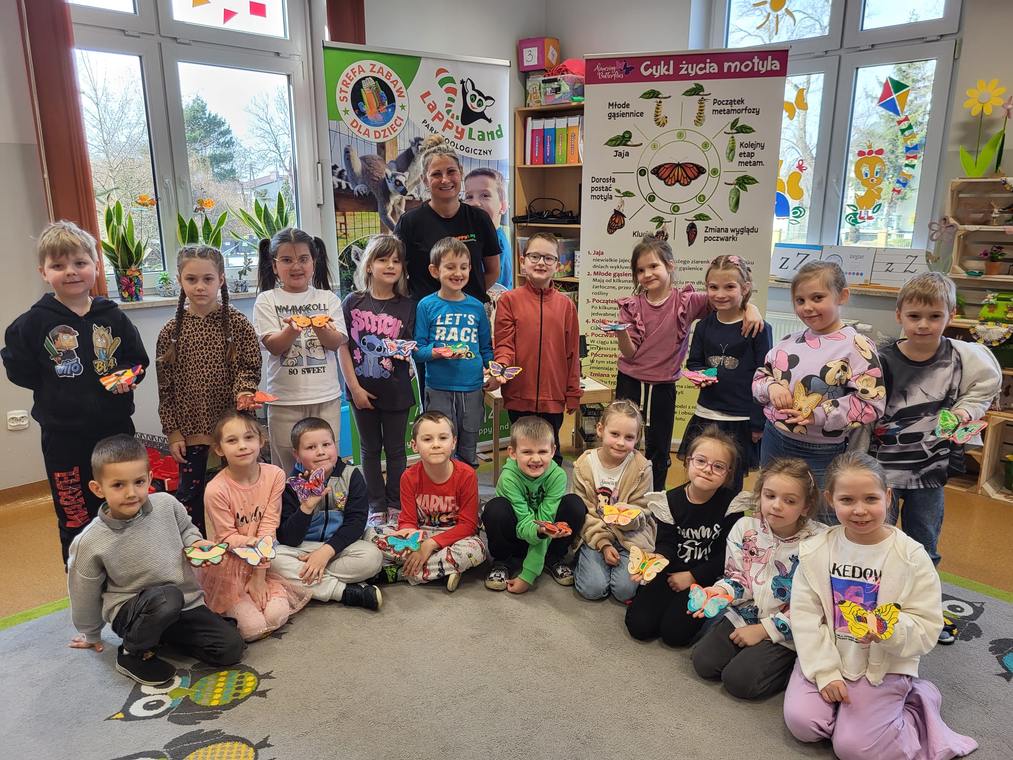 Podczas spotkania przedszkolaki dowiedziały się, jak wygląda cykl życia motyla – od jajeczka, przez gąsienicę i poczwarkę, aż do dorosłego owada. Dzieci z zaciekawieniem obserwowały kolorowe motyle, poznawały ich zwyczaje oraz różnorodność gatunków.