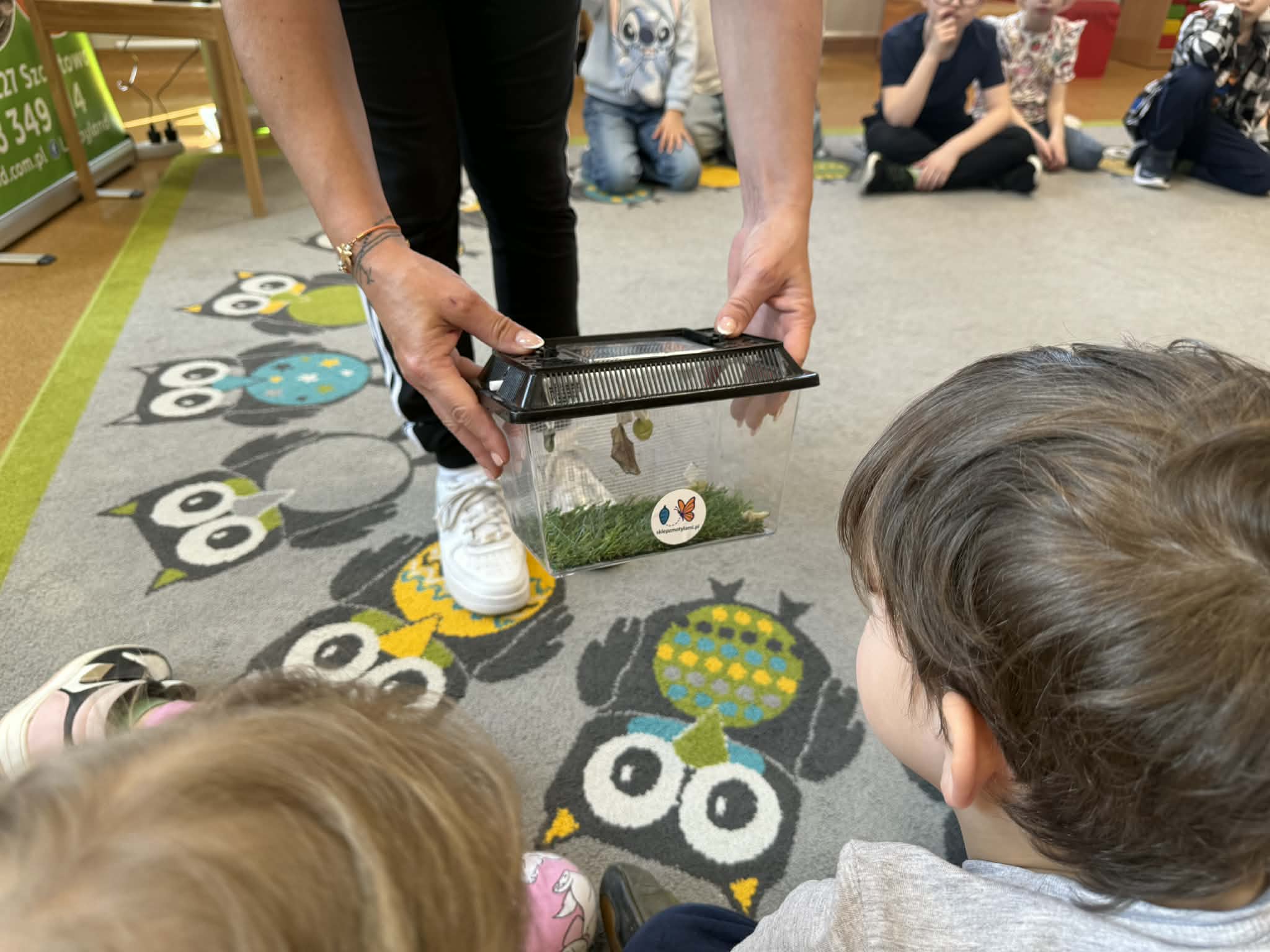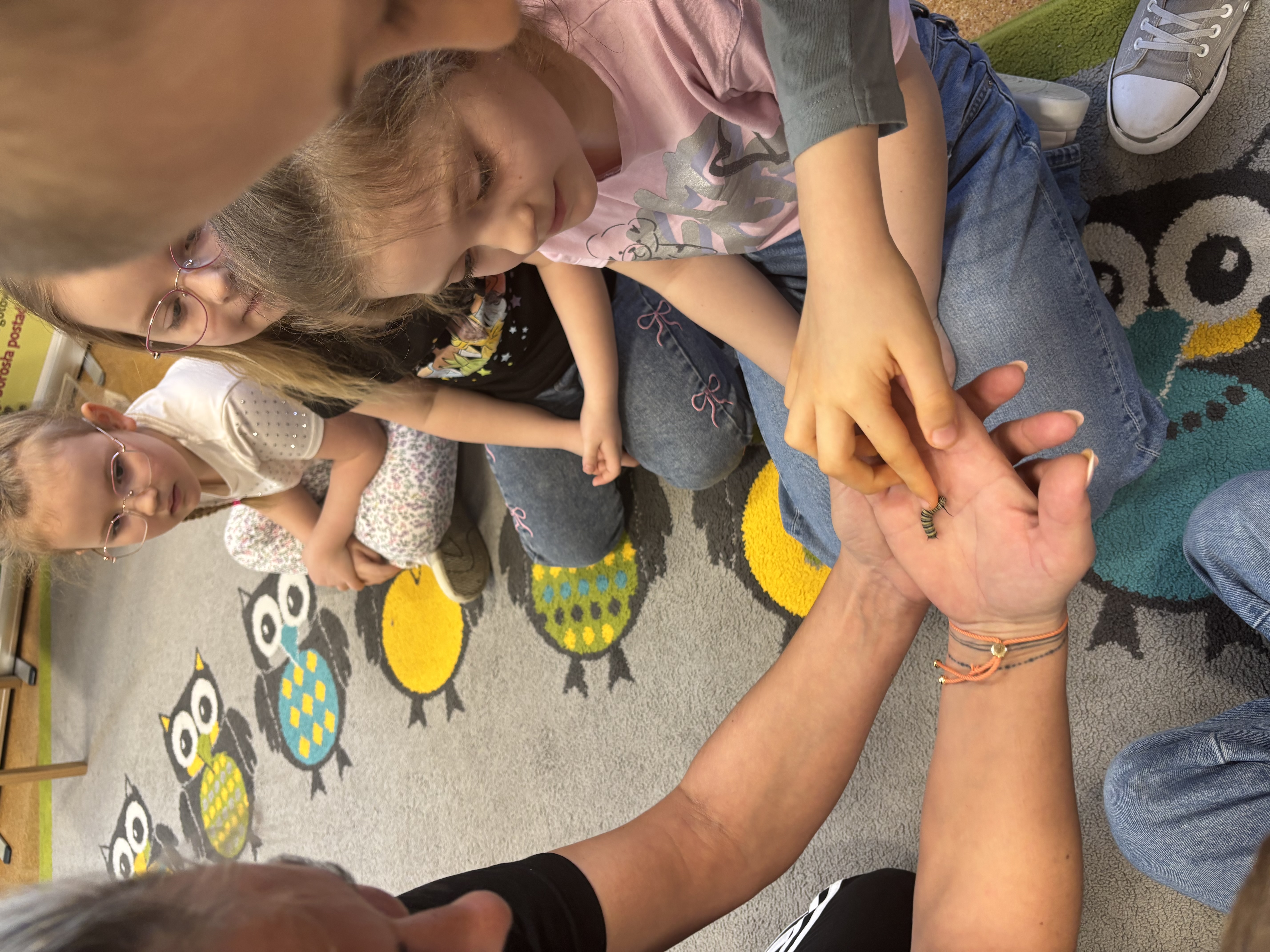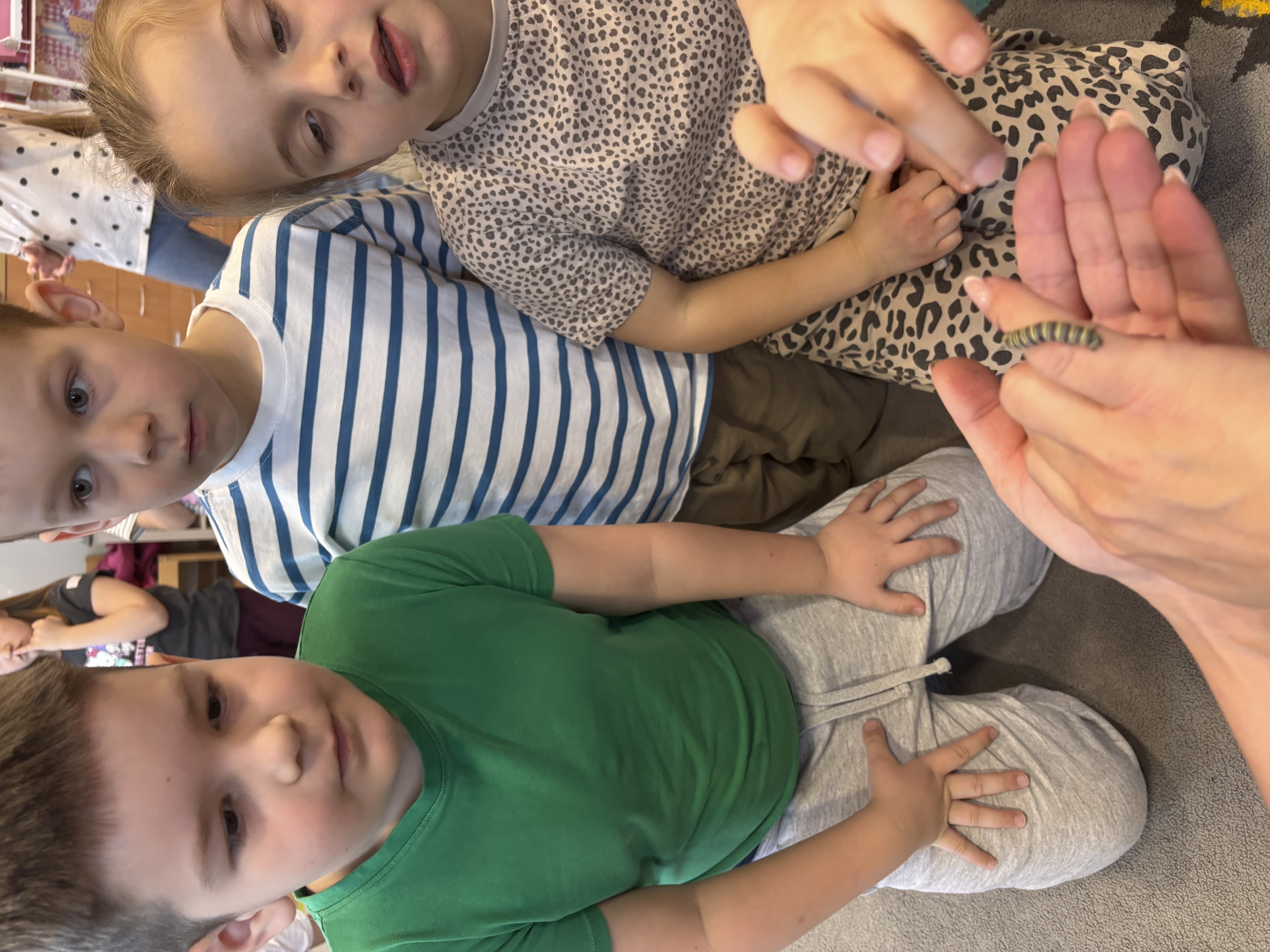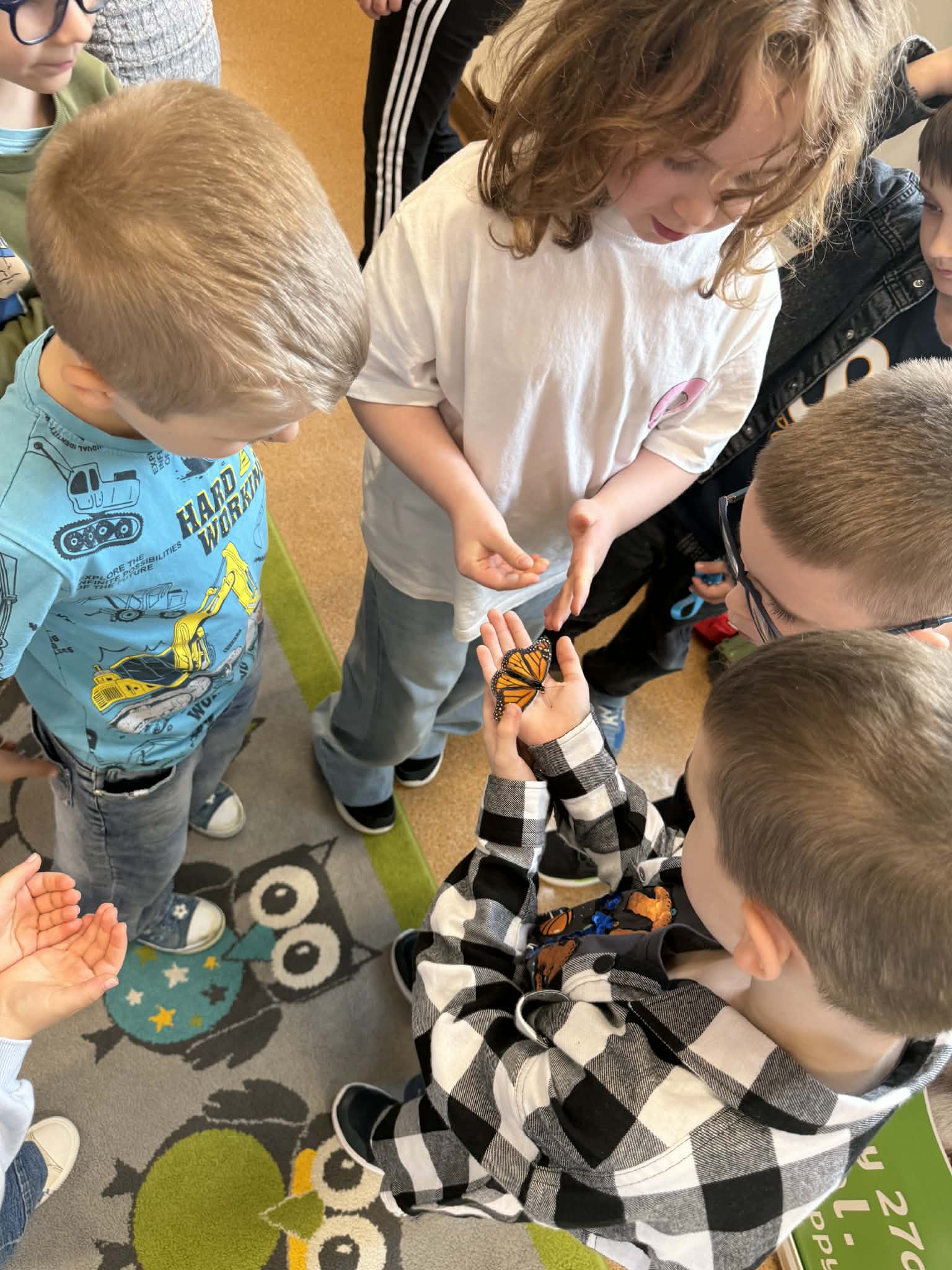Podczas spotkania przedszkolaki dowiedziały się, jak wygląda cykl życia motyla – od jajeczka, przez gąsienicę i poczwarkę, aż do dorosłego owada. Dzieci z zaciekawieniem obserwowały kolorowe motyle, poznawały ich zwyczaje oraz różnorodność gatunków.