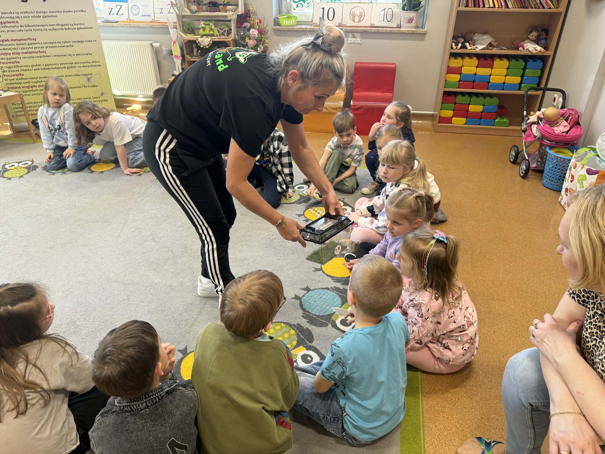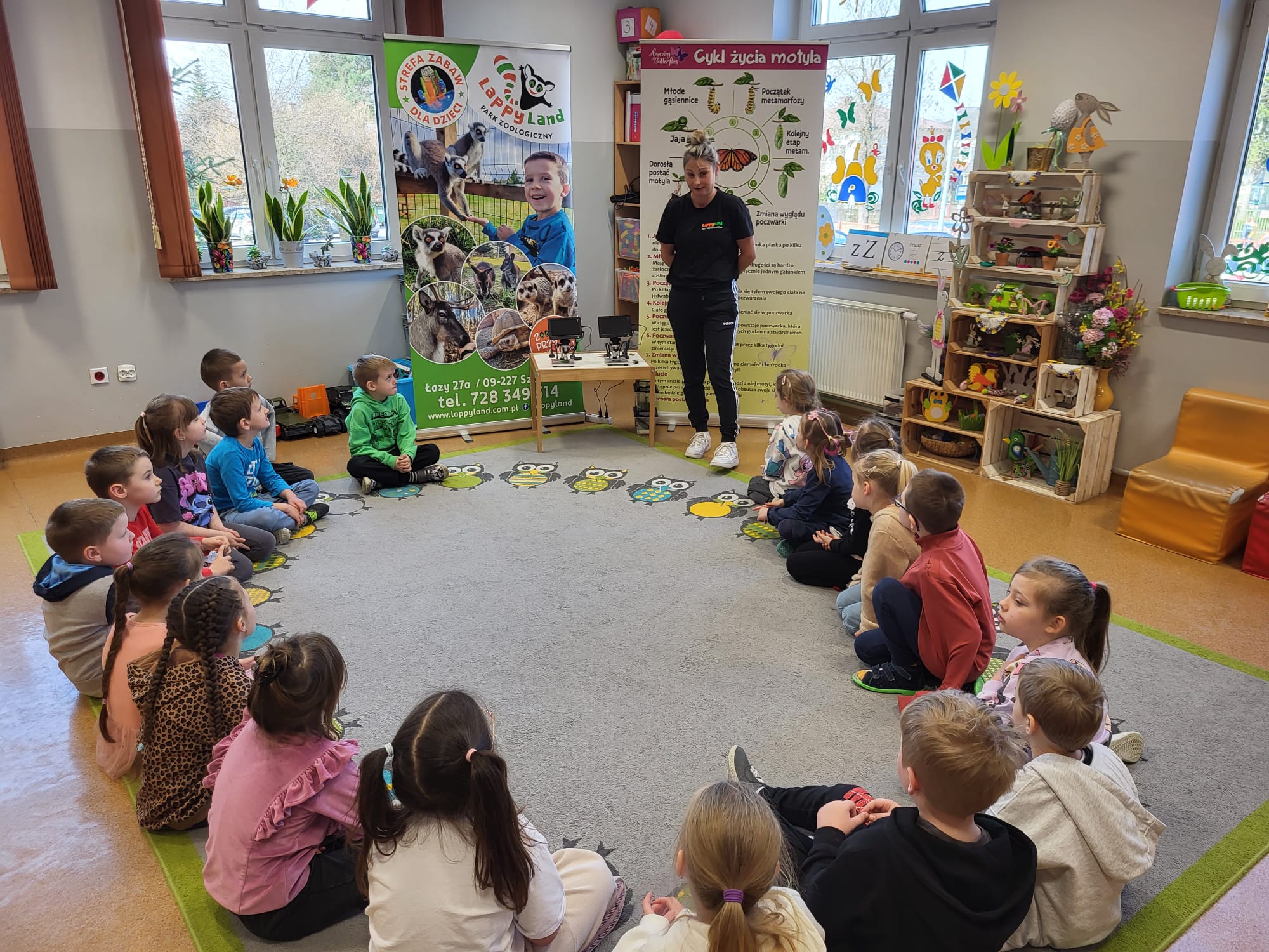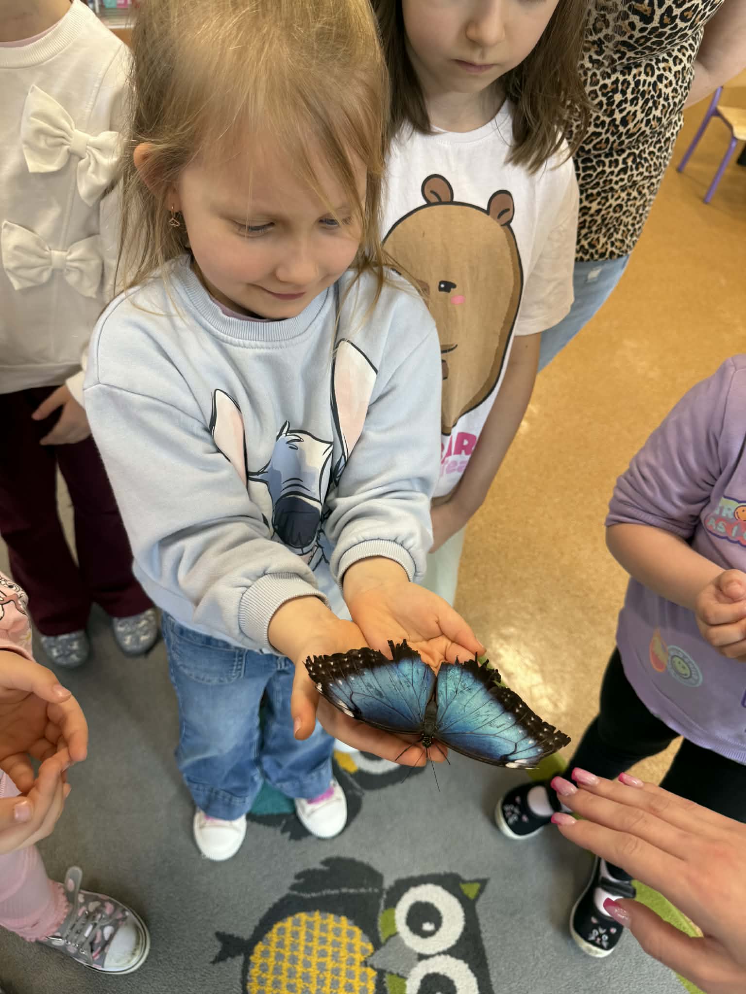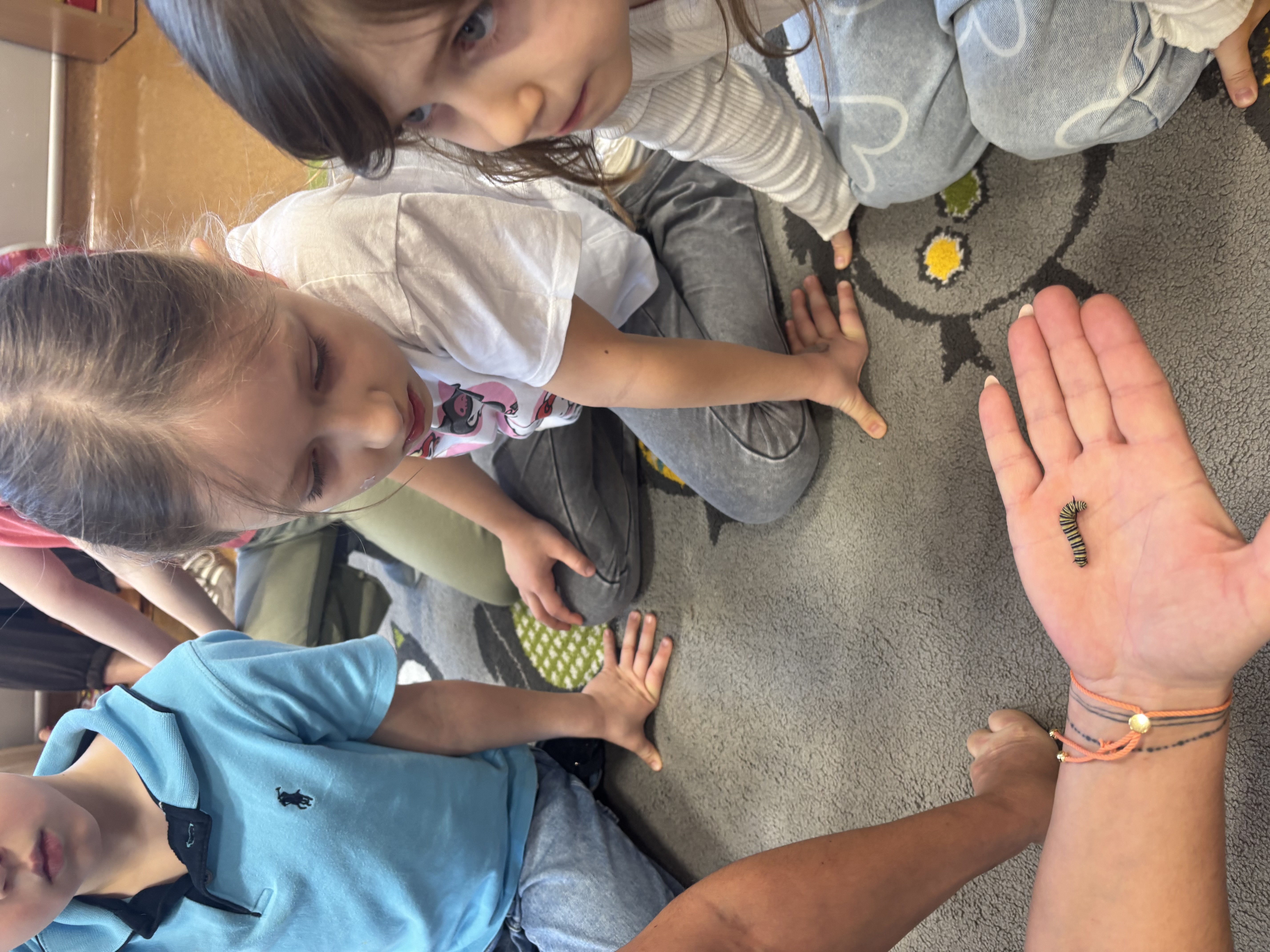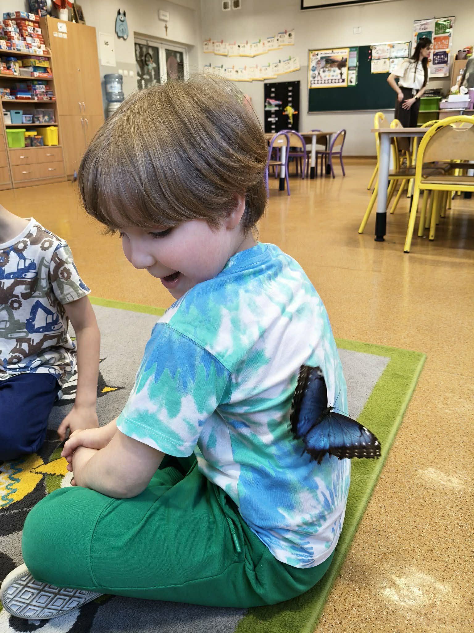 Podczas spotkania przedszkolaki dowiedziały się, jak wygląda cykl życia motyla – od jajeczka, przez gąsienicę i poczwarkę, aż do dorosłego owada. Dzieci z zaciekawieniem obserwowały kolorowe motyle, poznawały ich zwyczaje oraz różnorodność gatunków.