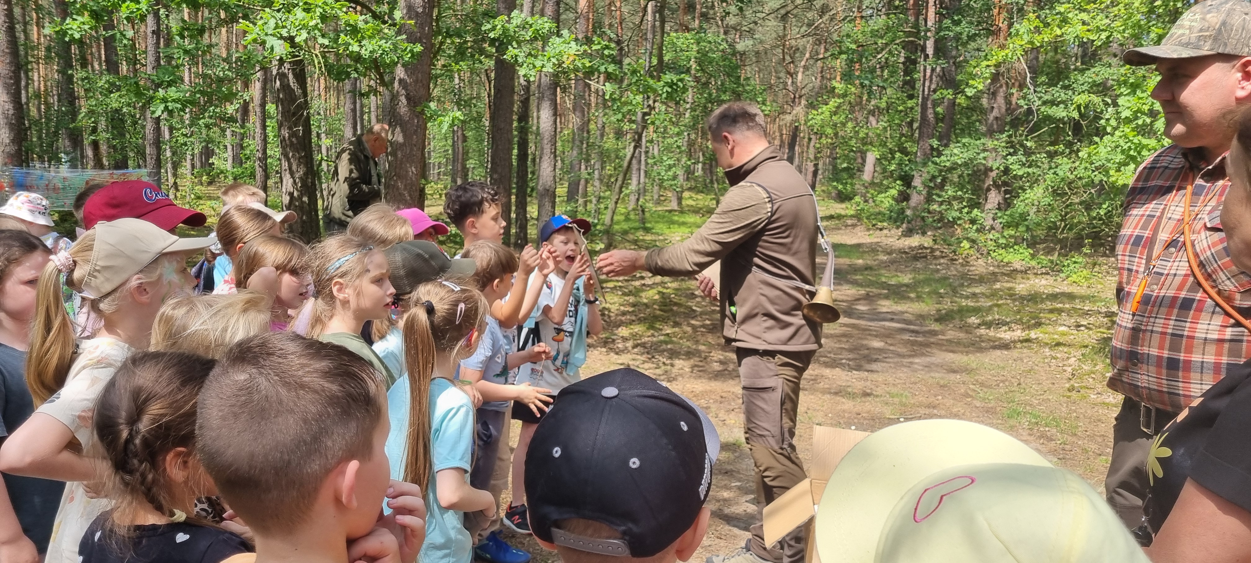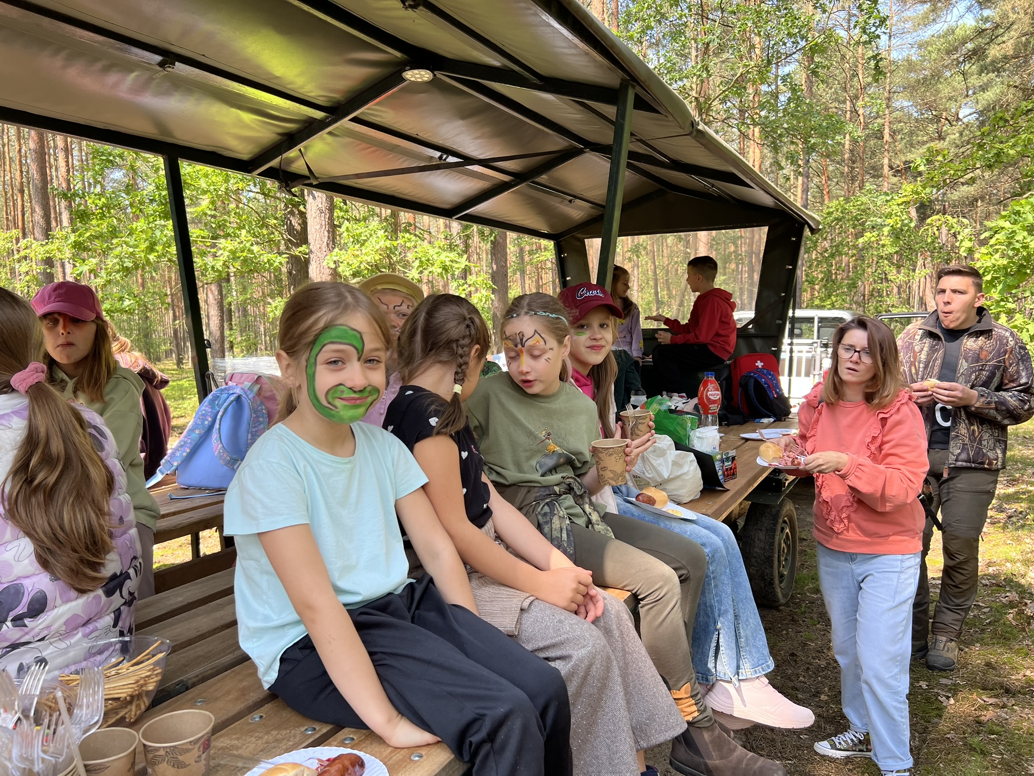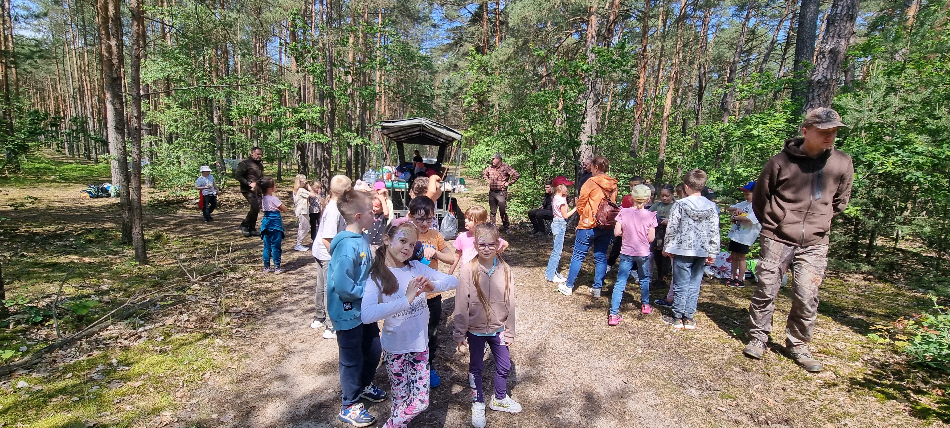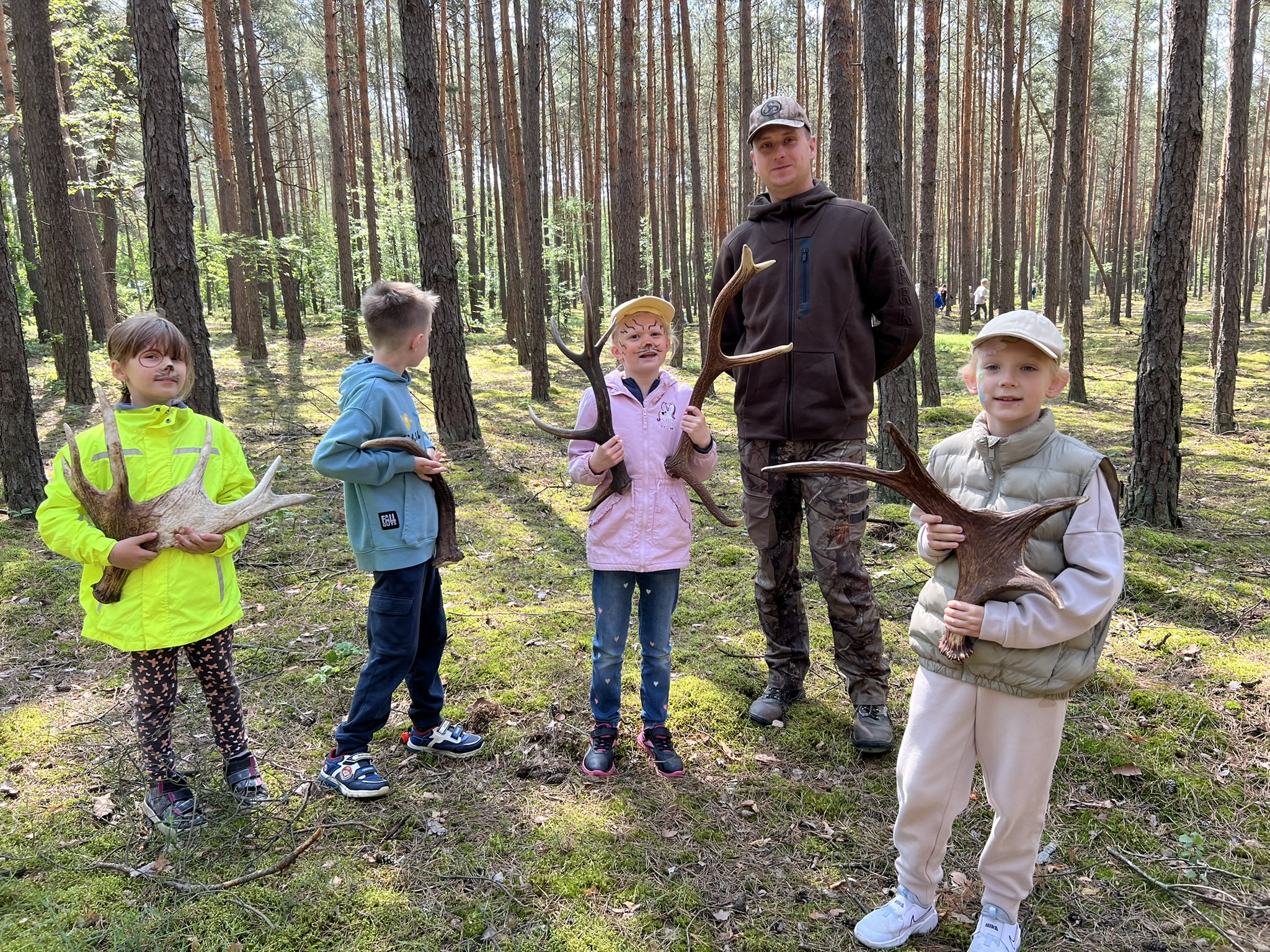 Dla dzieci przygotowano wiele atrakcji. Już od samego początku ogromną frajdę sprawiła uczniom podróż myśliwskim wozem, który dowiózł wszystkich do docelowego miejsca w lesie, gdzie na uczestników czekały różnorodne stacje aktywności: strzelanie z łuku, mecze piłki nożnej na leśnej polanie, malowanie buziek oraz emocjonujące poszukiwania poroży jeleni i tropów dzikich zwierząt. Dzieci brały także udział w „polowaniu na kaczki” – oczywiście była to zabawa z użyciem miękkiej maskotki kaczki, która uczyła spostrzegawczości i pokazała, że obserwator przyrody musi być cierpliwy i wytrwały. Nie zabrakło także wyścigów Hobby horsing i malowania na folii tego, co udało się zaobserwować w lesie.
