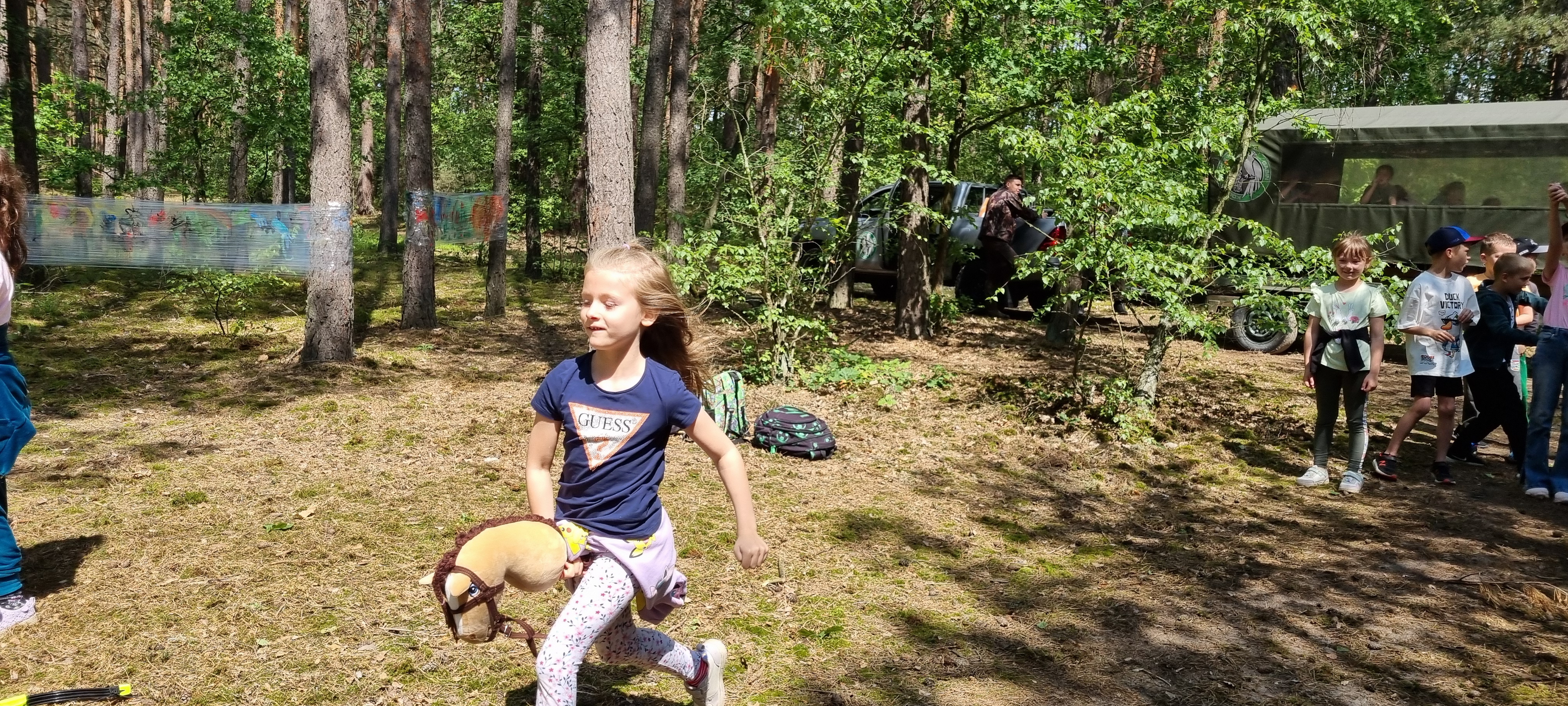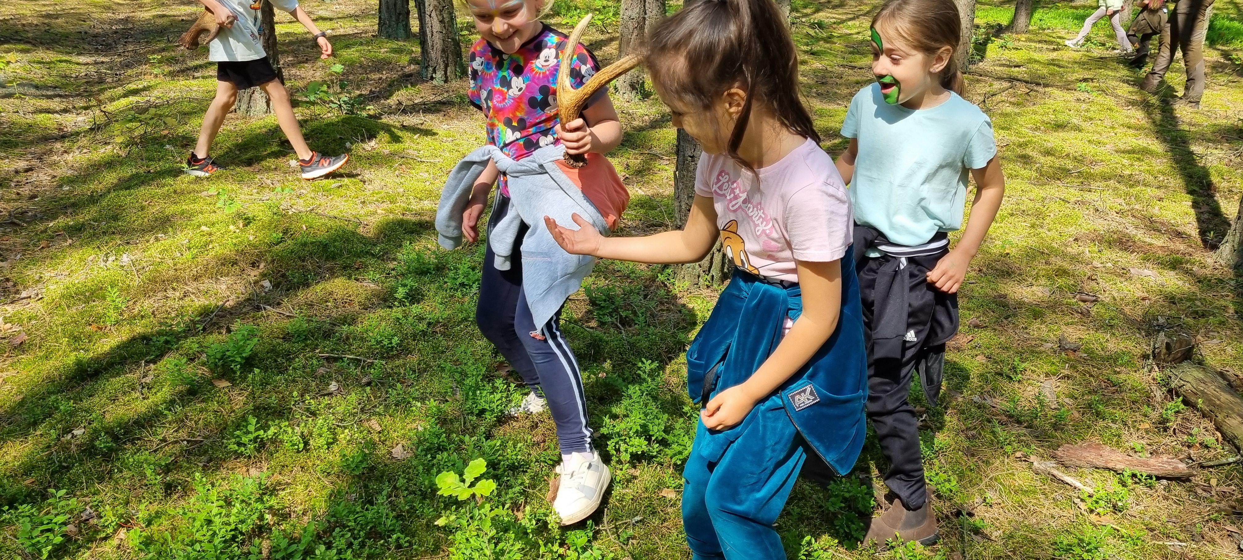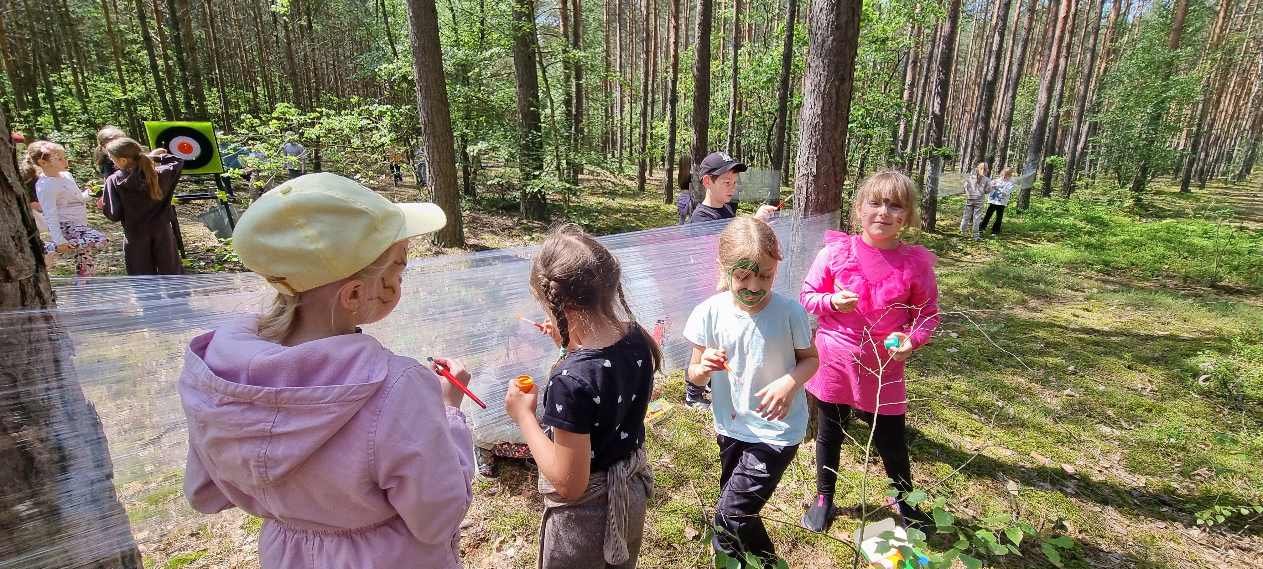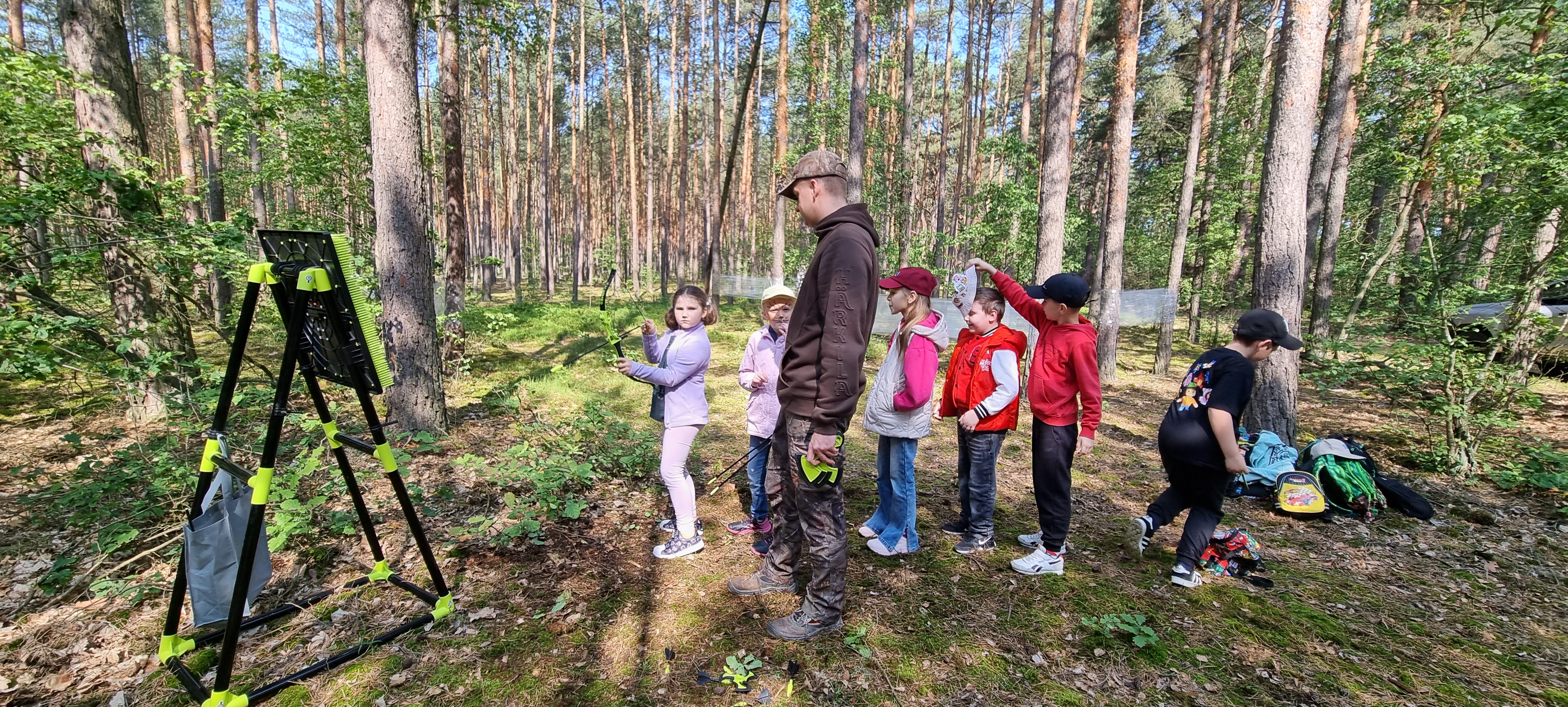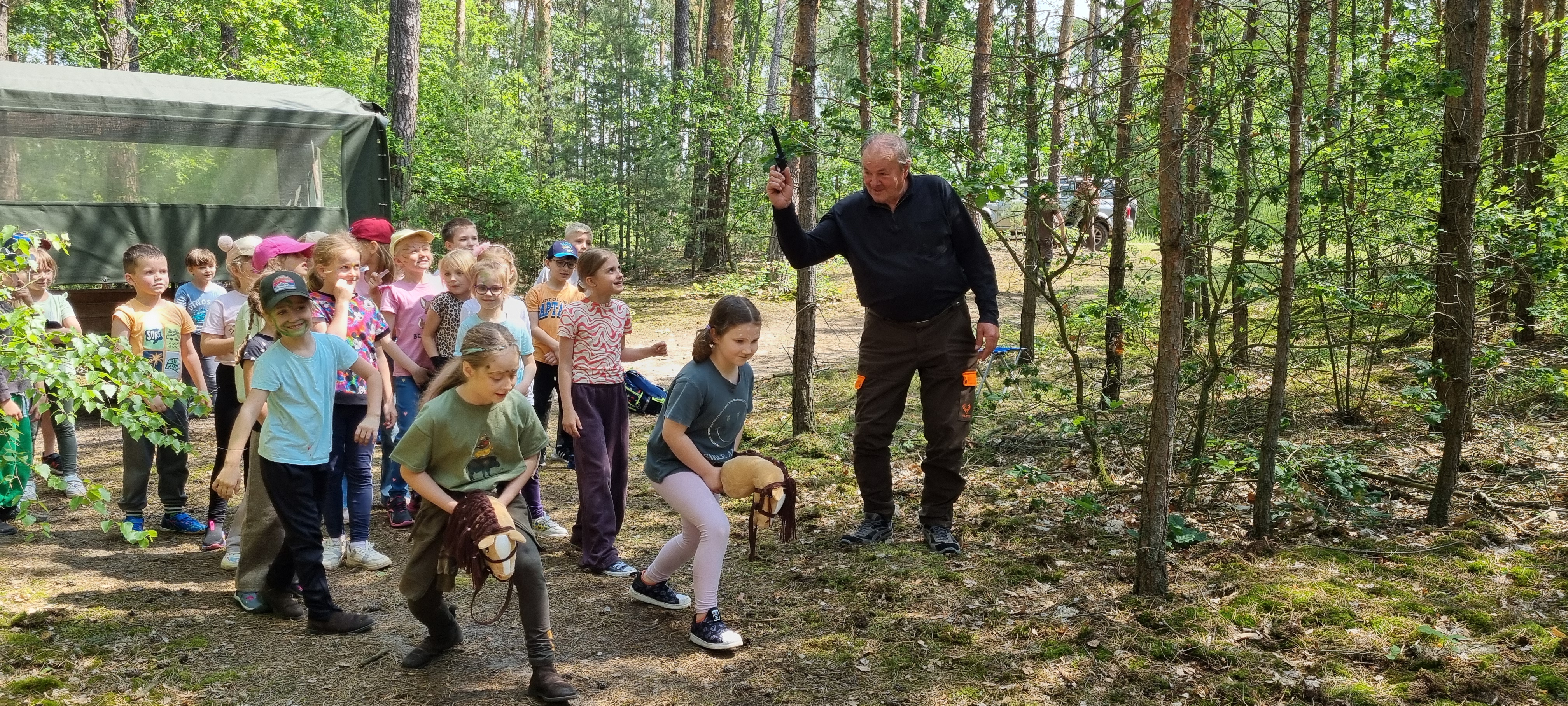 Dla dzieci przygotowano wiele atrakcji. Już od samego początku ogromną frajdę sprawiła uczniom podróż myśliwskim wozem, który dowiózł wszystkich do docelowego miejsca w lesie, gdzie na uczestników czekały różnorodne stacje aktywności: strzelanie z łuku, mecze piłki nożnej na leśnej polanie, malowanie buziek oraz emocjonujące poszukiwania poroży jeleni i tropów dzikich zwierząt. Dzieci brały także udział w „polowaniu na kaczki” – oczywiście była to zabawa z użyciem miękkiej maskotki kaczki, która uczyła spostrzegawczości i pokazała, że obserwator przyrody musi być cierpliwy i wytrwały. Nie zabrakło także wyścigów Hobby horsing i malowania na folii tego, co udało się zaobserwować w lesie.