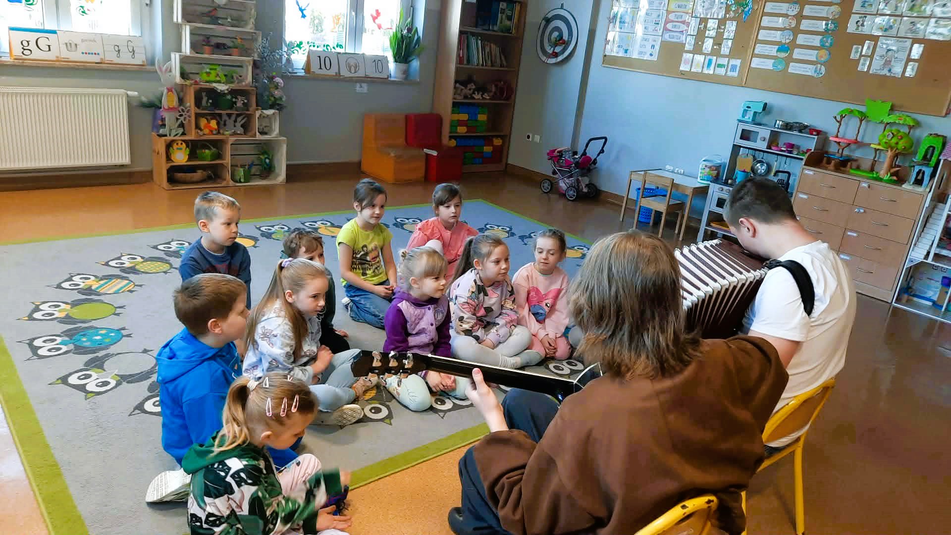 To jednak nie wszystko – uczniowie przygotowywali również różnorodne zabawy, które rozwijały wyobraźnię i integrowały grupę. Szczególną atrakcją były wspólne muzykowanie i zabawy rytmiczne. Dźwięki instrumentów, śpiew oraz spontaniczna radość tworzyły niepowtarzalny klimat, który na długo pozostawał w pamięci najmłodszych.