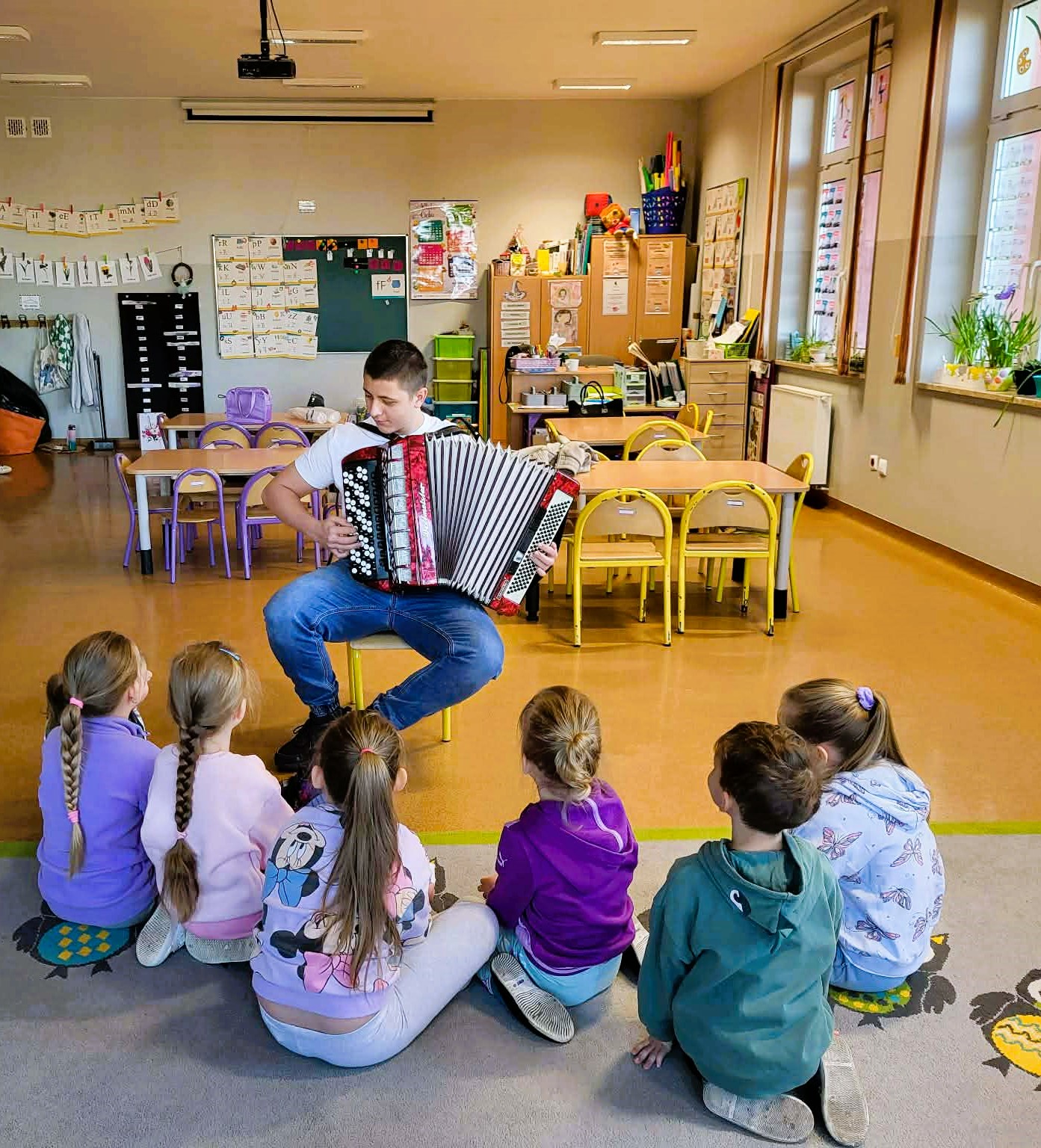 W ciągu całego roku szkolnego uczniowie działający w szkolnym kole wolontariatu po raz kolejny zaangażowali się w wyjątkową i niezwykle wartościową inicjatywę – cykliczną akcję „Piątkowe poranki z bajką i muzyką”, realizowaną w naszym Oddziale Przedszkolnym.