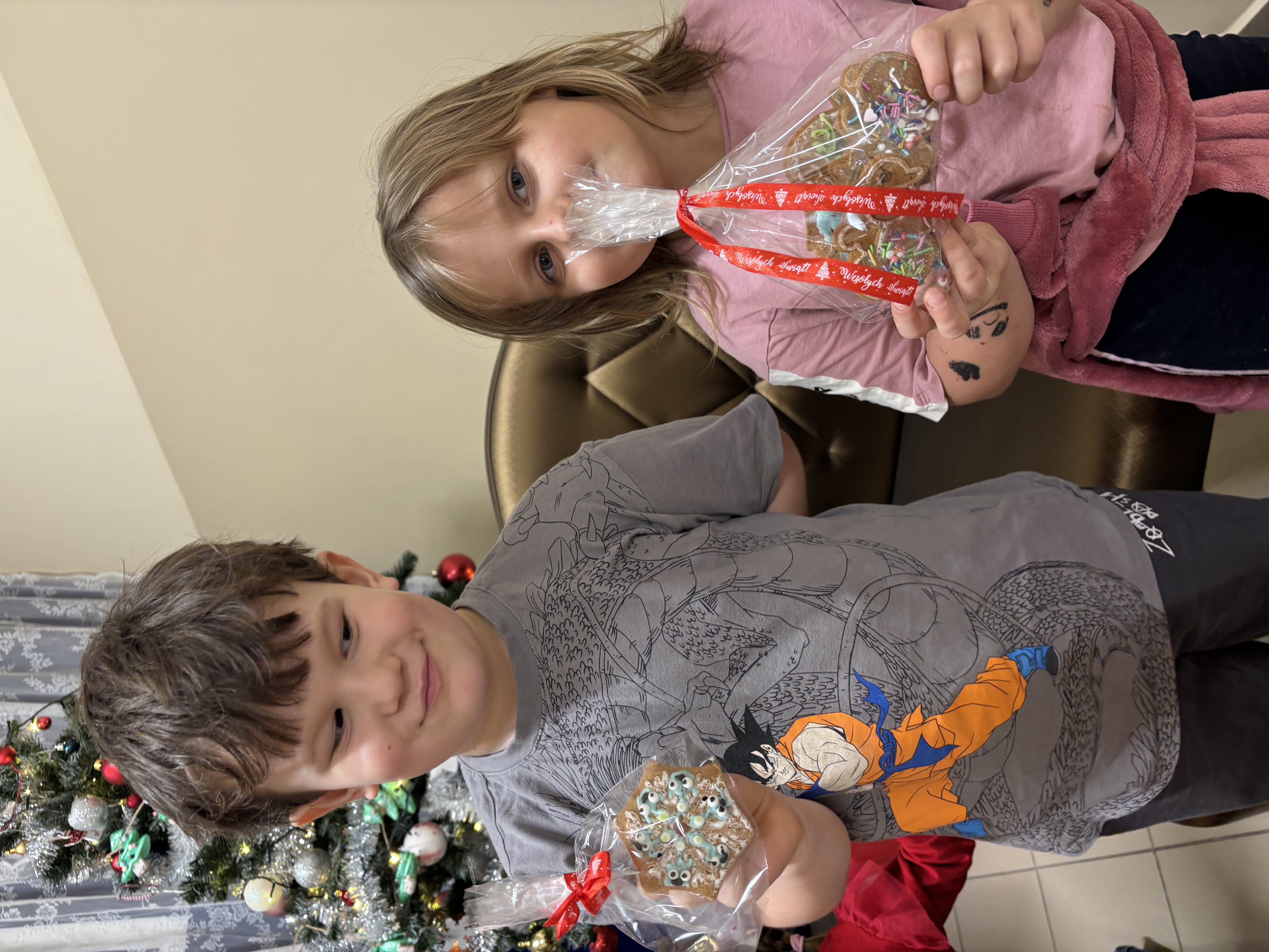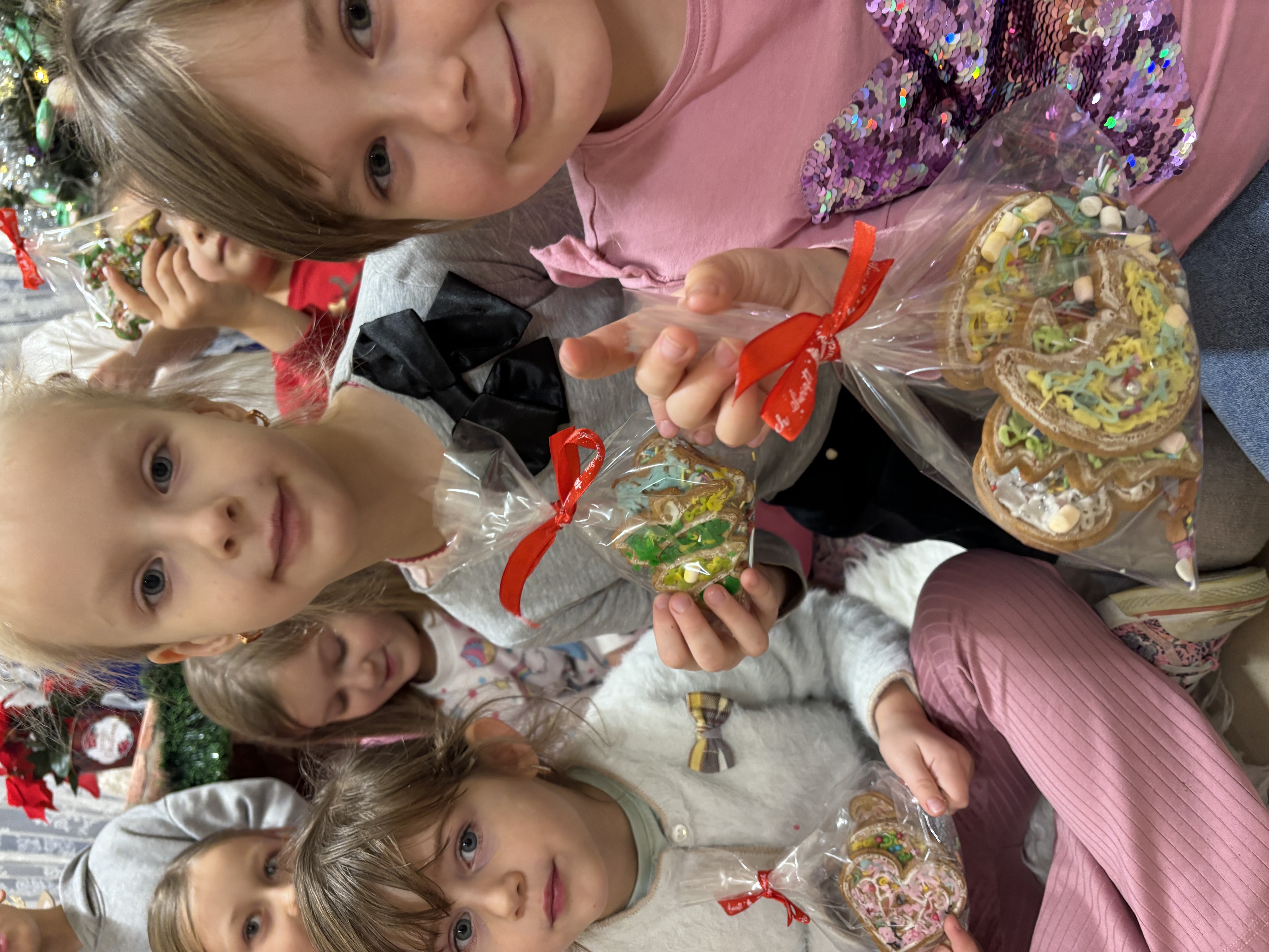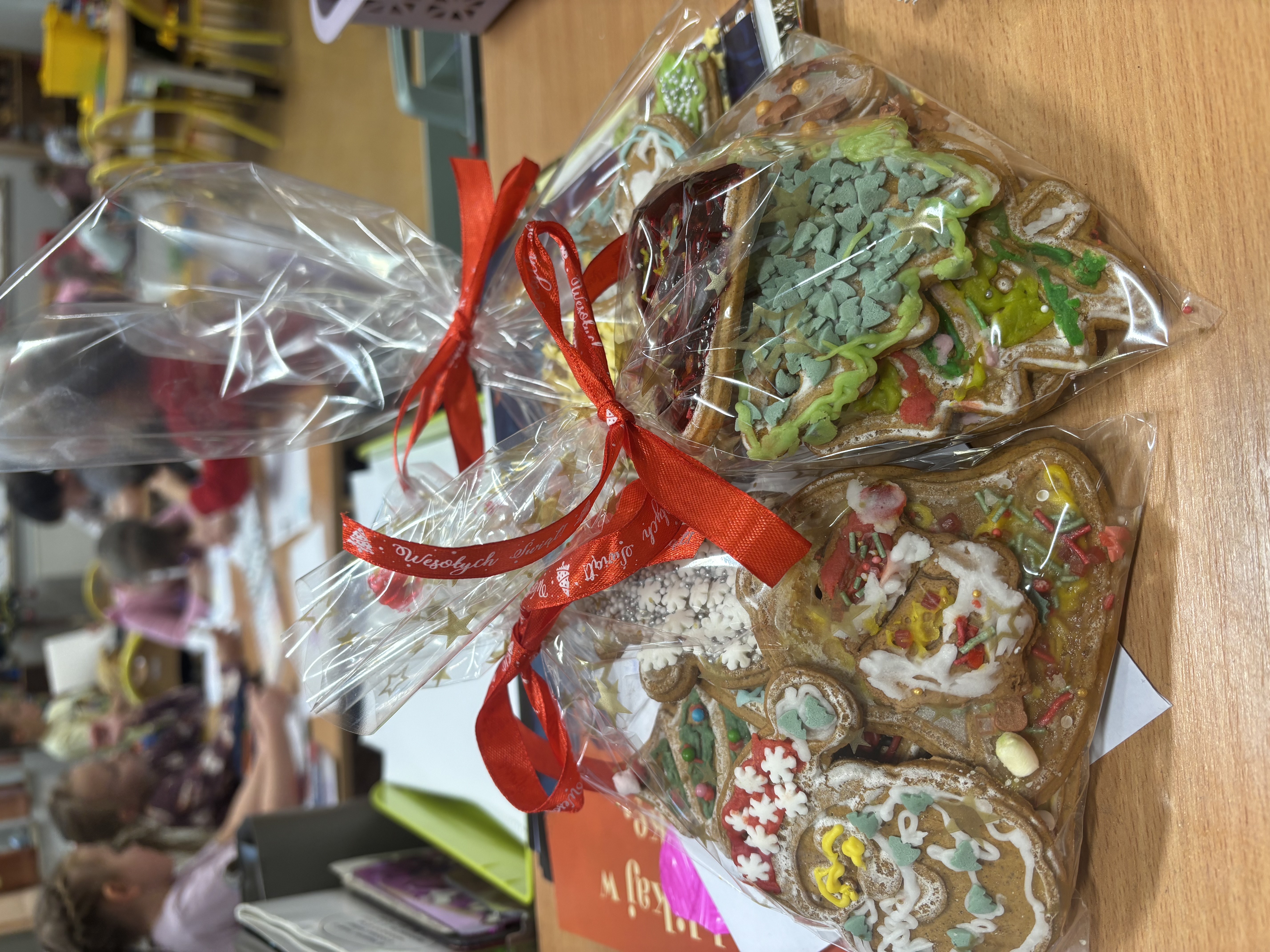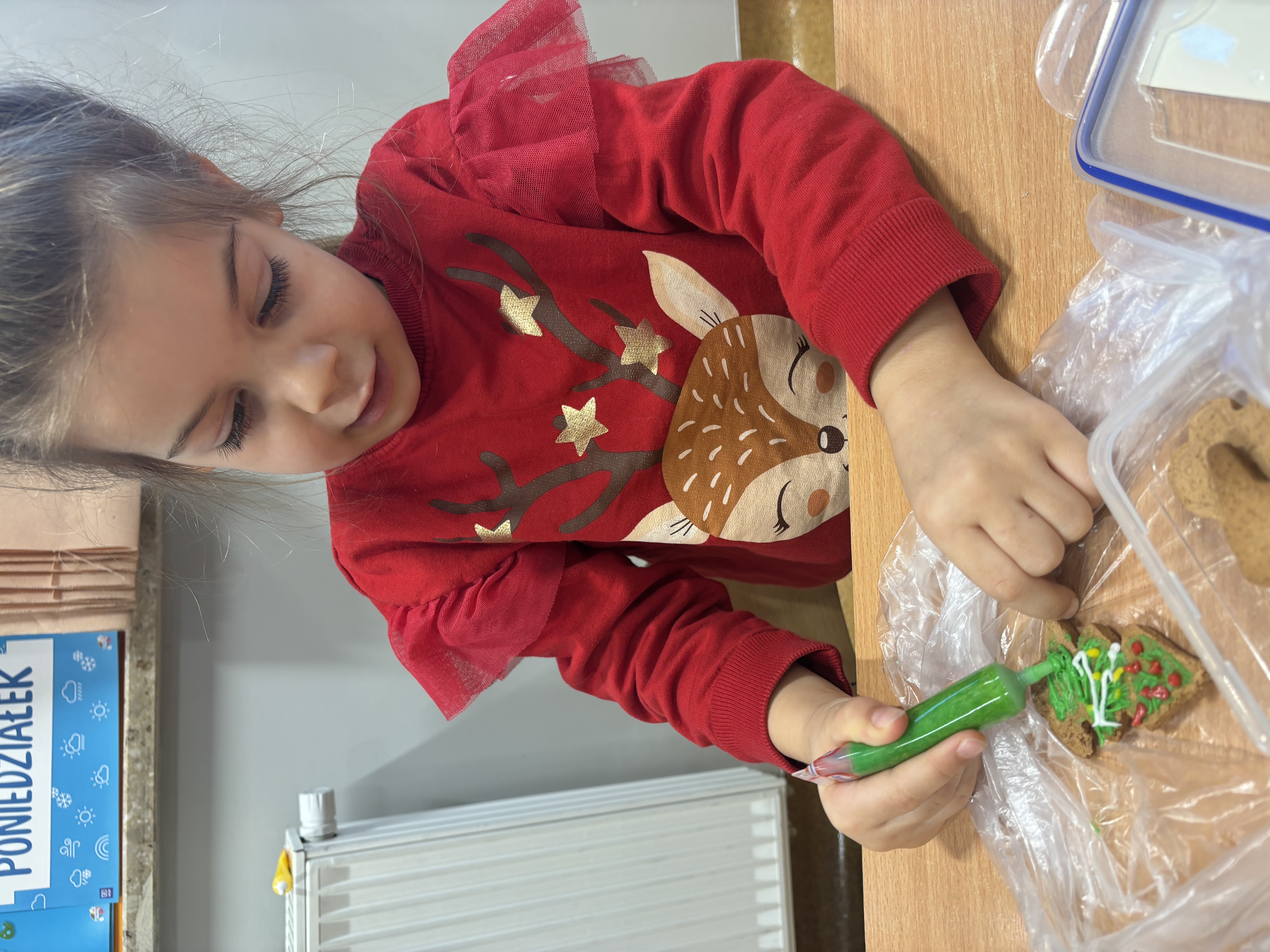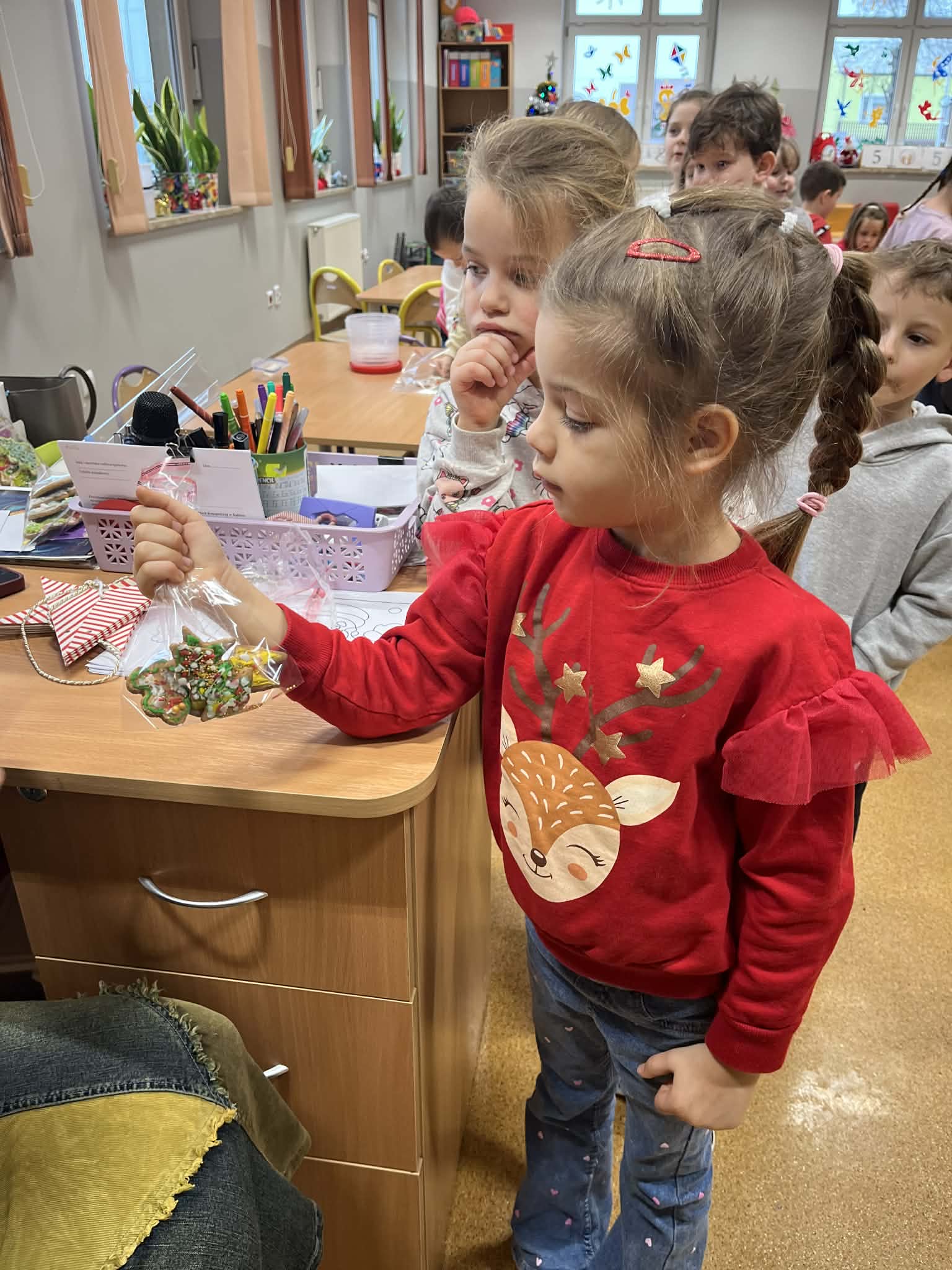 Podczas piernikowych warsztatów dzieci wybrały najładniejsze pierniczki, aby przygotować wyjątkową niespodziankę dla Świętego Mikołaja. Następnego dnia Mikołaj odwiedził grupę, z radością przyjął słodki upominek, a w podziękowaniu wręczył dzieciom piękne prezenty. To były dwa dni pełne magii, zapachu pierników i świątecznej radości!