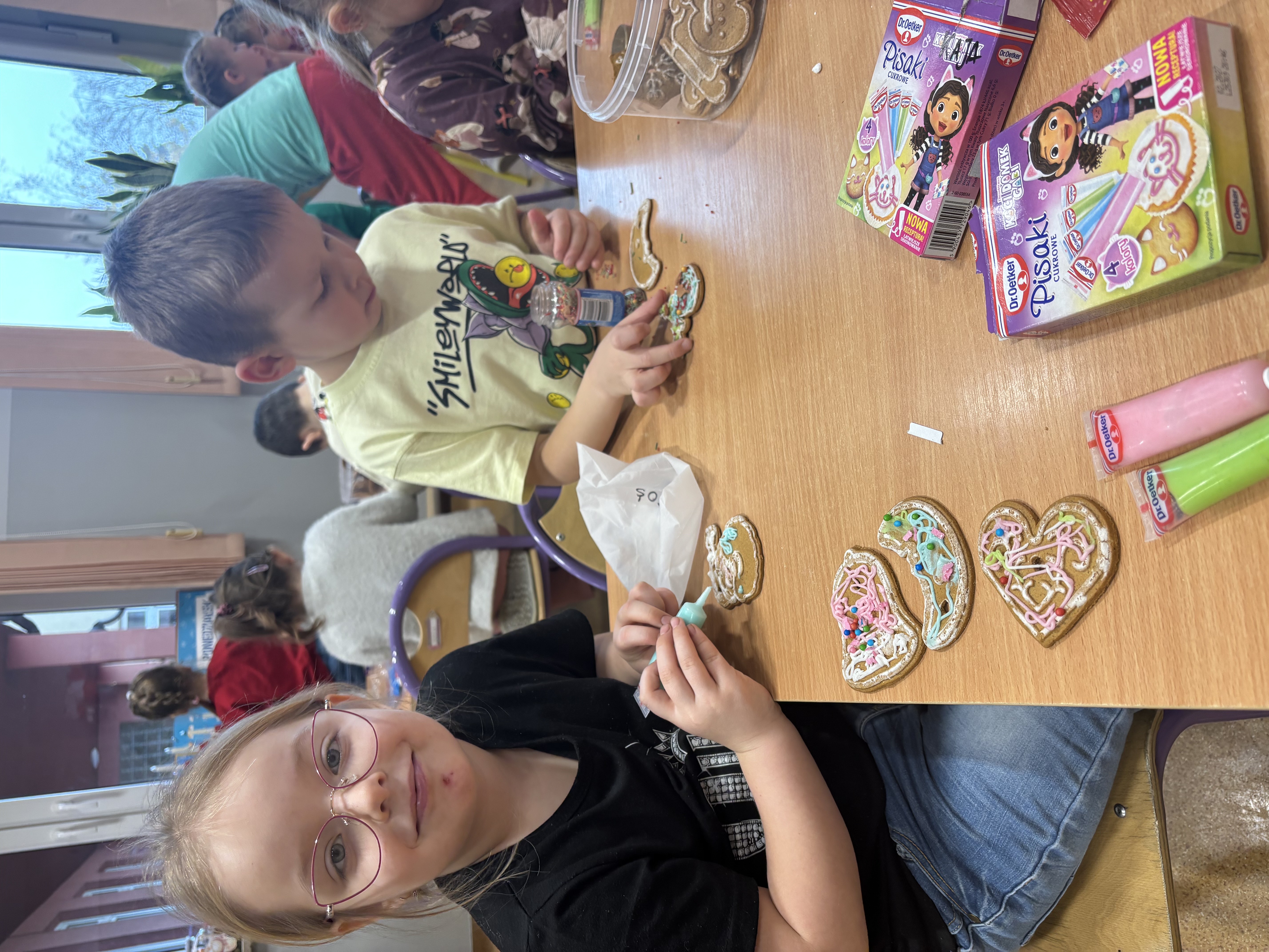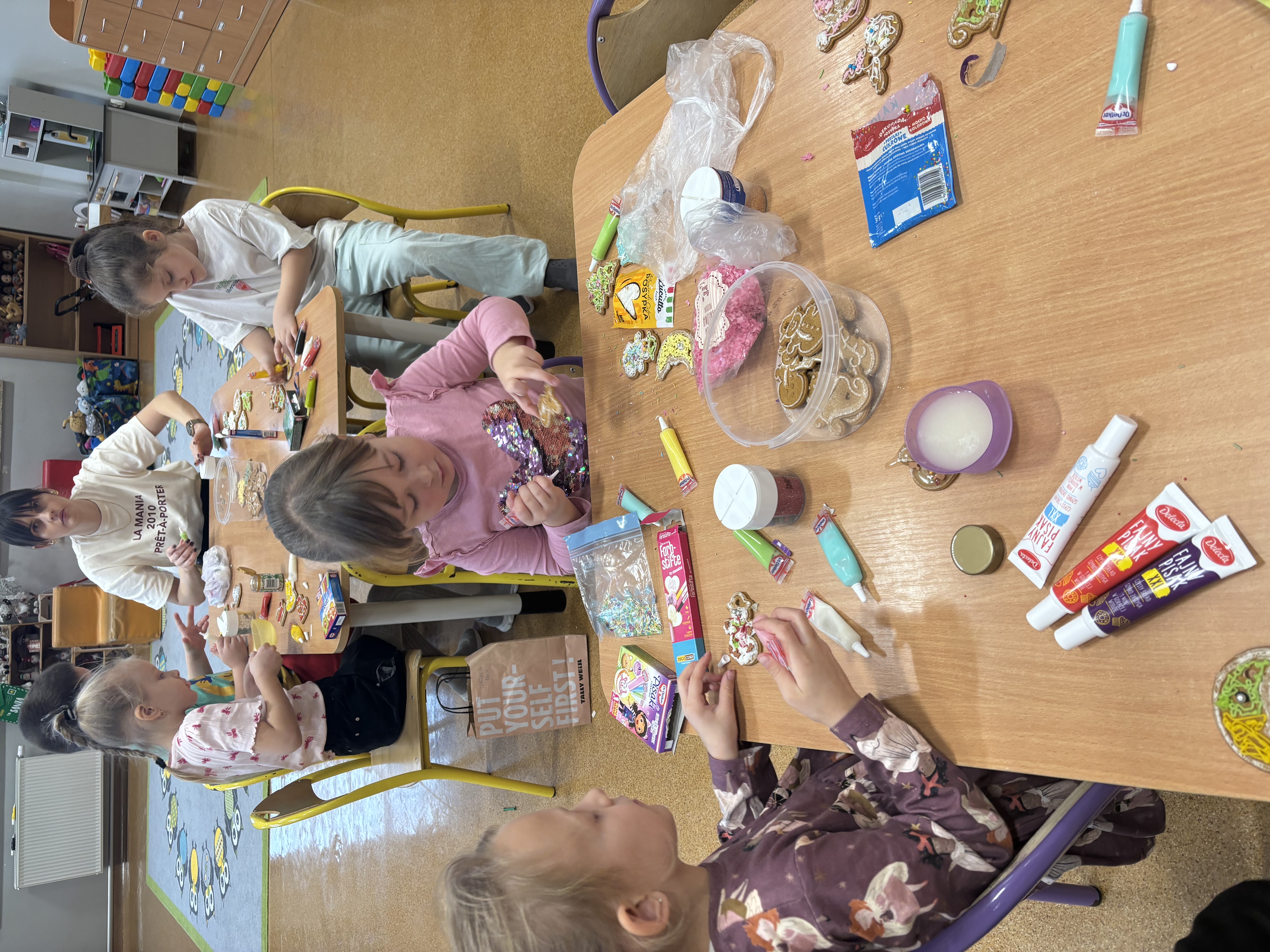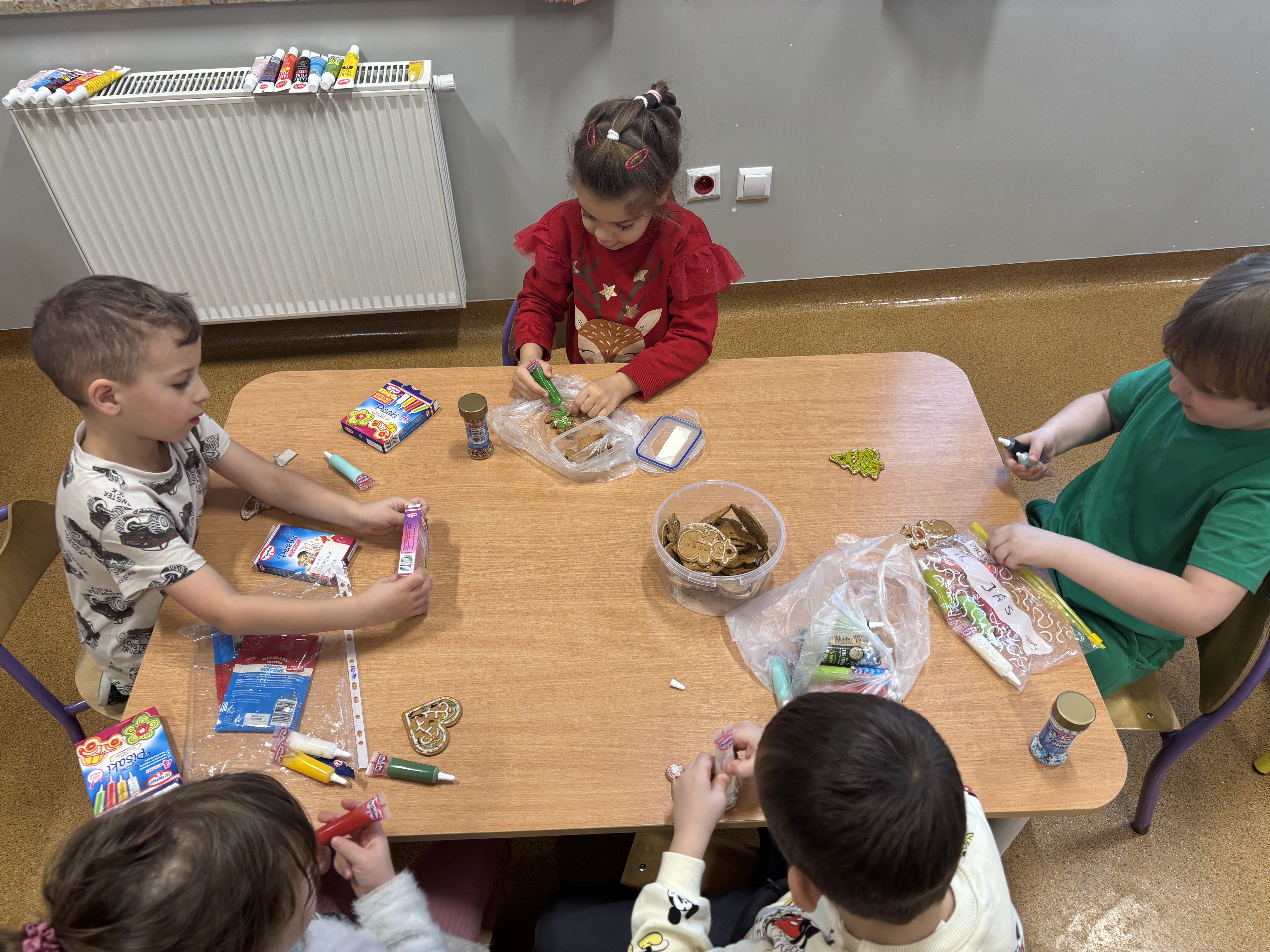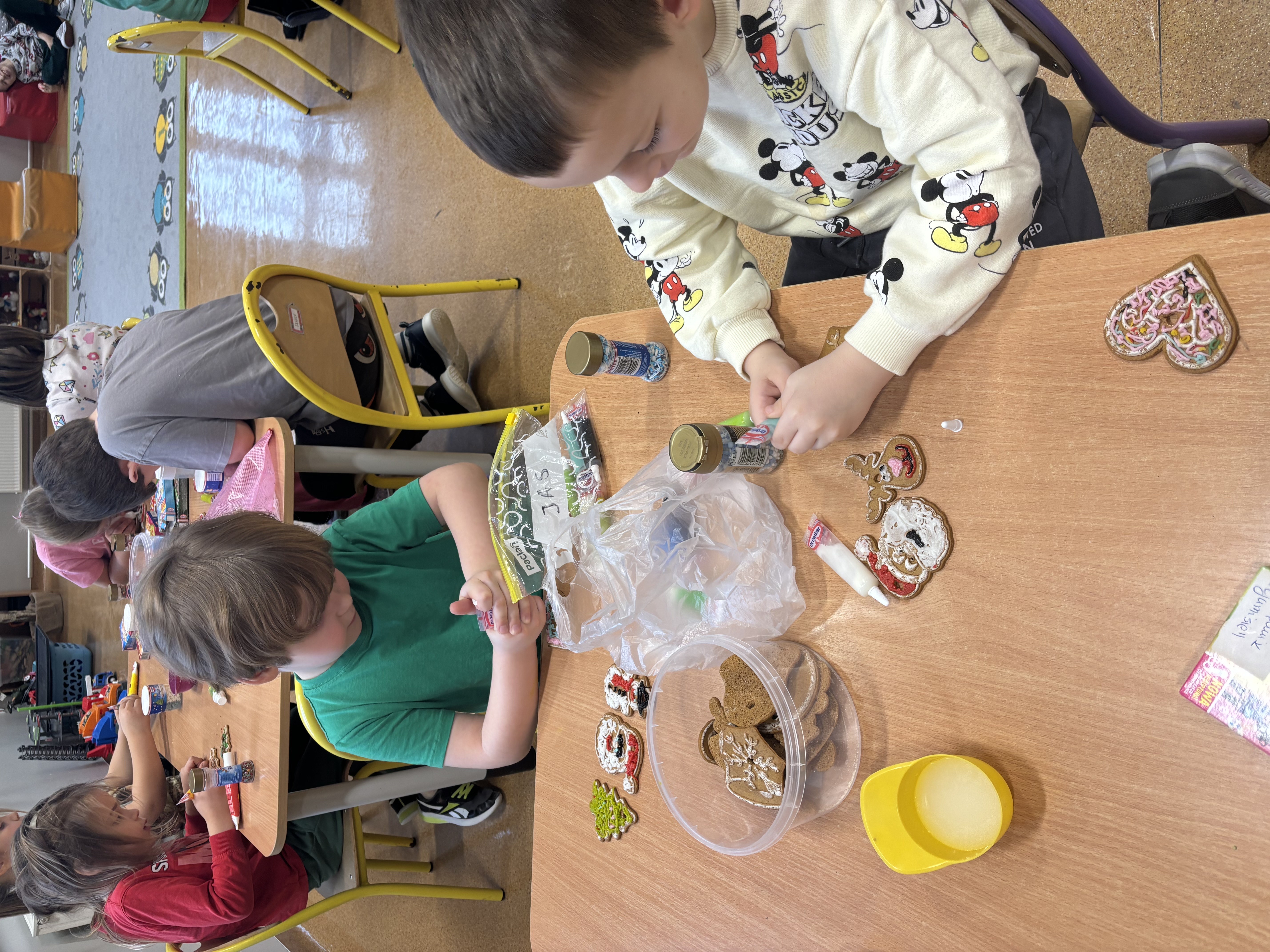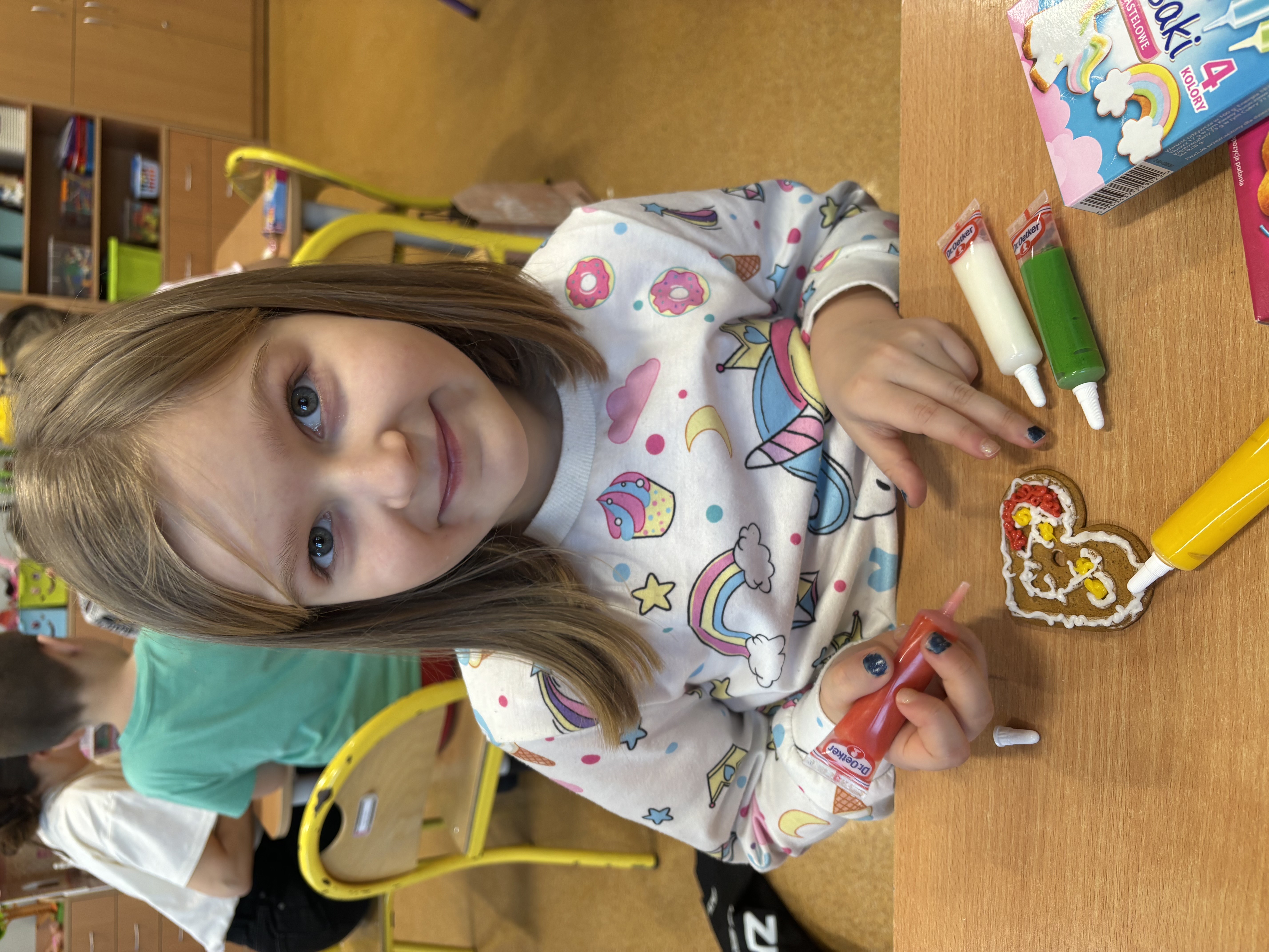 Podczas piernikowych warsztatów dzieci wybrały najładniejsze pierniczki, aby przygotować wyjątkową niespodziankę dla Świętego Mikołaja. Następnego dnia Mikołaj odwiedził grupę, z radością przyjął słodki upominek, a w podziękowaniu wręczył dzieciom piękne prezenty. To były dwa dni pełne magii, zapachu pierników i świątecznej radości!