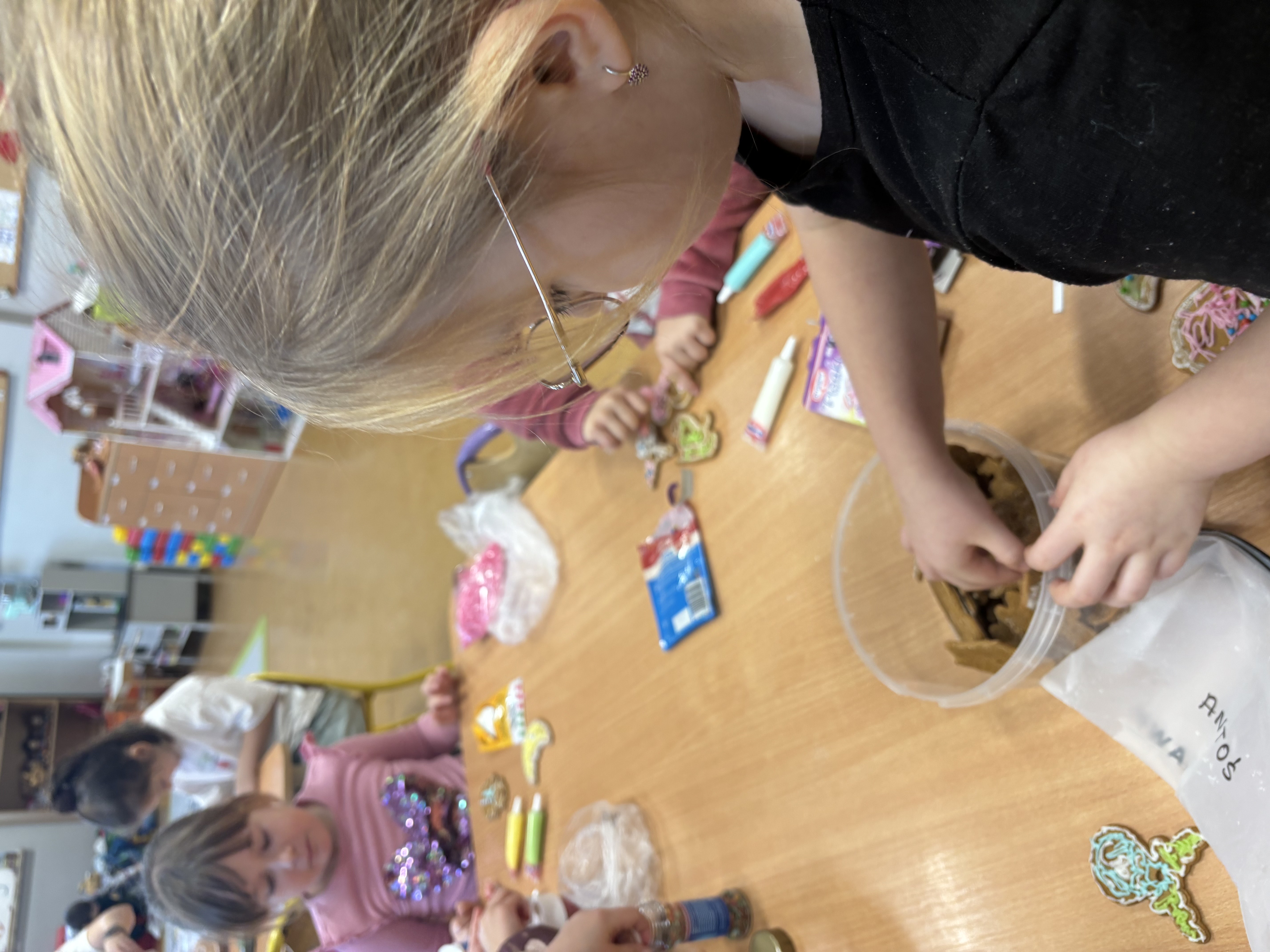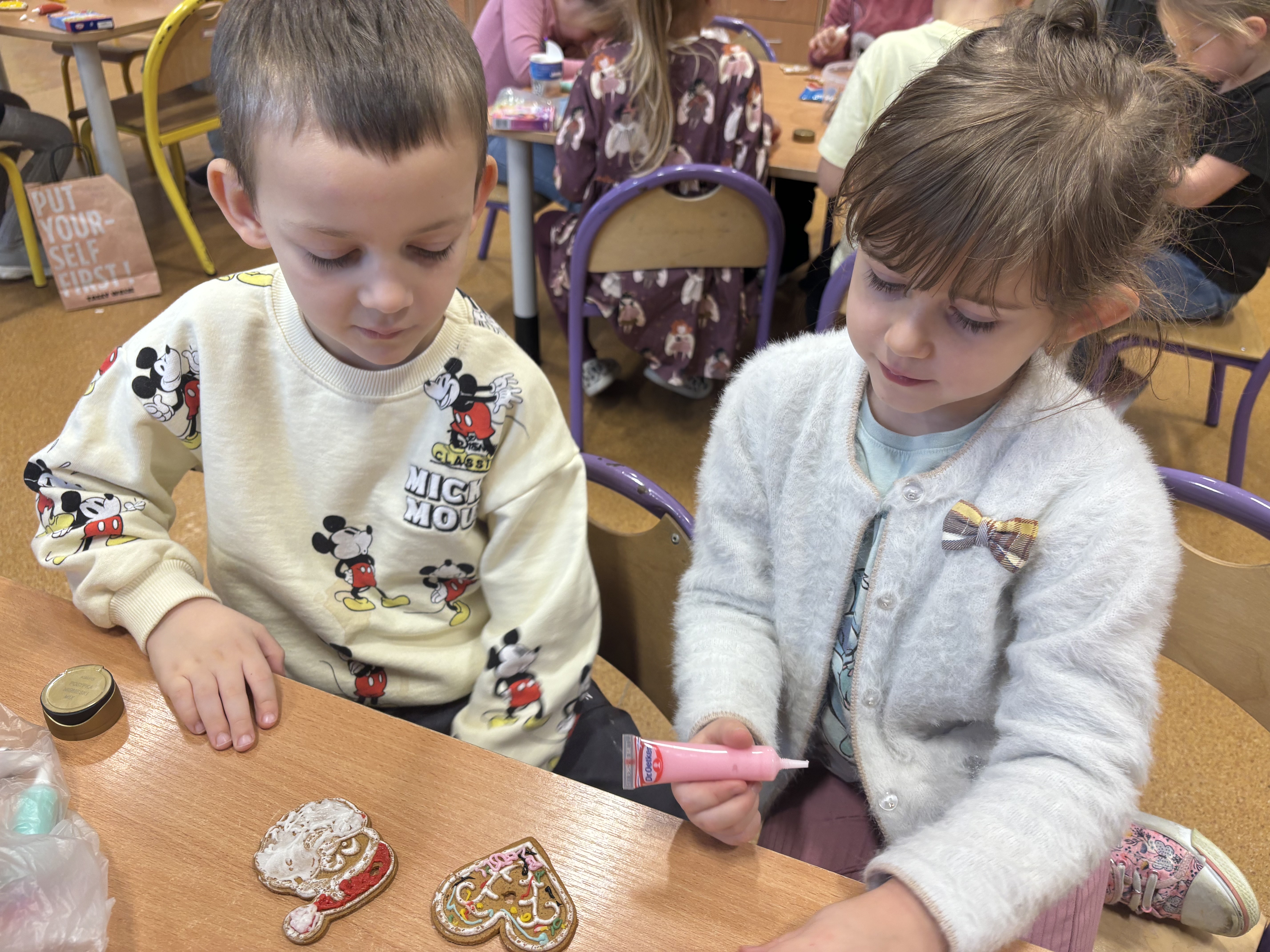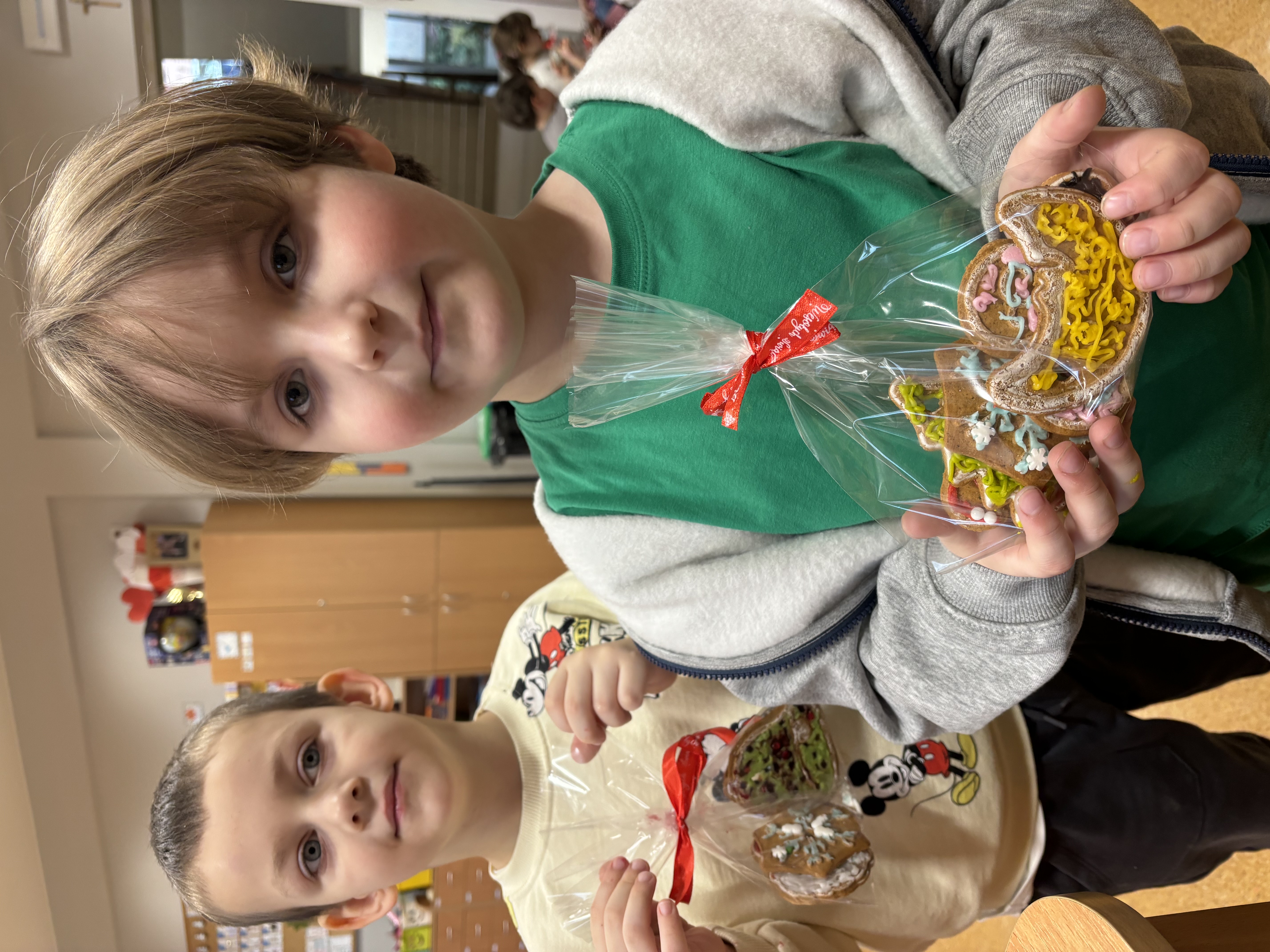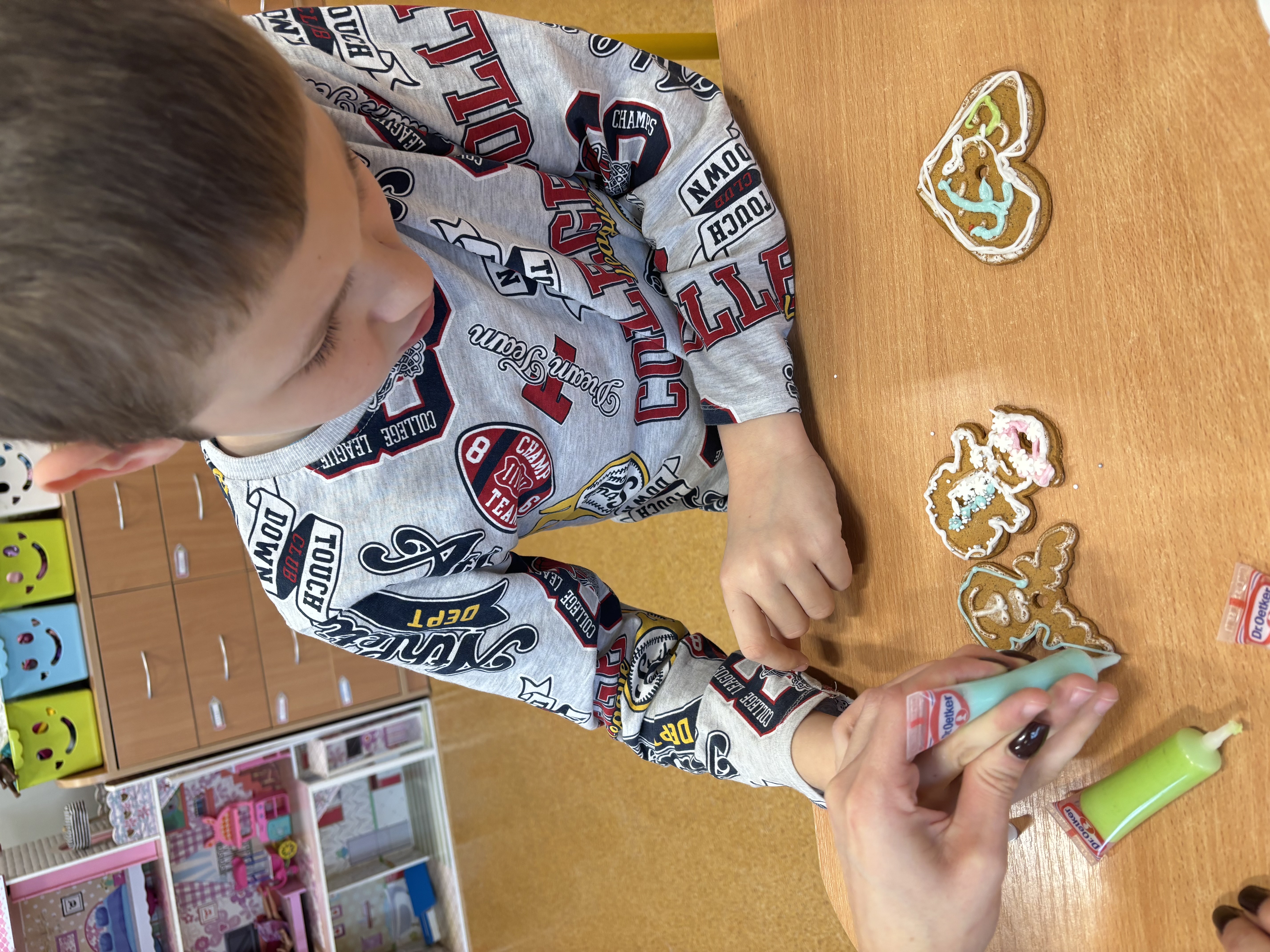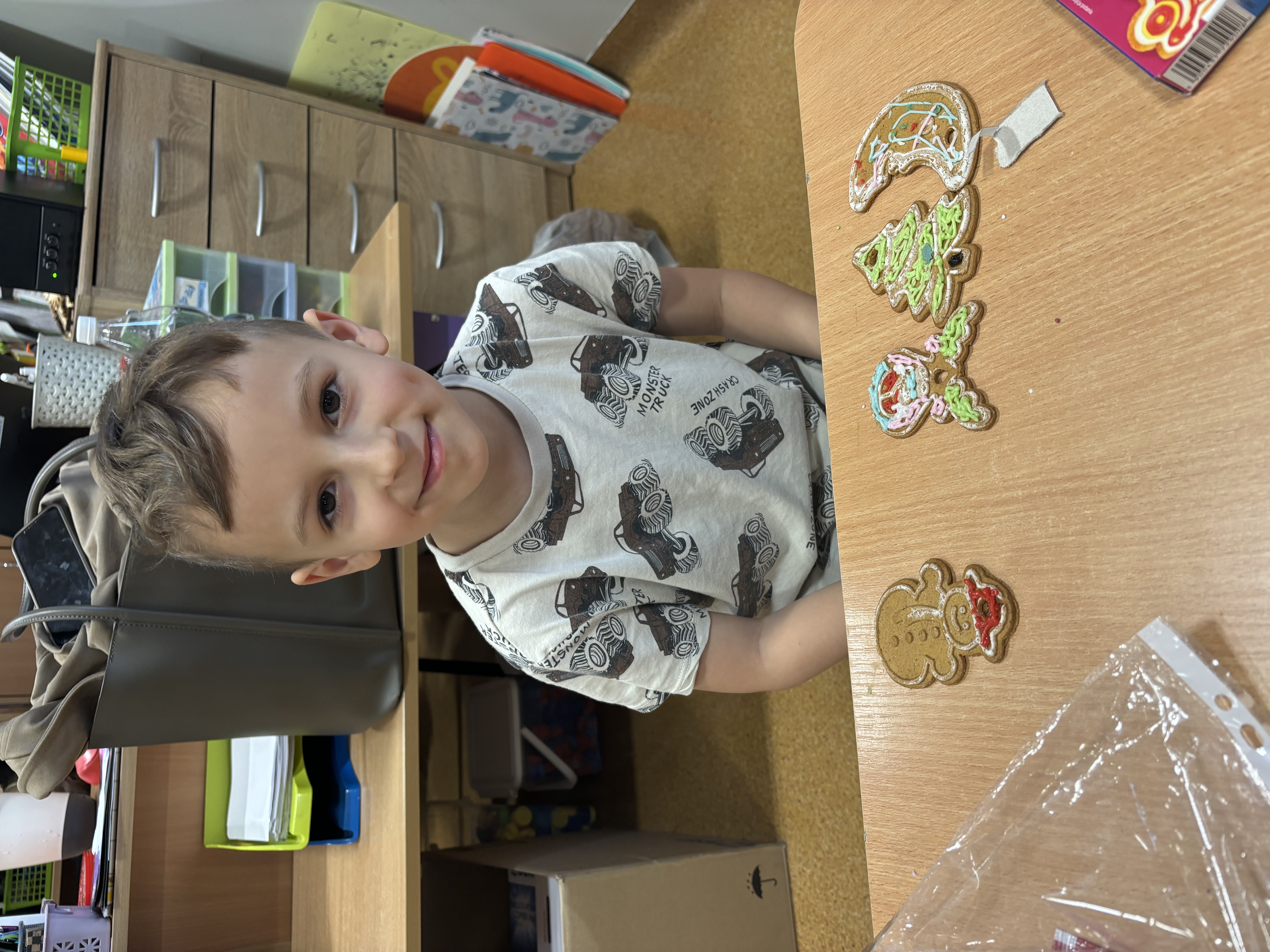 Podczas piernikowych warsztatów dzieci wybrały najładniejsze pierniczki, aby przygotować wyjątkową niespodziankę dla Świętego Mikołaja. Następnego dnia Mikołaj odwiedził grupę, z radością przyjął słodki upominek, a w podziękowaniu wręczył dzieciom piękne prezenty. To były dwa dni pełne magii, zapachu pierników i świątecznej radości!