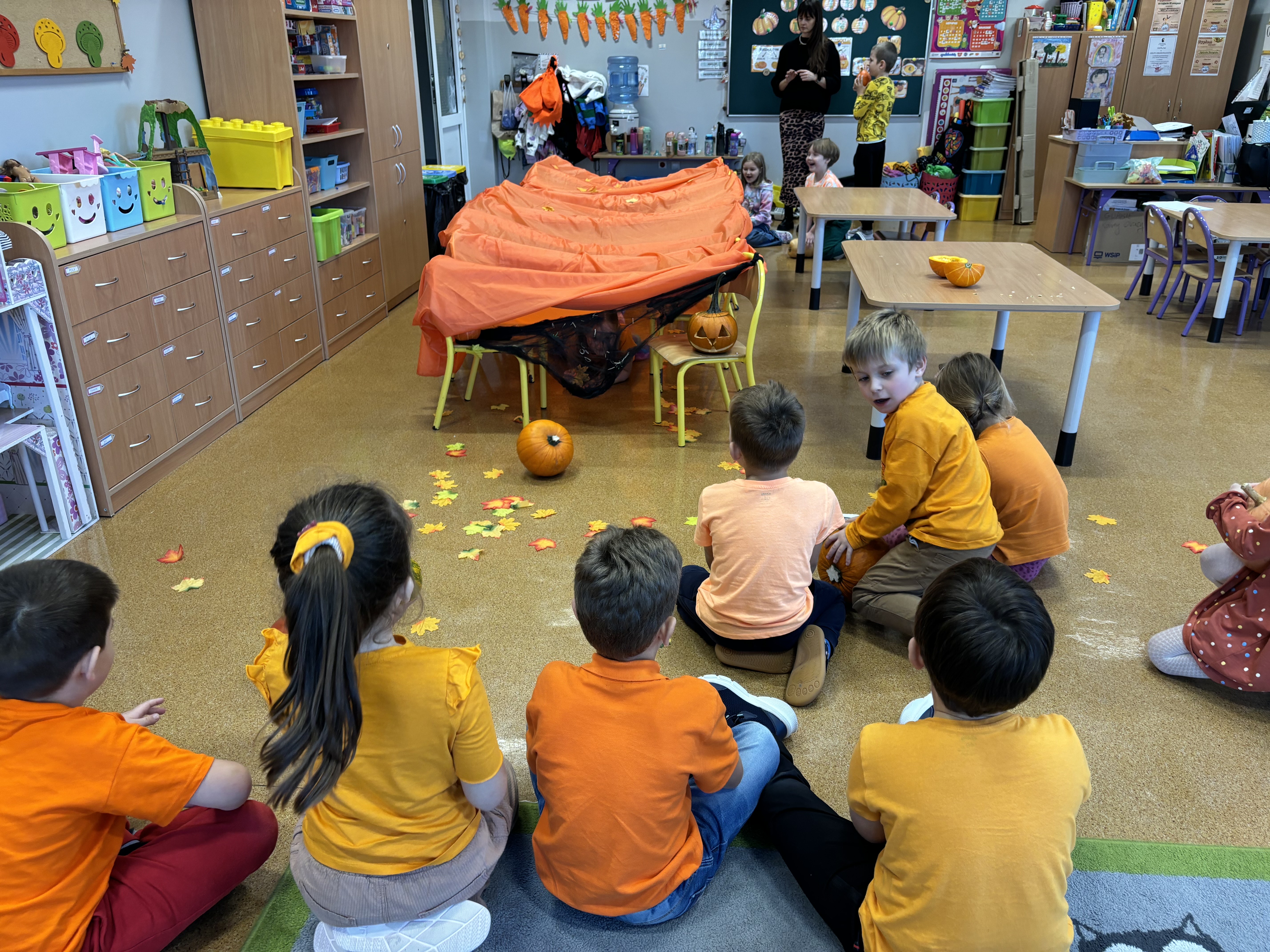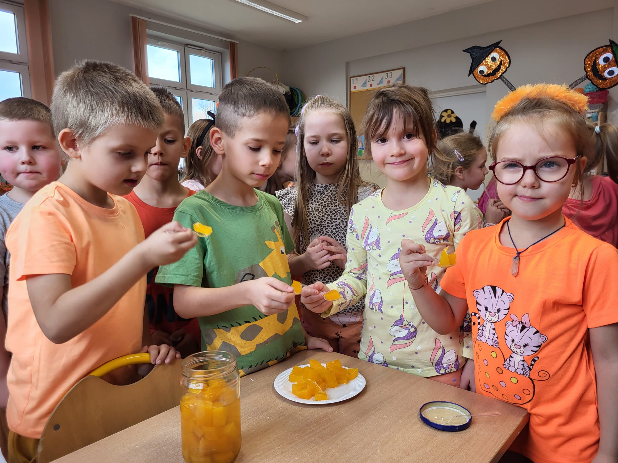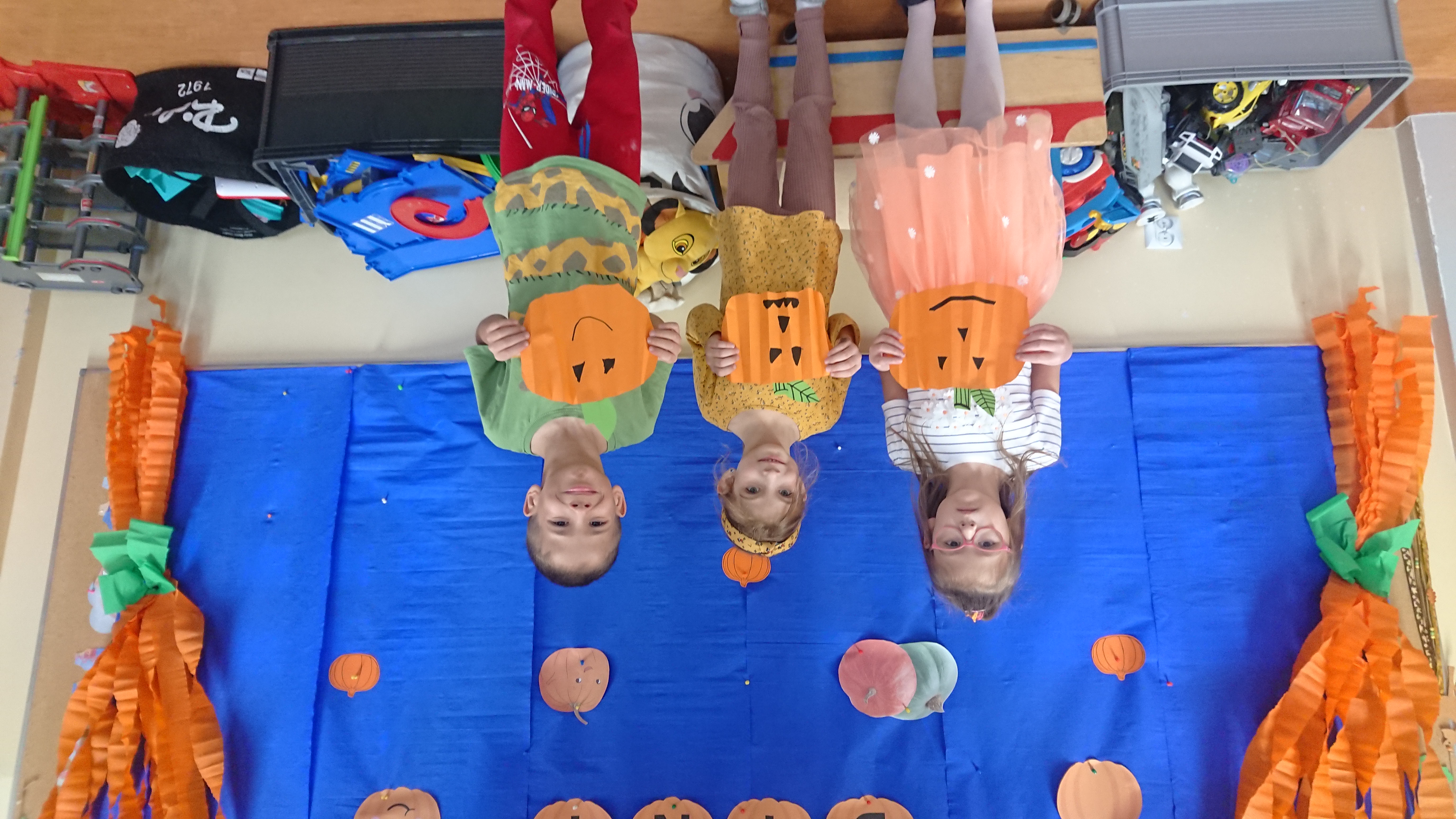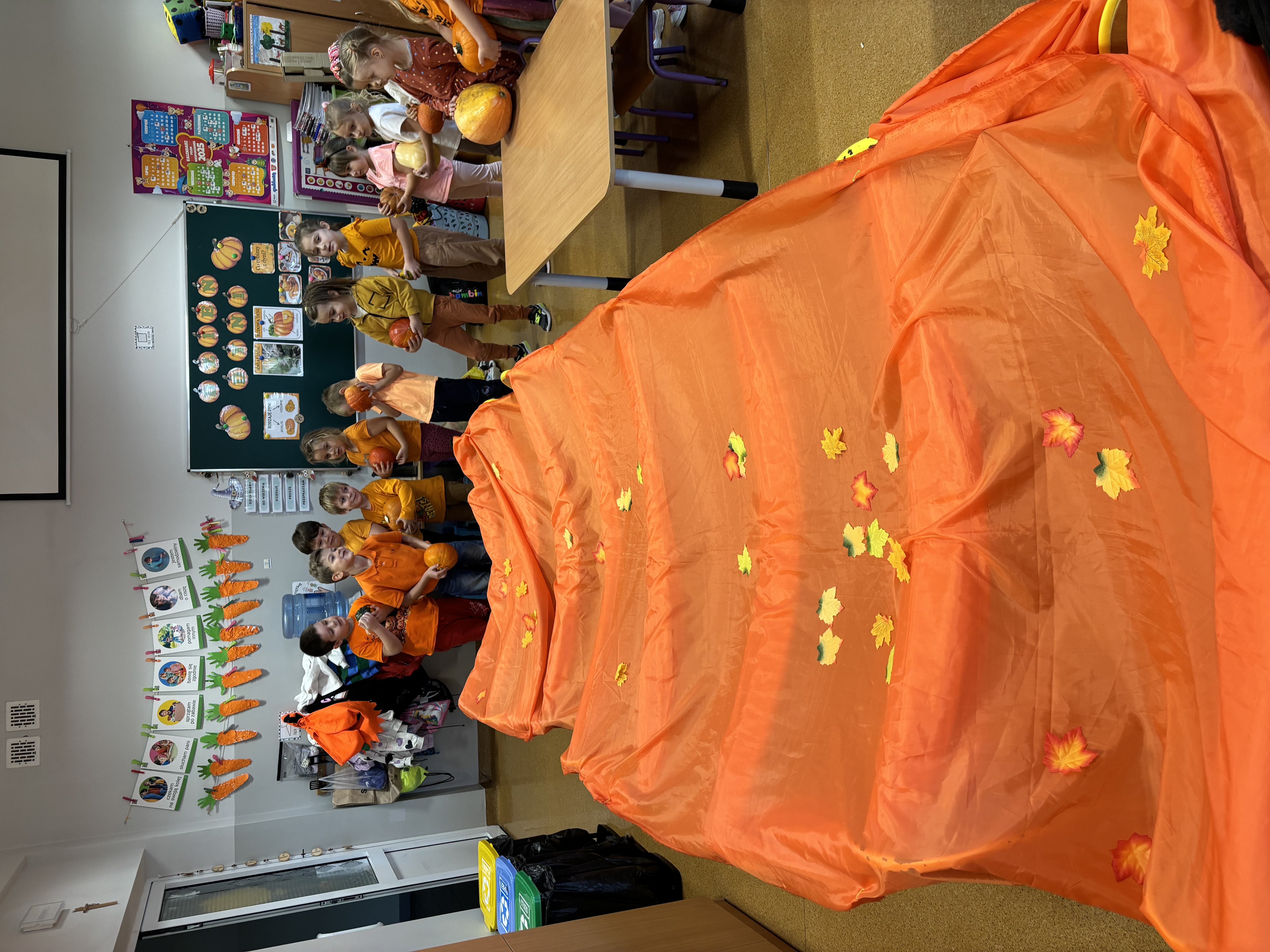 W naszym oddziale obchodziliśmy wyjątkowe, jesienne święto – Dzień Dyni. Tego dnia już od rana w salach panował prawdziwie pomarańczowy nastrój! Dzieci przyszły ubrane w stroje w odcieniach pomarańczu i żółci, a przedszkole zamieniło się w bajkową krainę pełną dyniowych dekoracji.