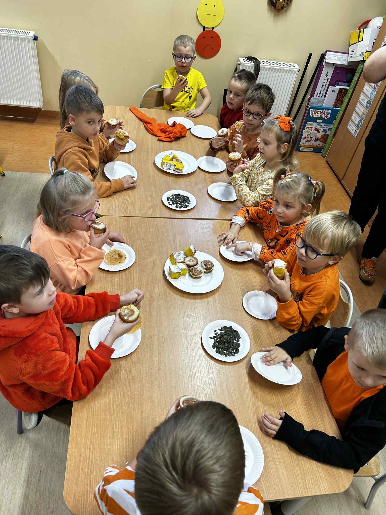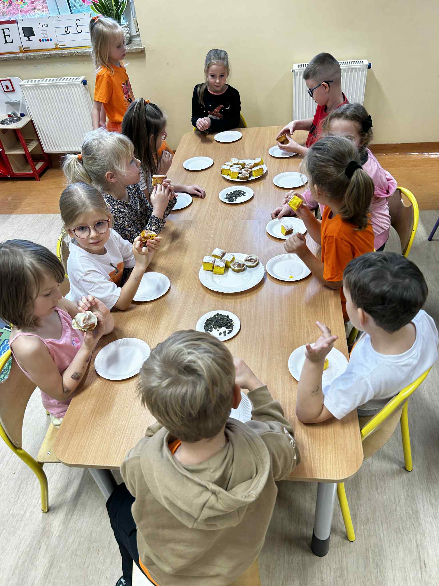 Dzieci miały okazję poznać kulinarne zastosowanie dyni. Dowiedziały się, że dynia służy nie tylko do dekoracji, ale również można z niej przygotować pyszne potrawy np. zupę dyniową, powidła. Mieliśmy okazję spróbować ciasta dyniowego oraz babeczek z dynią w roli głównej. Za dyniowe słodkości dziękujemy Rodzicom ❤️