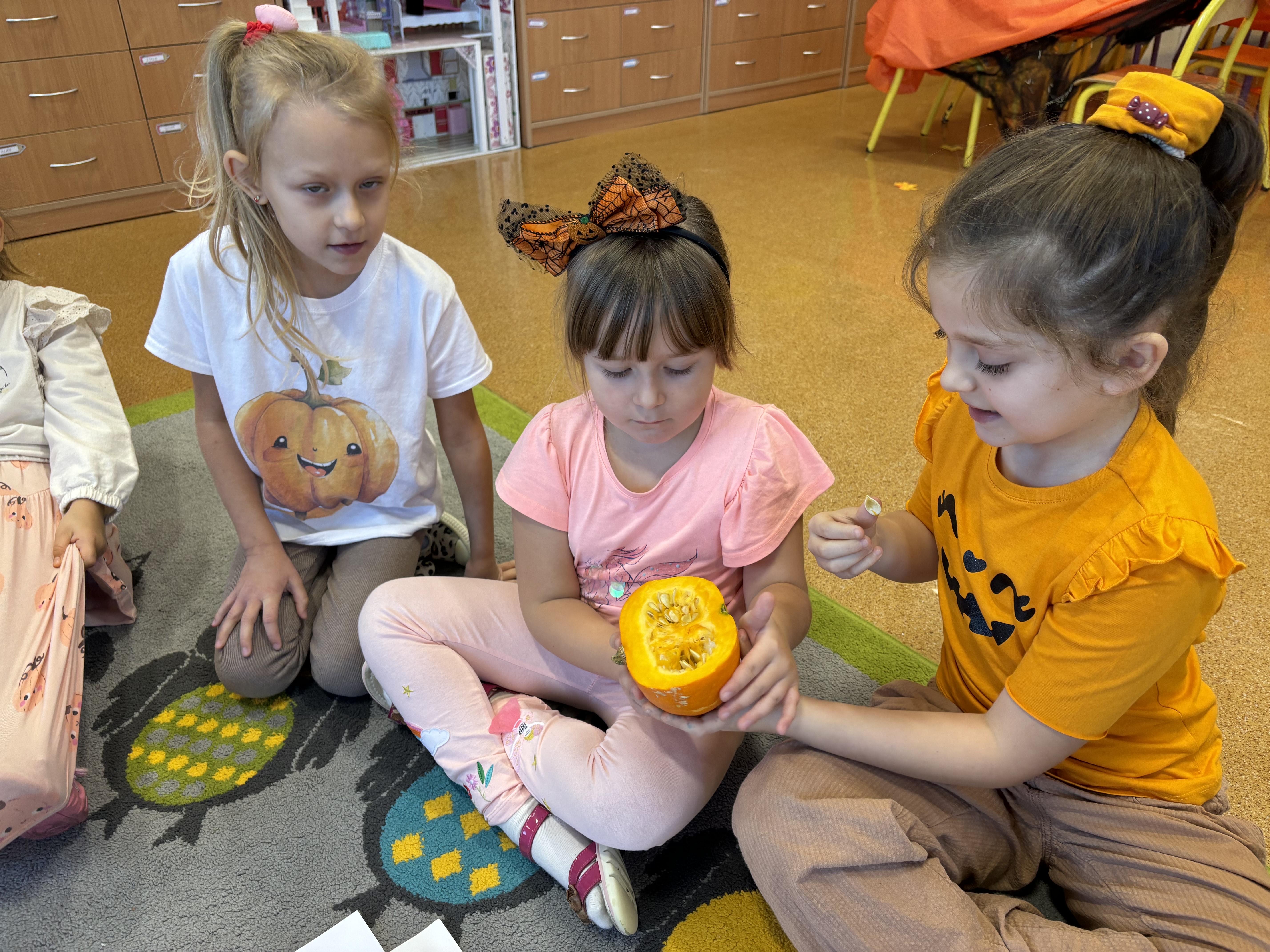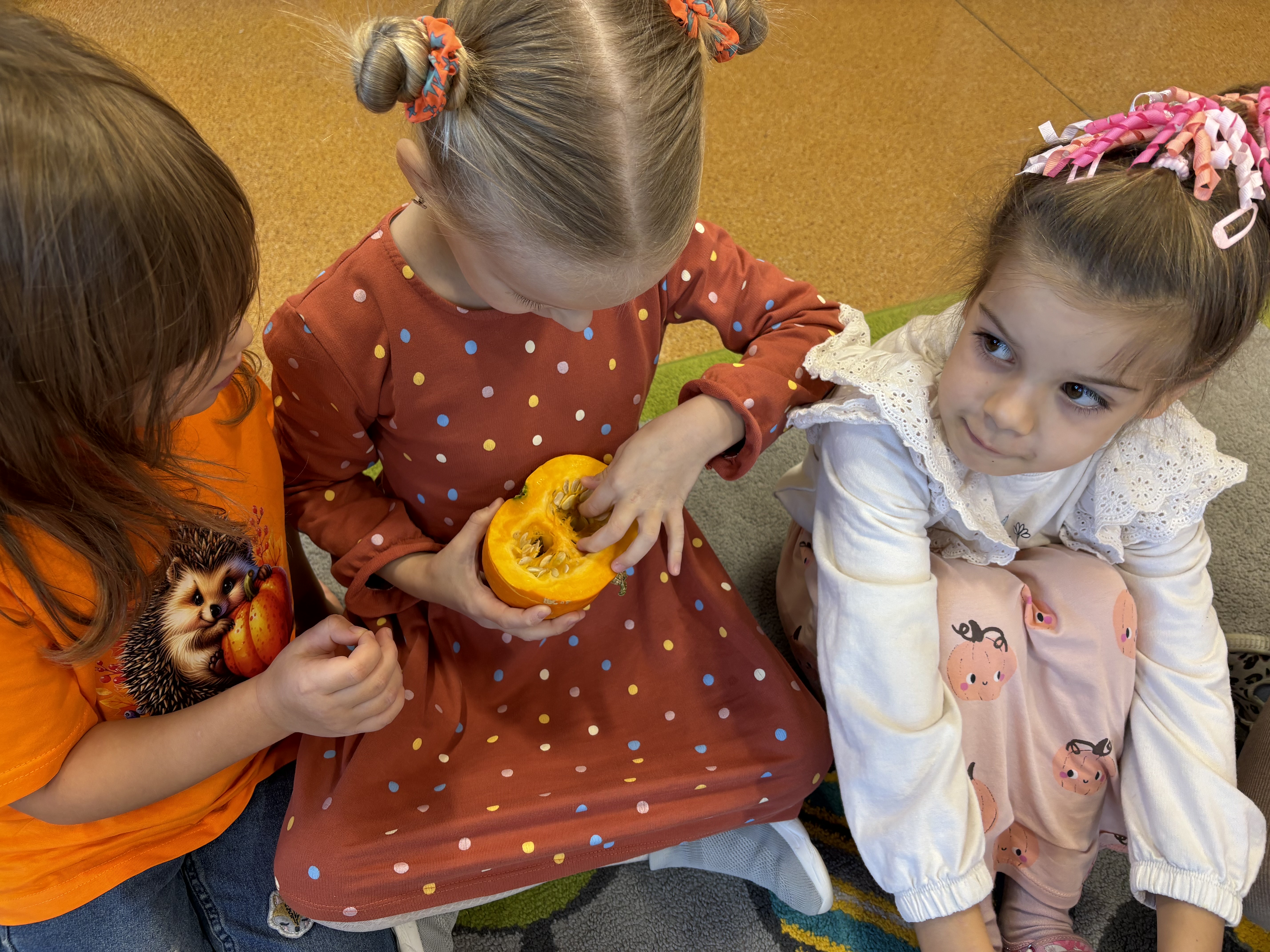 Na początku dnia przedszkolaki wysłuchały ciekawostek o dyniach – dowiedziały się, jak rośnie dynia, jakie ma odmiany i dlaczego jest taka zdrowa. Wspólnie oglądaliśmy prawdziwe dynie, porównywaliśmy ich kształty, kolory i rozmiary. Dzieci miały okazję dotknąć, powąchać, a nawet zajrzeć do środka tej niezwykłej rośliny.