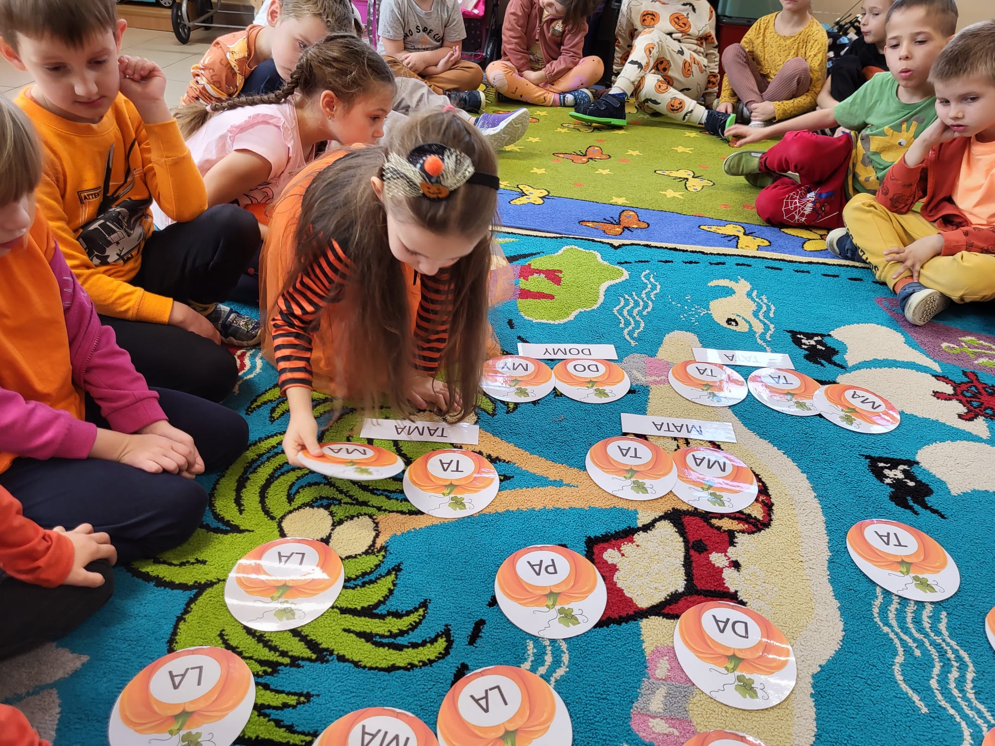 Kolejnym punktem programu były zabawy ruchowe i konkurencje z dynią w roli głównej. Było mnóstwo śmiechu i dobrej zabawy! Nie obyło się też bez dyniowych zabaw z muzyką.