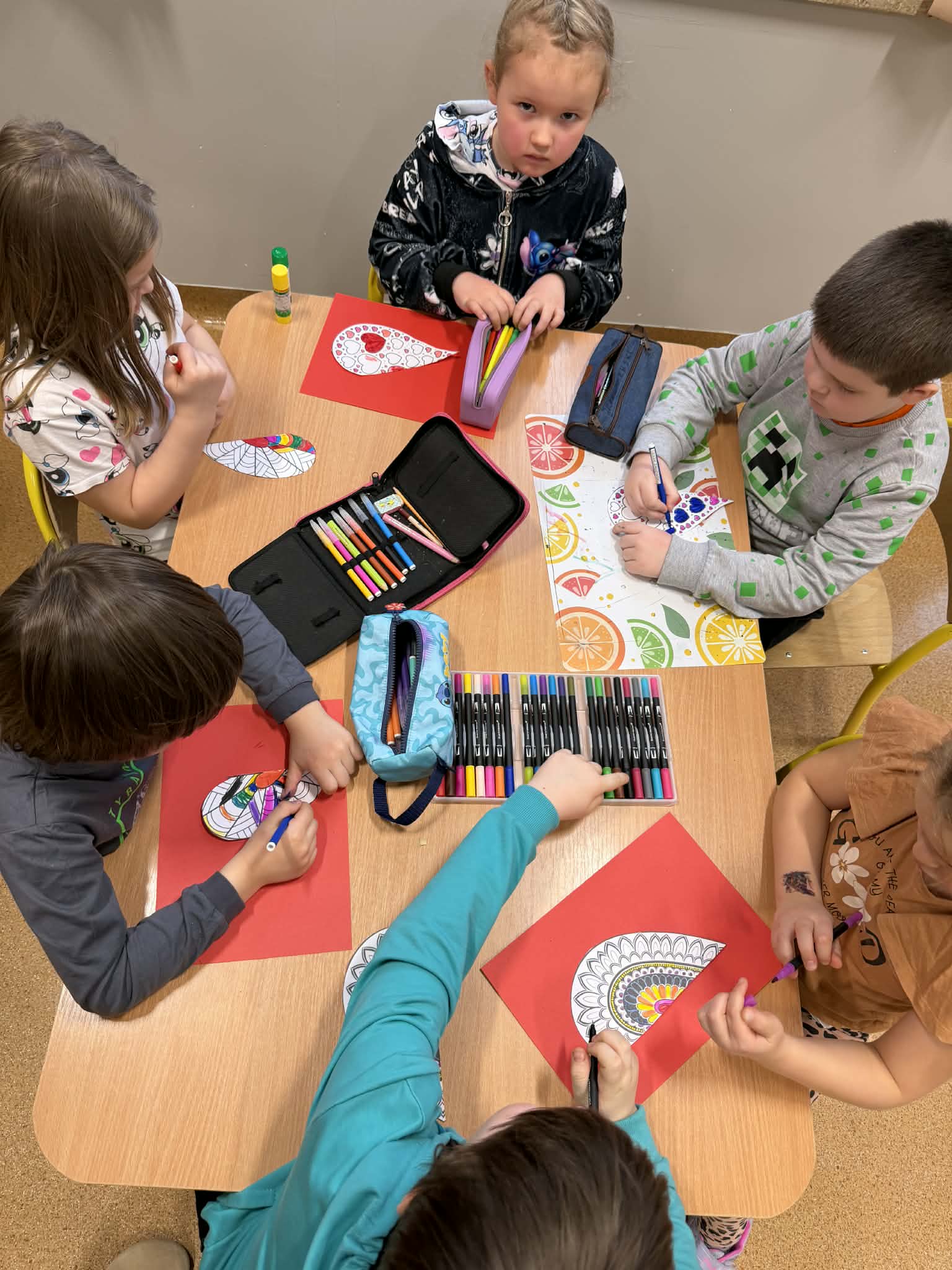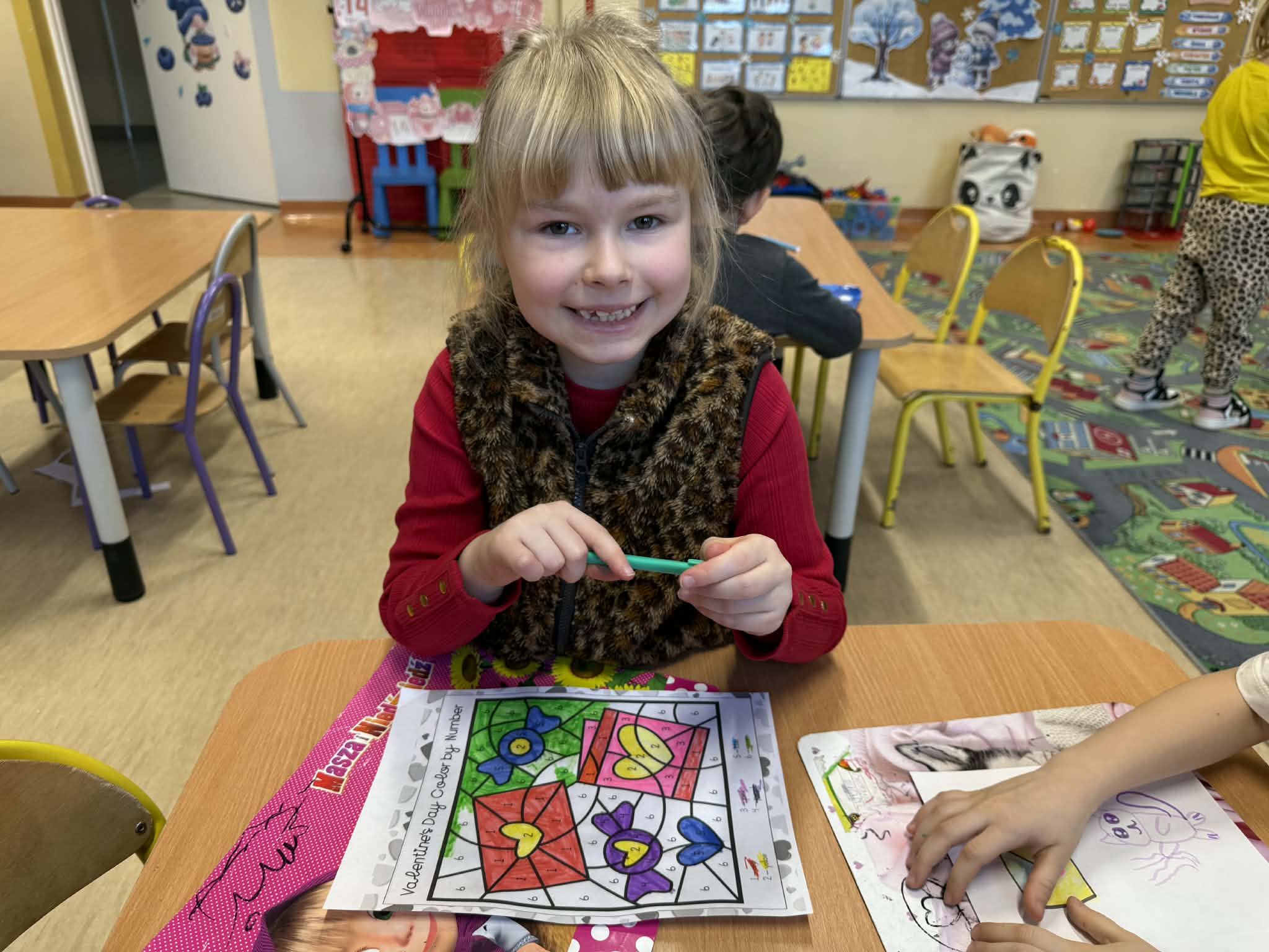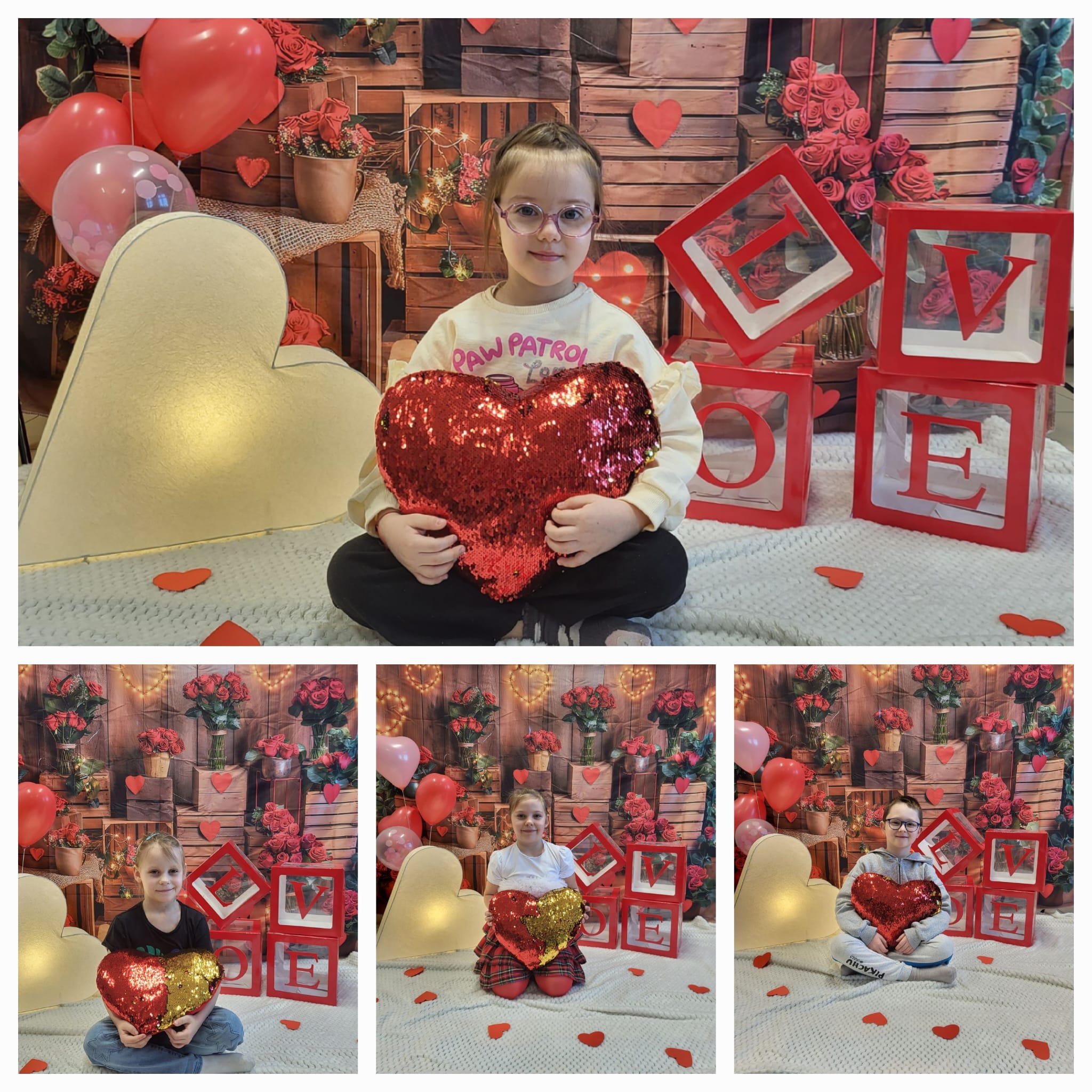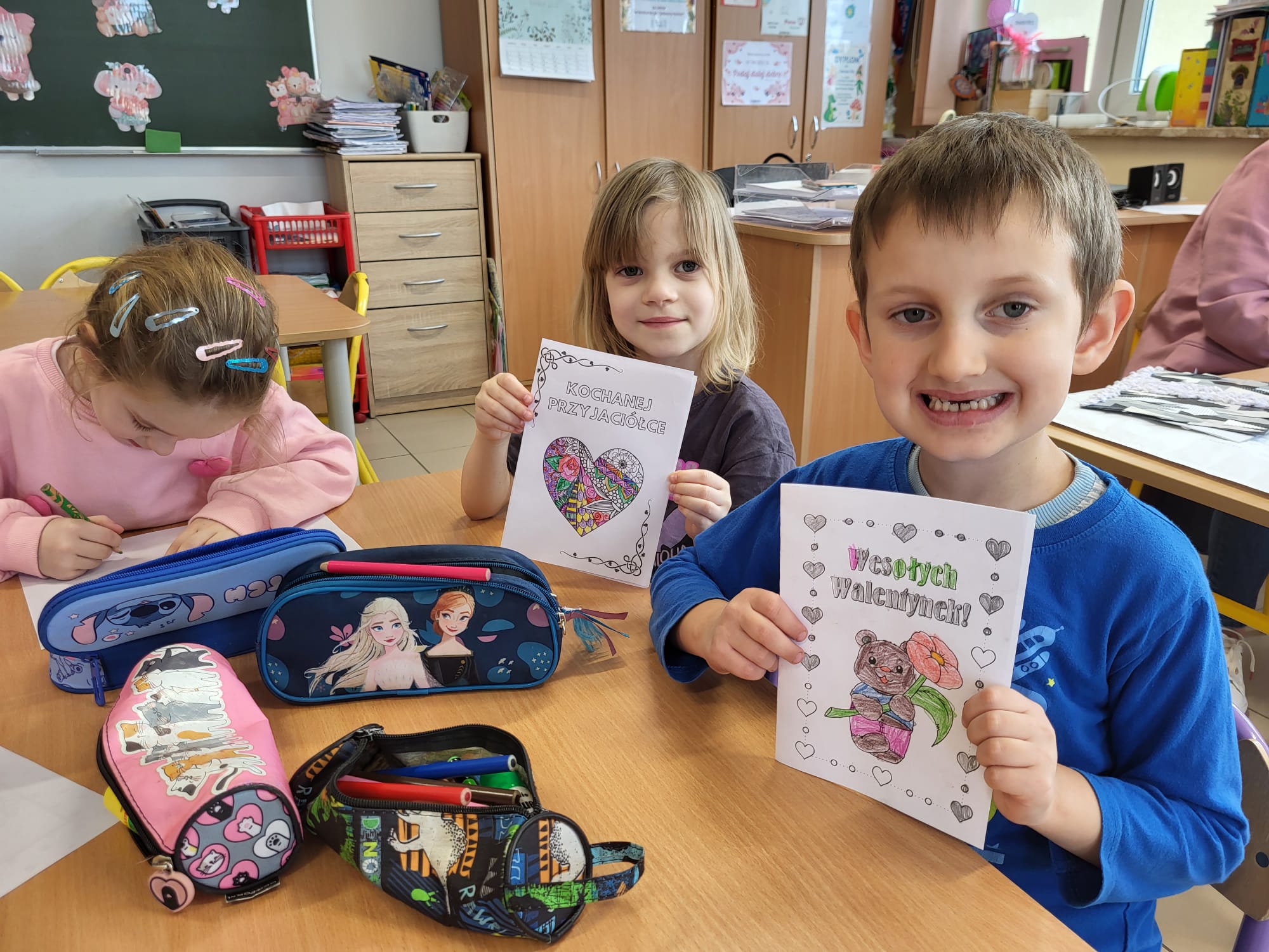 Przedszkolaki z radością szukały i łączyły połówki serduszek, wykonały piękne kartki walentynkowe oraz uczestniczyły w licznych zabawach i tańcach integracyjnych. W salach panowała radosna, pełna uśmiechu atmosfera.