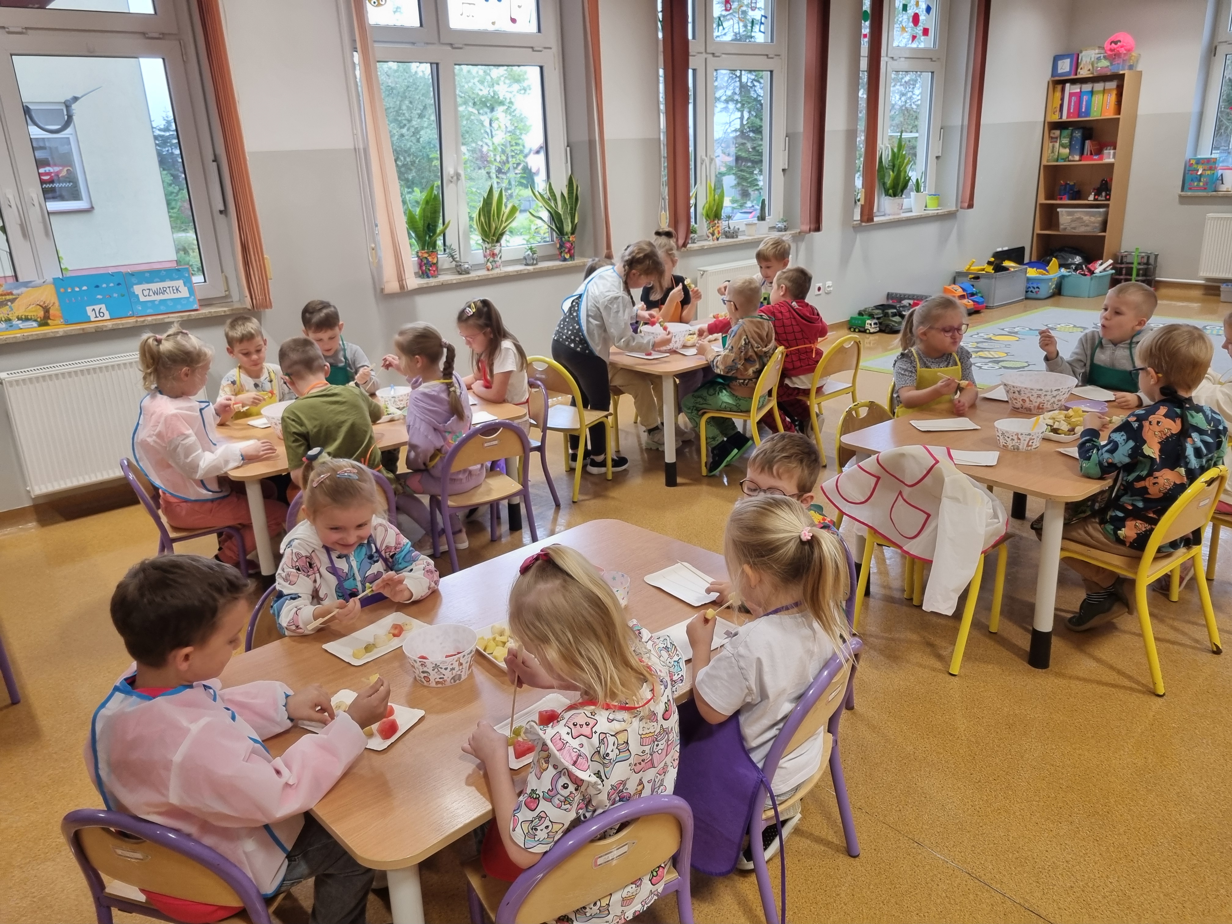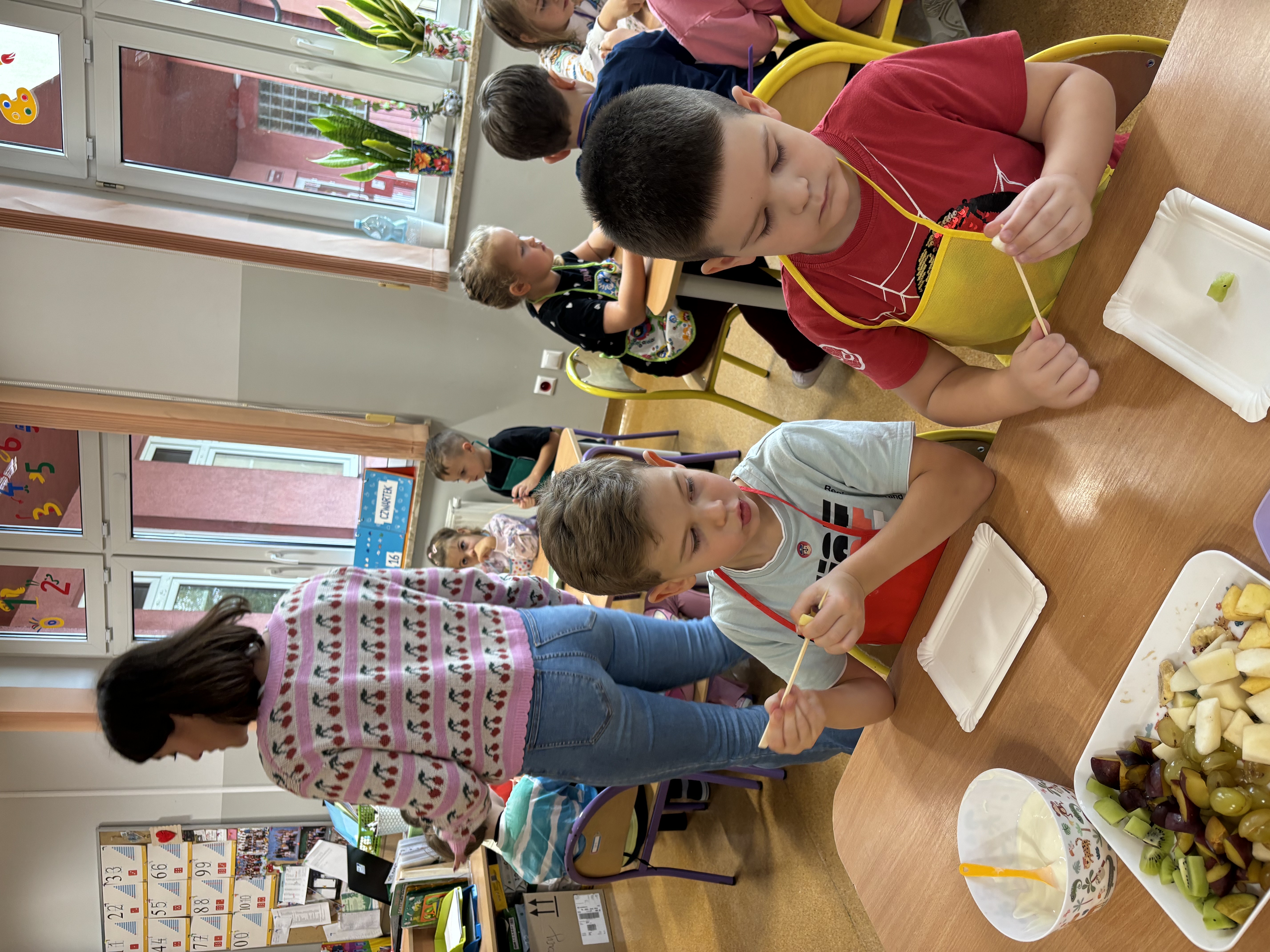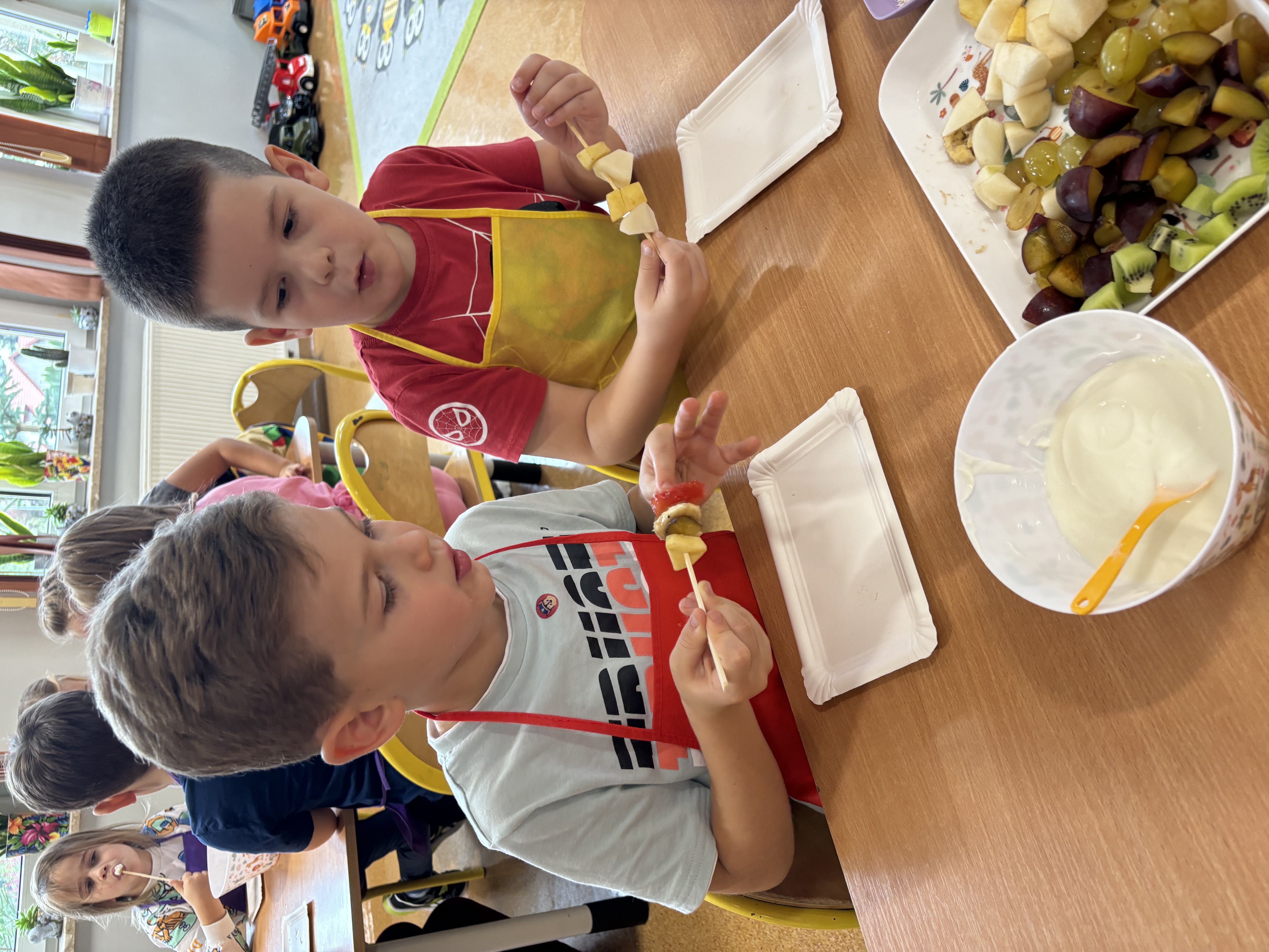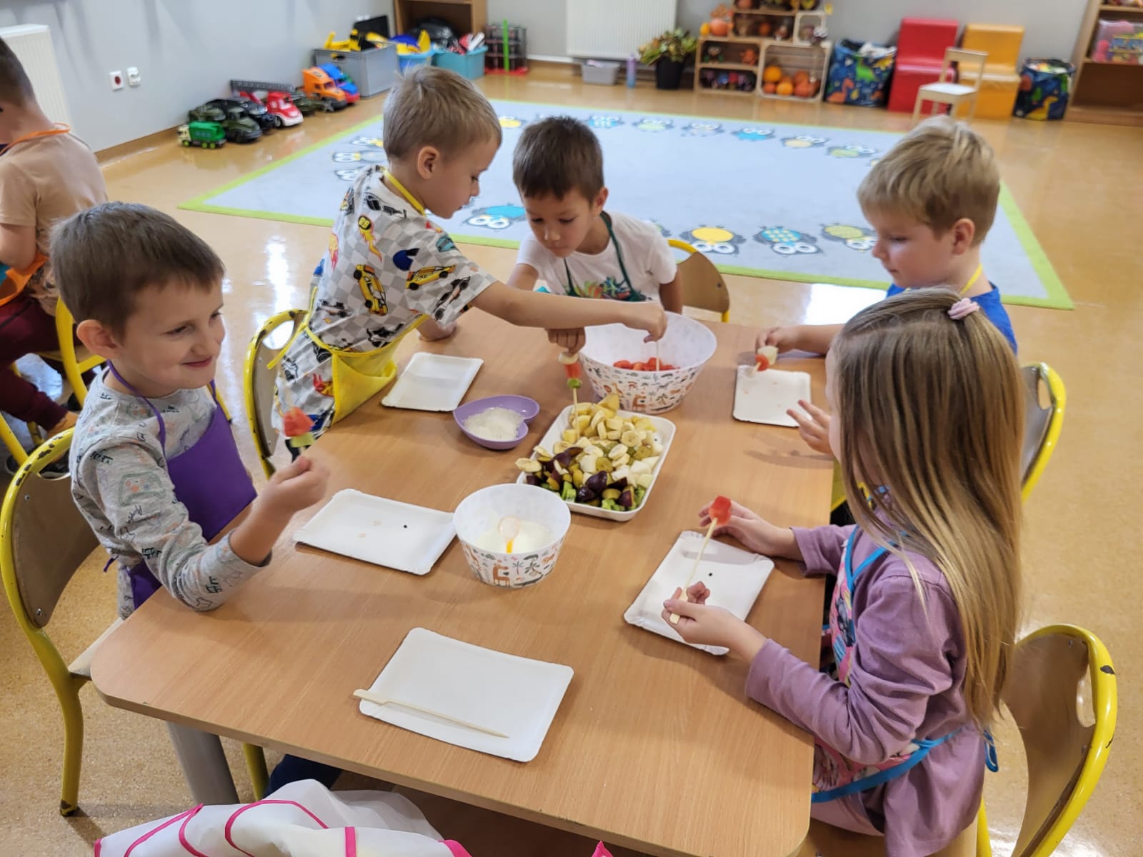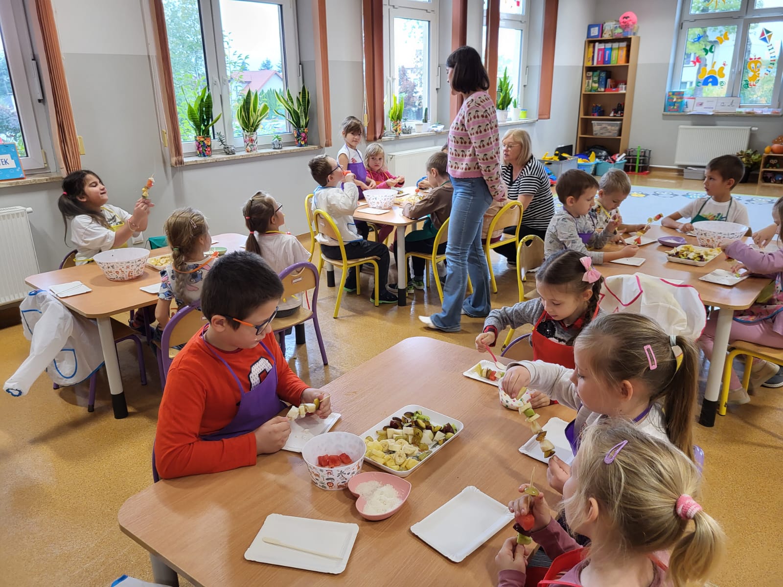 Nie zabrakło również części praktycznej – przedszkolaki z wielkim zaangażowaniem przygotowywały zdrowe przekąski, rozpoznawały owoce i warzywa po smaku i zapachu, a także brały udział w wesołych zabawach ruchowych związanych z tematem zdrowego stylu życia.
