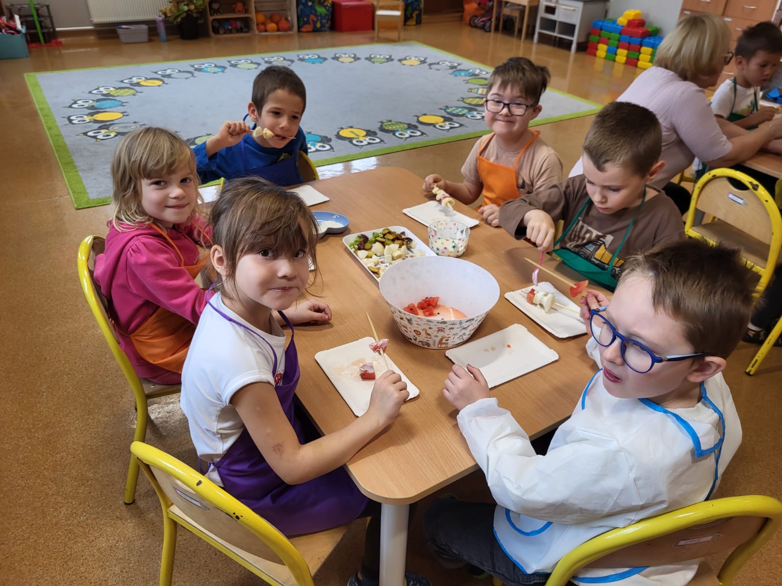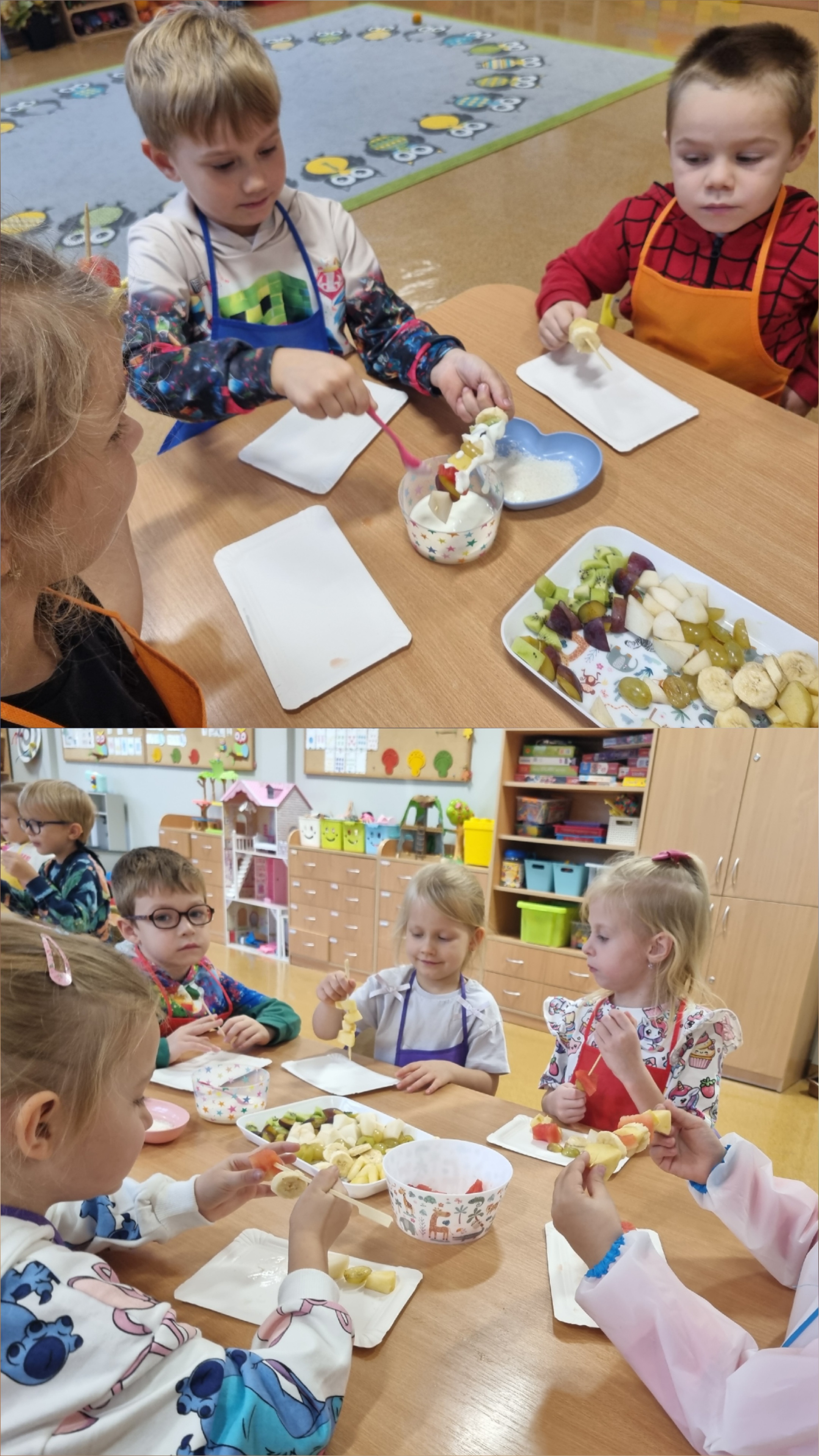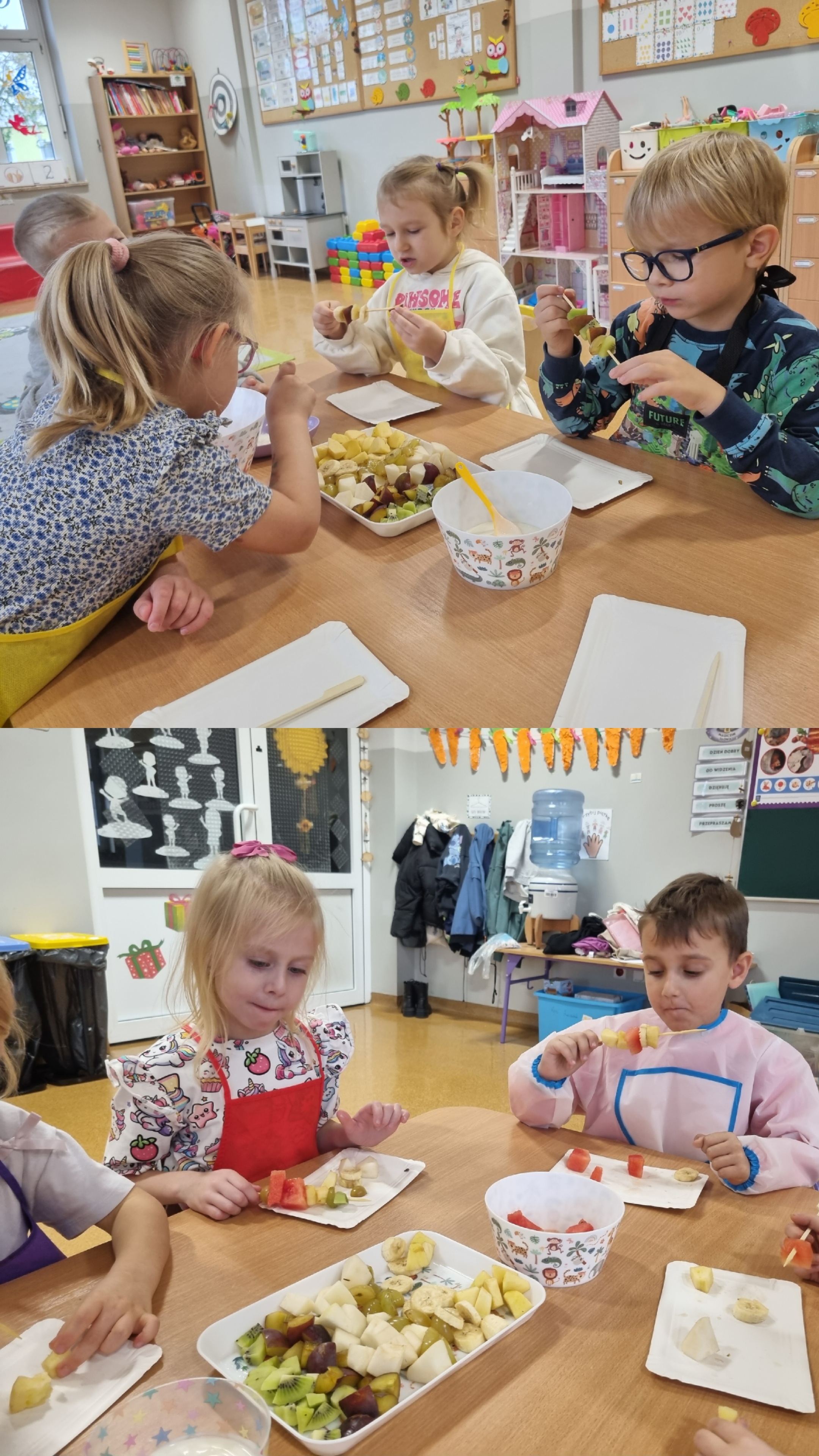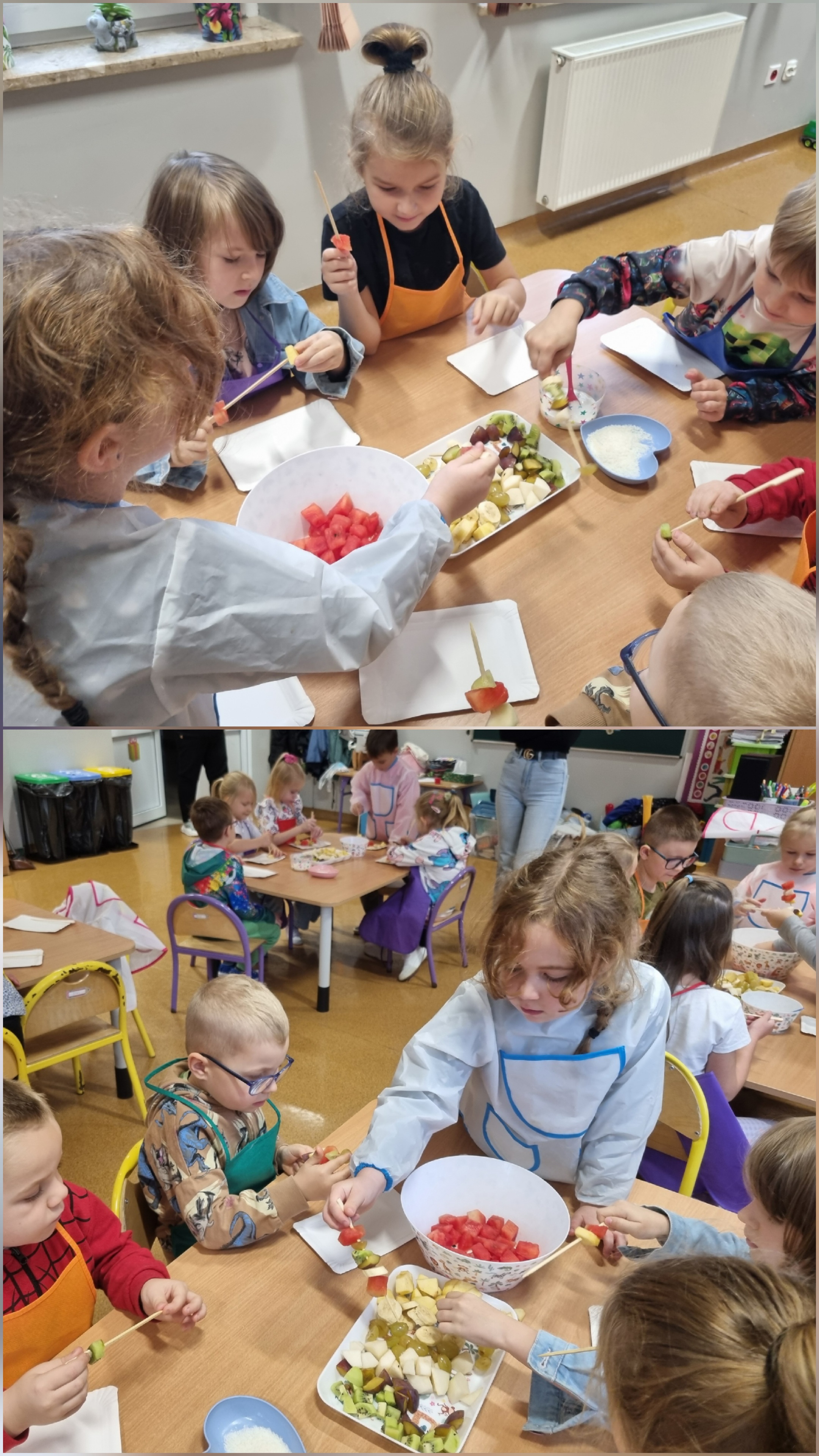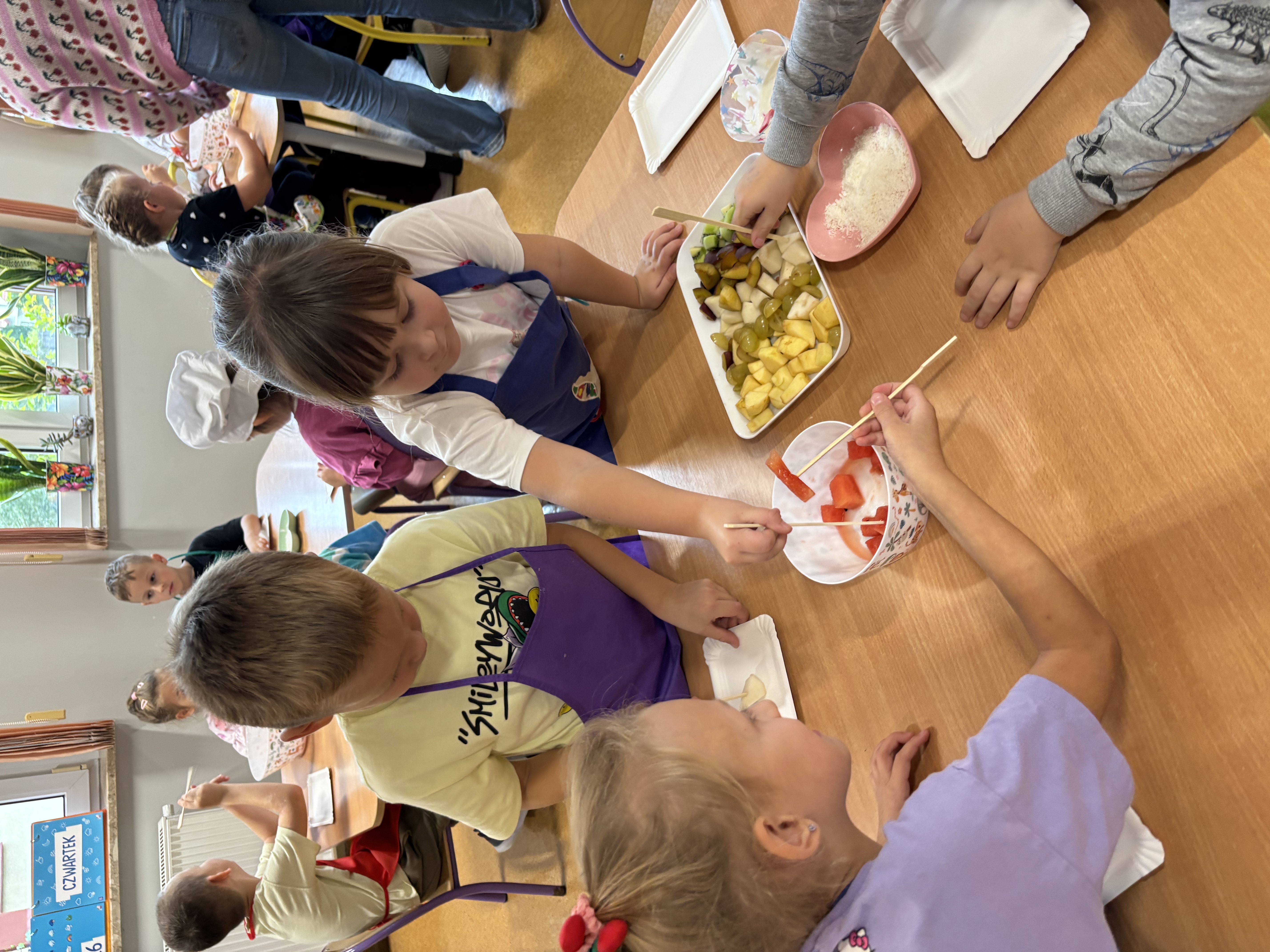 Nie zabrakło również części praktycznej – przedszkolaki z wielkim zaangażowaniem przygotowywały zdrowe przekąski, rozpoznawały owoce i warzywa po smaku i zapachu, a także brały udział w wesołych zabawach ruchowych związanych z tematem zdrowego stylu życia.