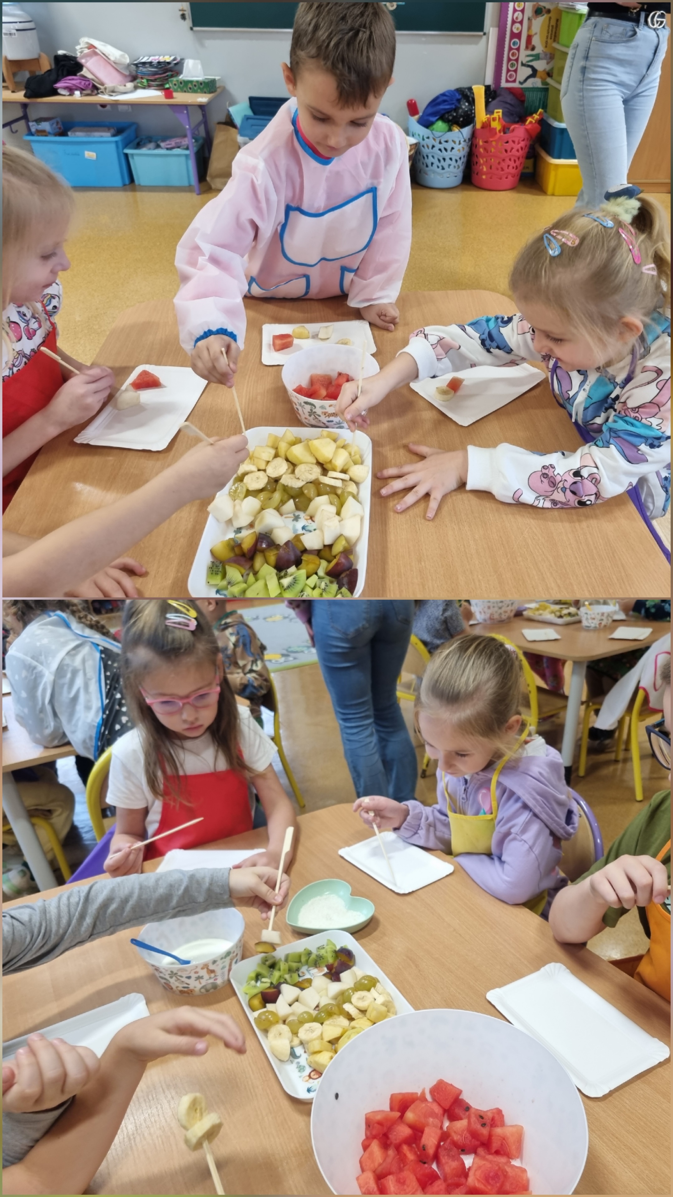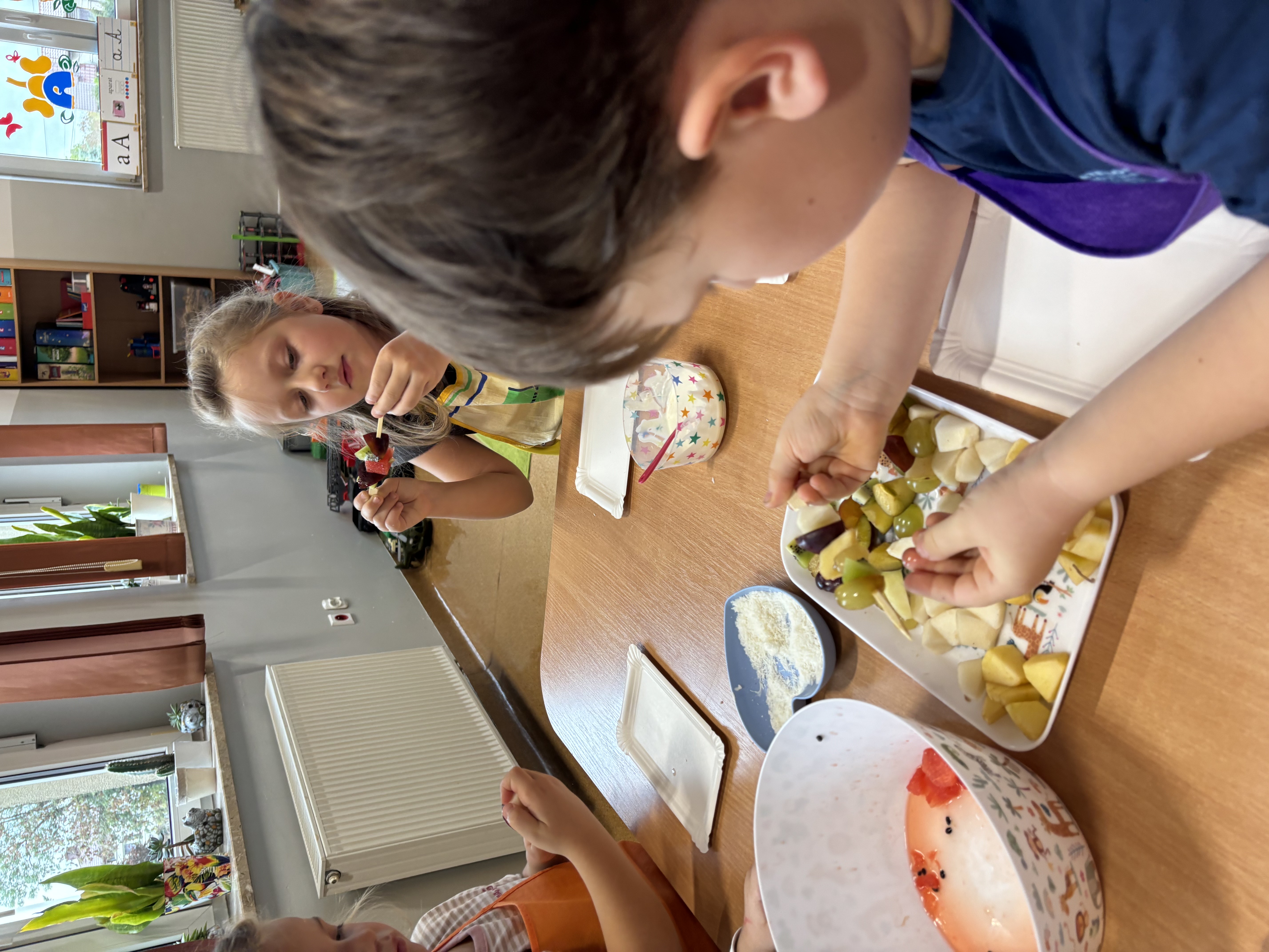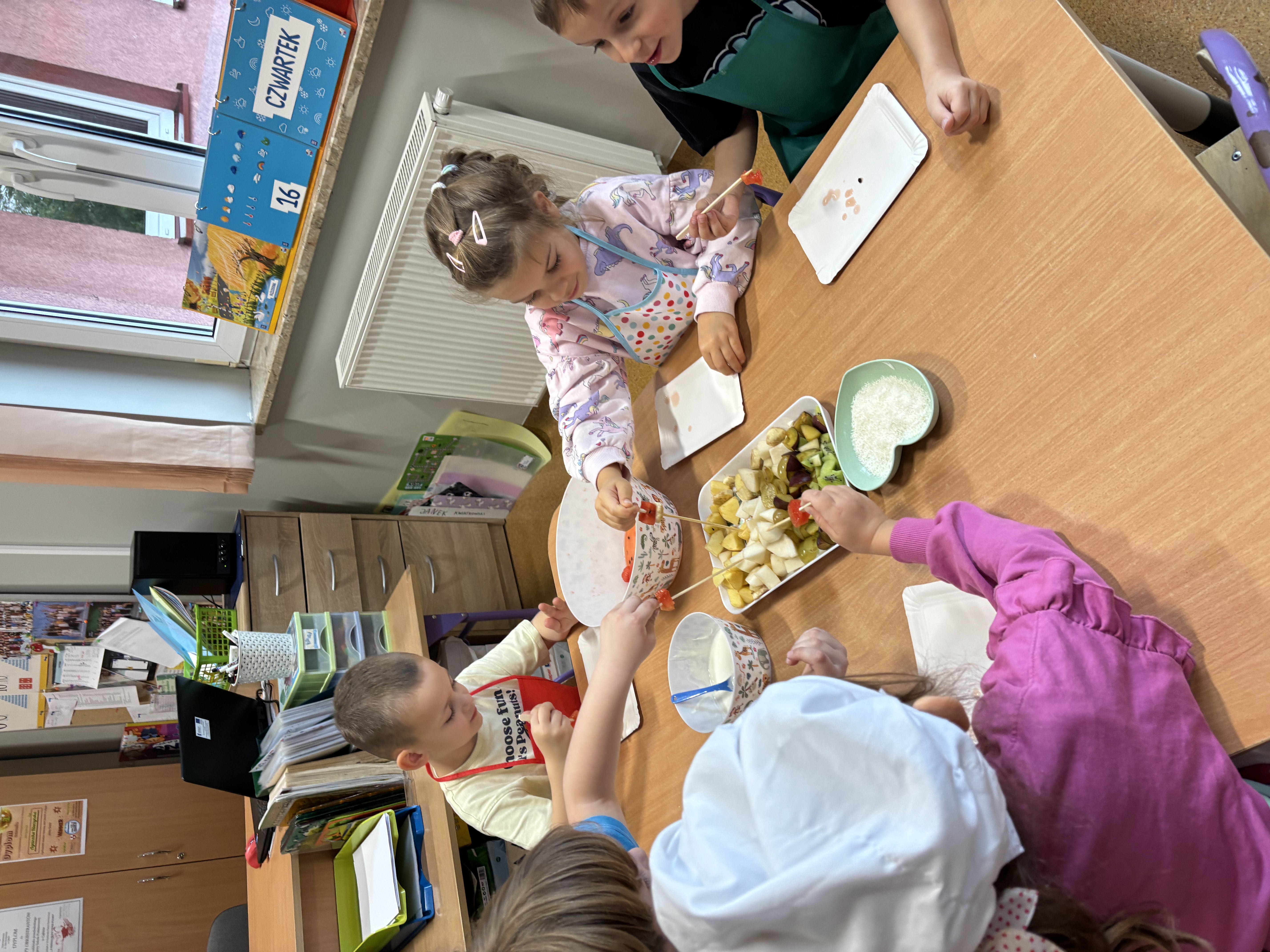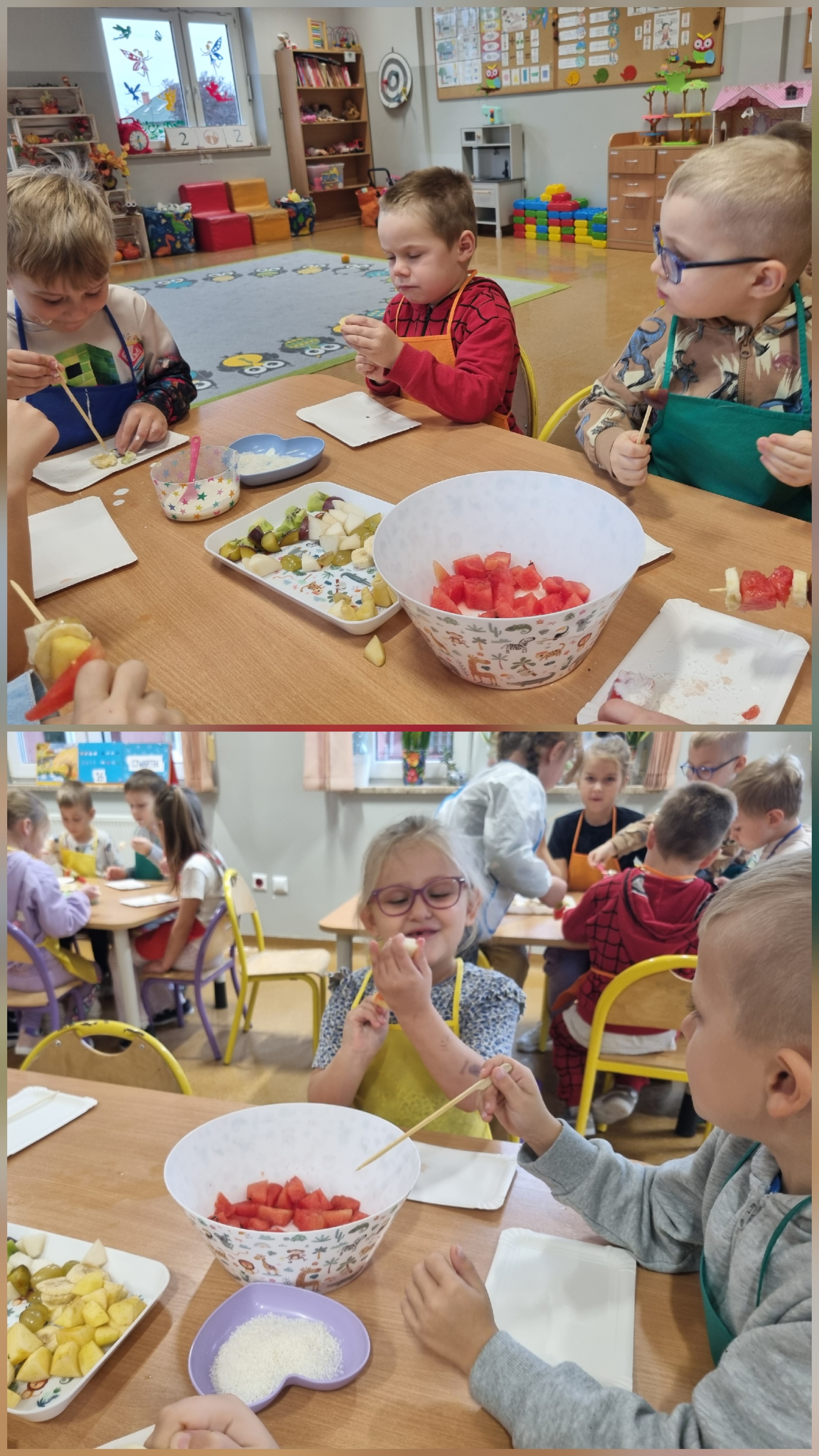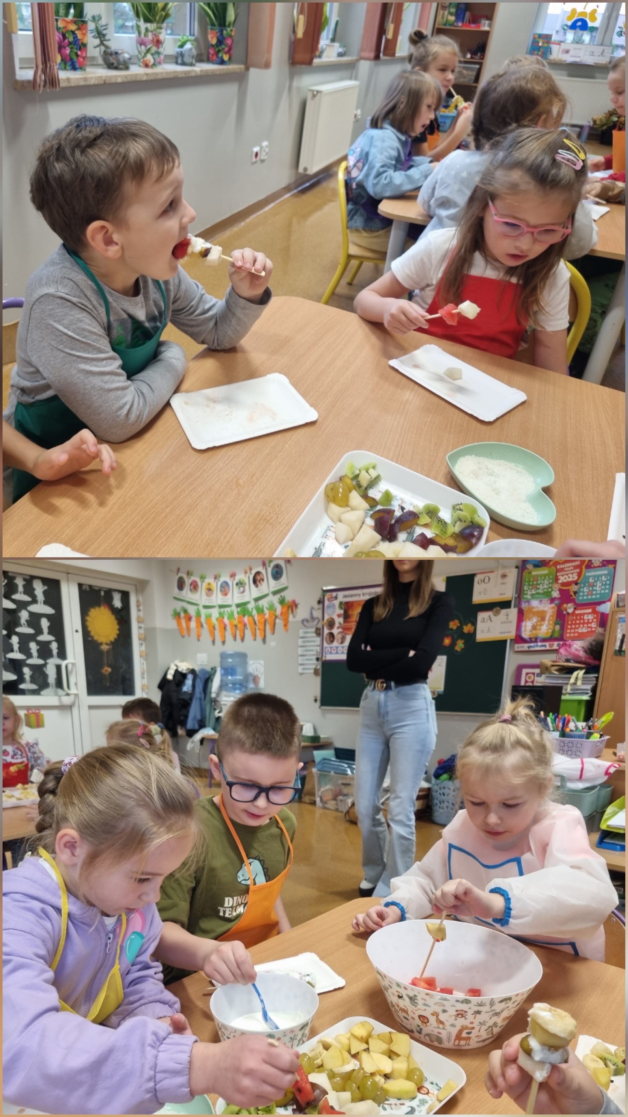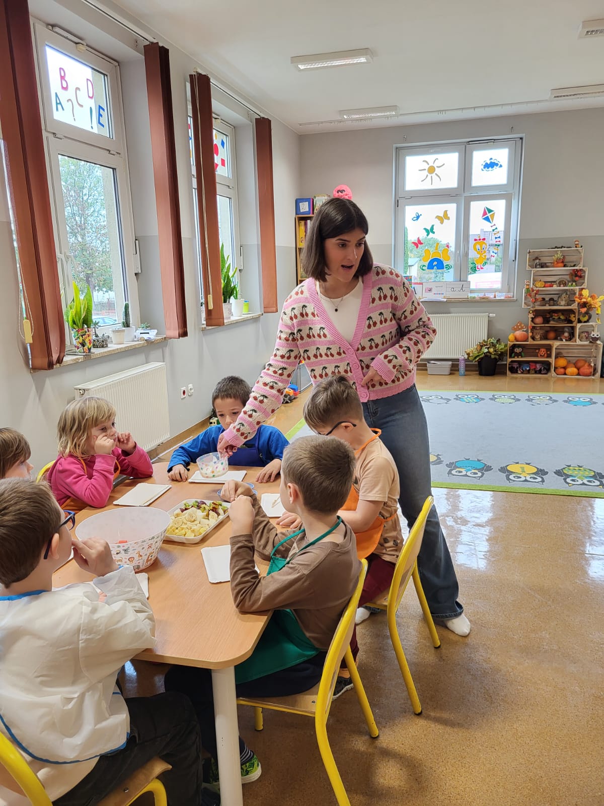 Nie zabrakło również części praktycznej – przedszkolaki z wielkim zaangażowaniem przygotowywały zdrowe przekąski, rozpoznawały owoce i warzywa po smaku i zapachu, a także brały udział w wesołych zabawach ruchowych związanych z tematem zdrowego stylu życia.