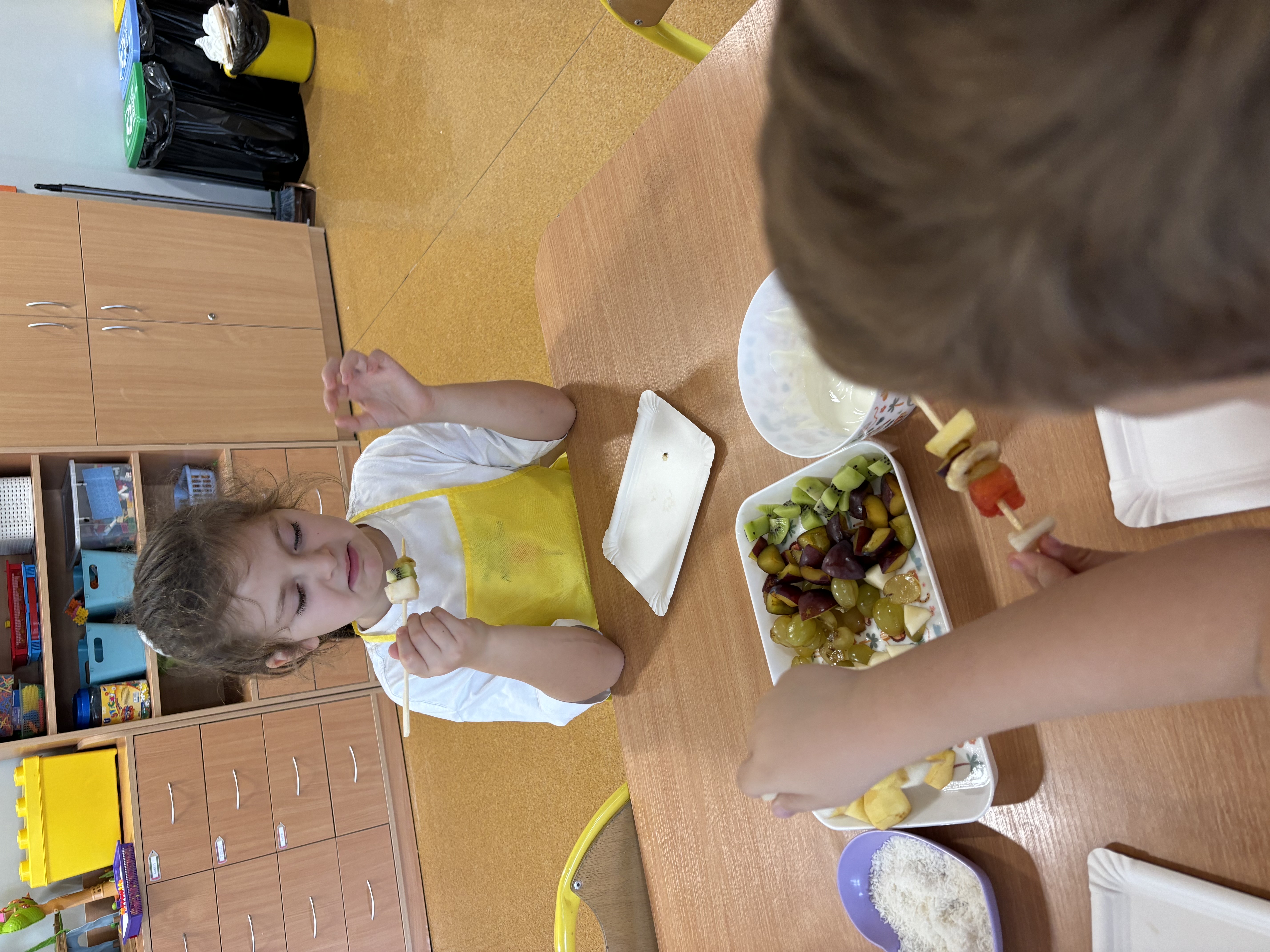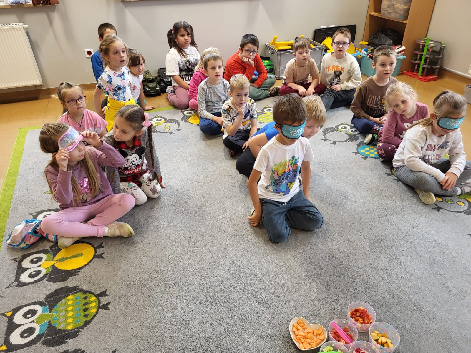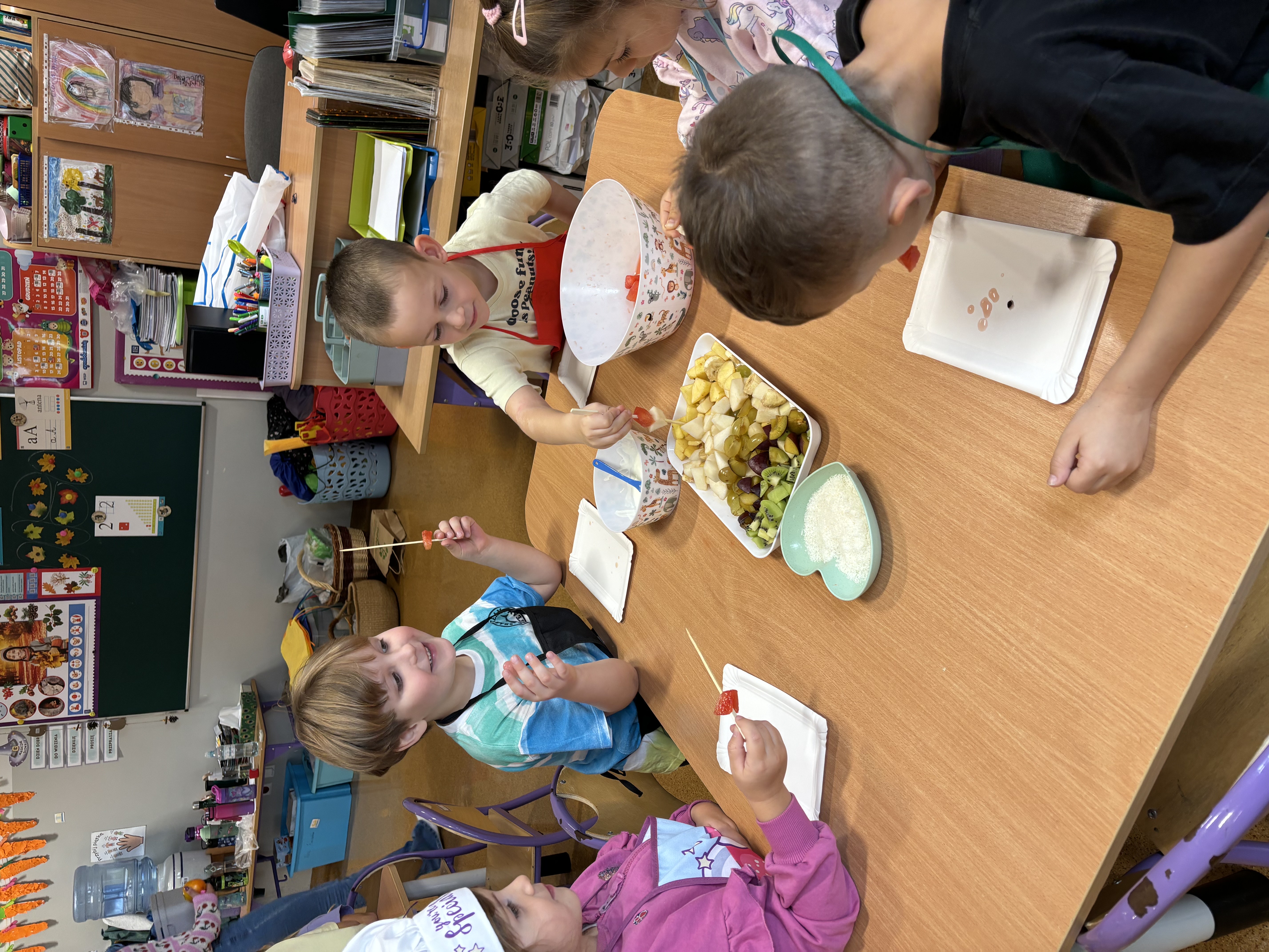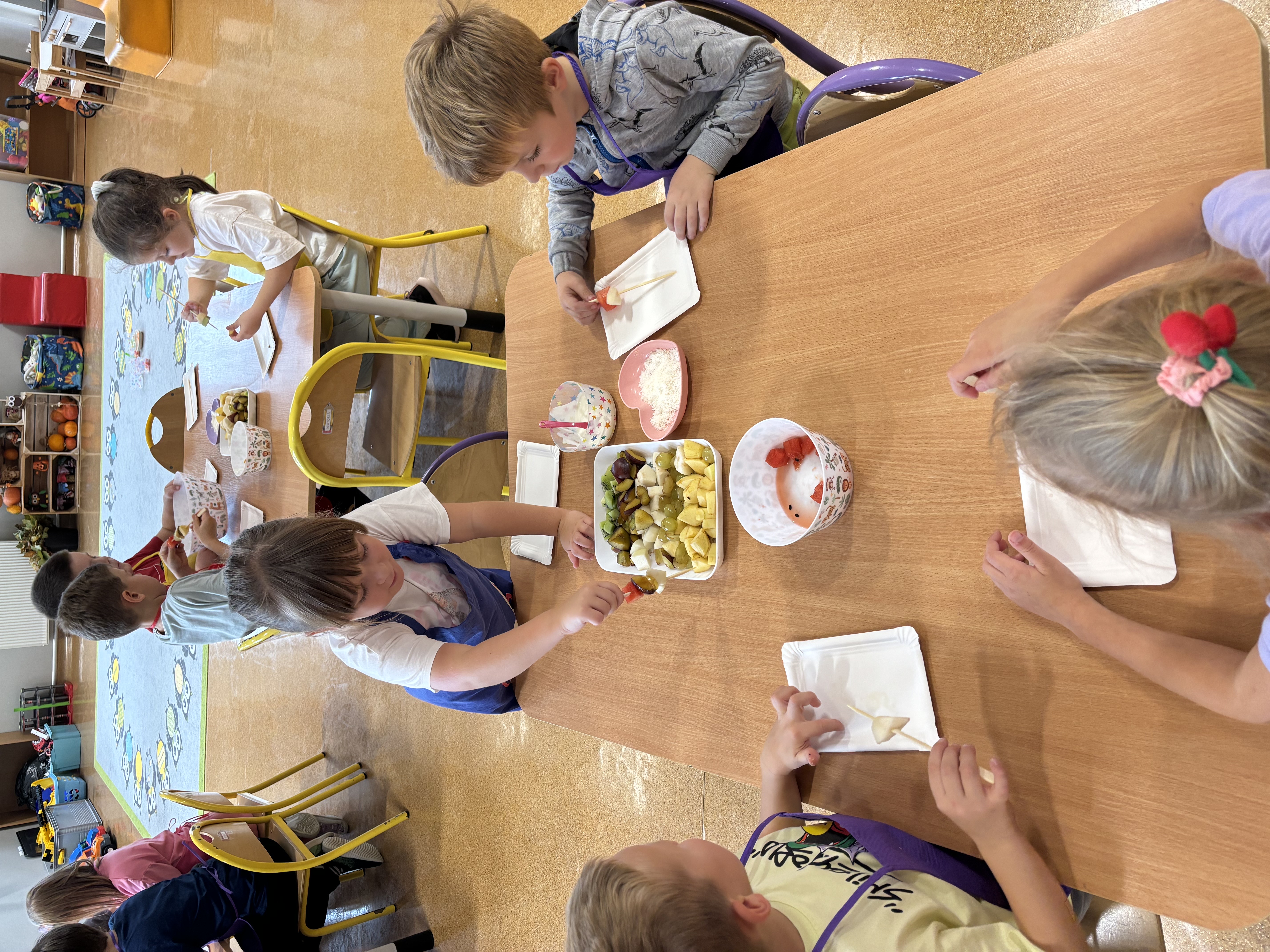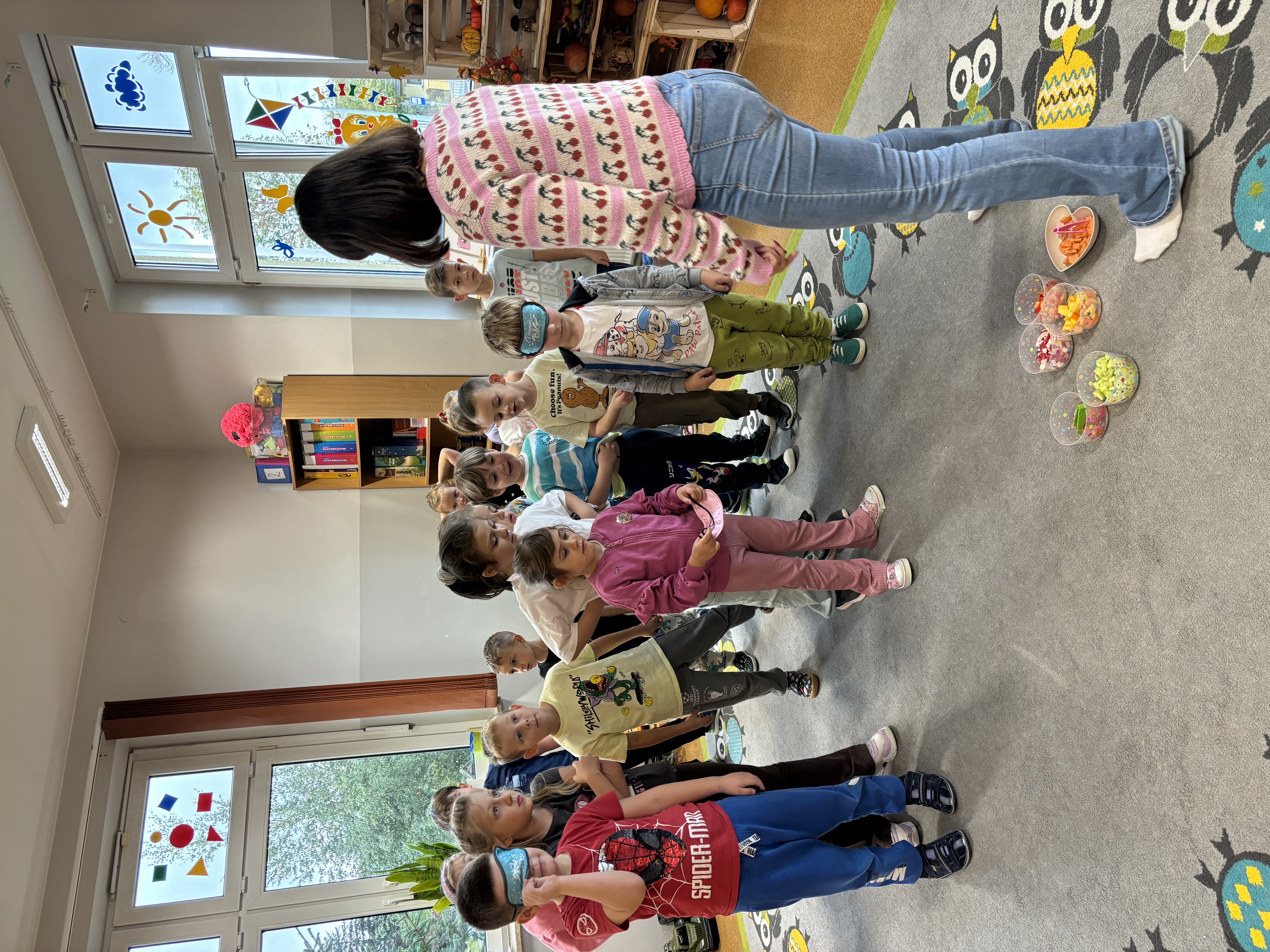 Nie zabrakło również części praktycznej – przedszkolaki z wielkim zaangażowaniem przygotowywały zdrowe przekąski, rozpoznawały owoce i warzywa po smaku i zapachu, a także brały udział w wesołych zabawach ruchowych związanych z tematem zdrowego stylu życia.