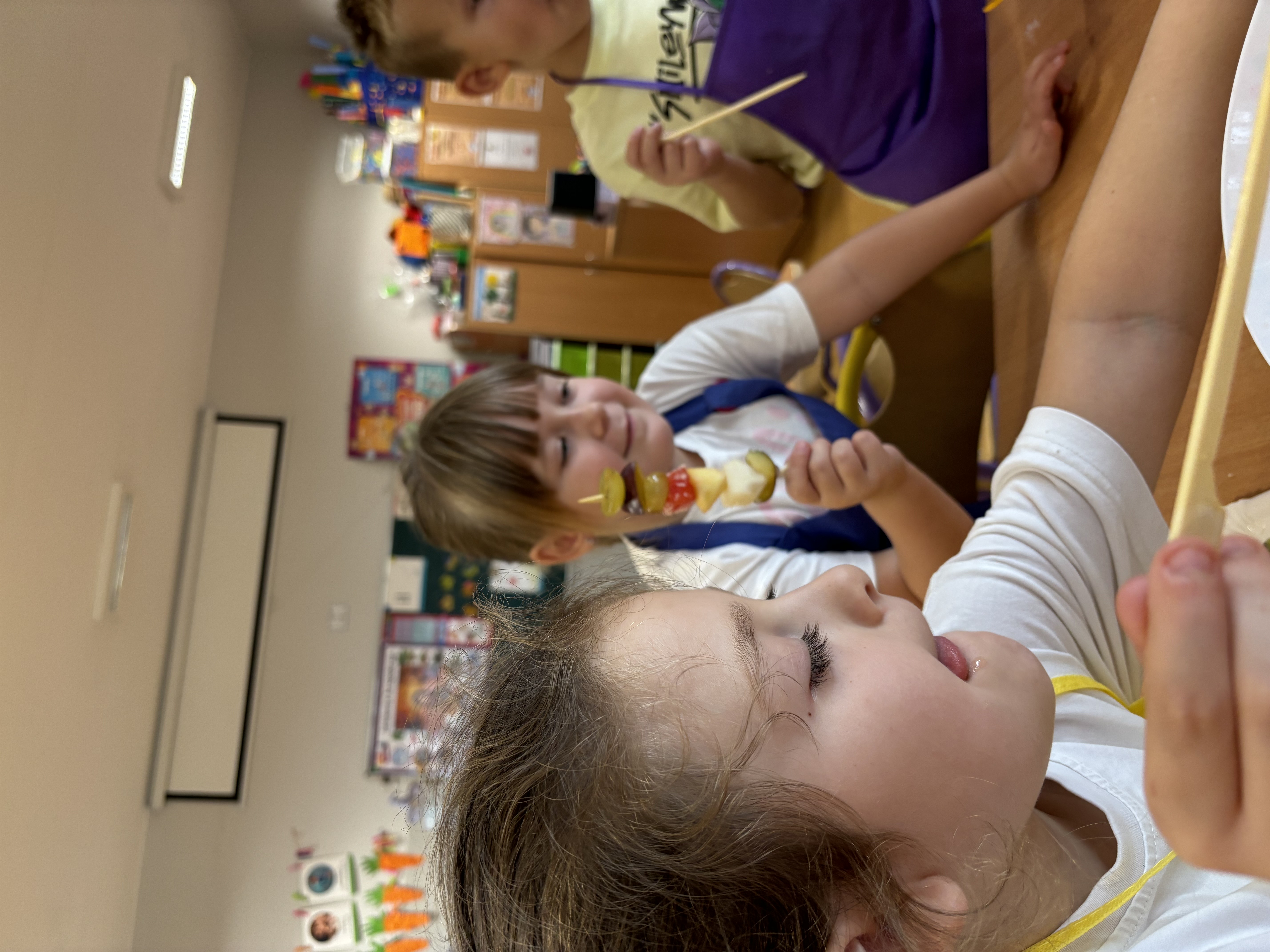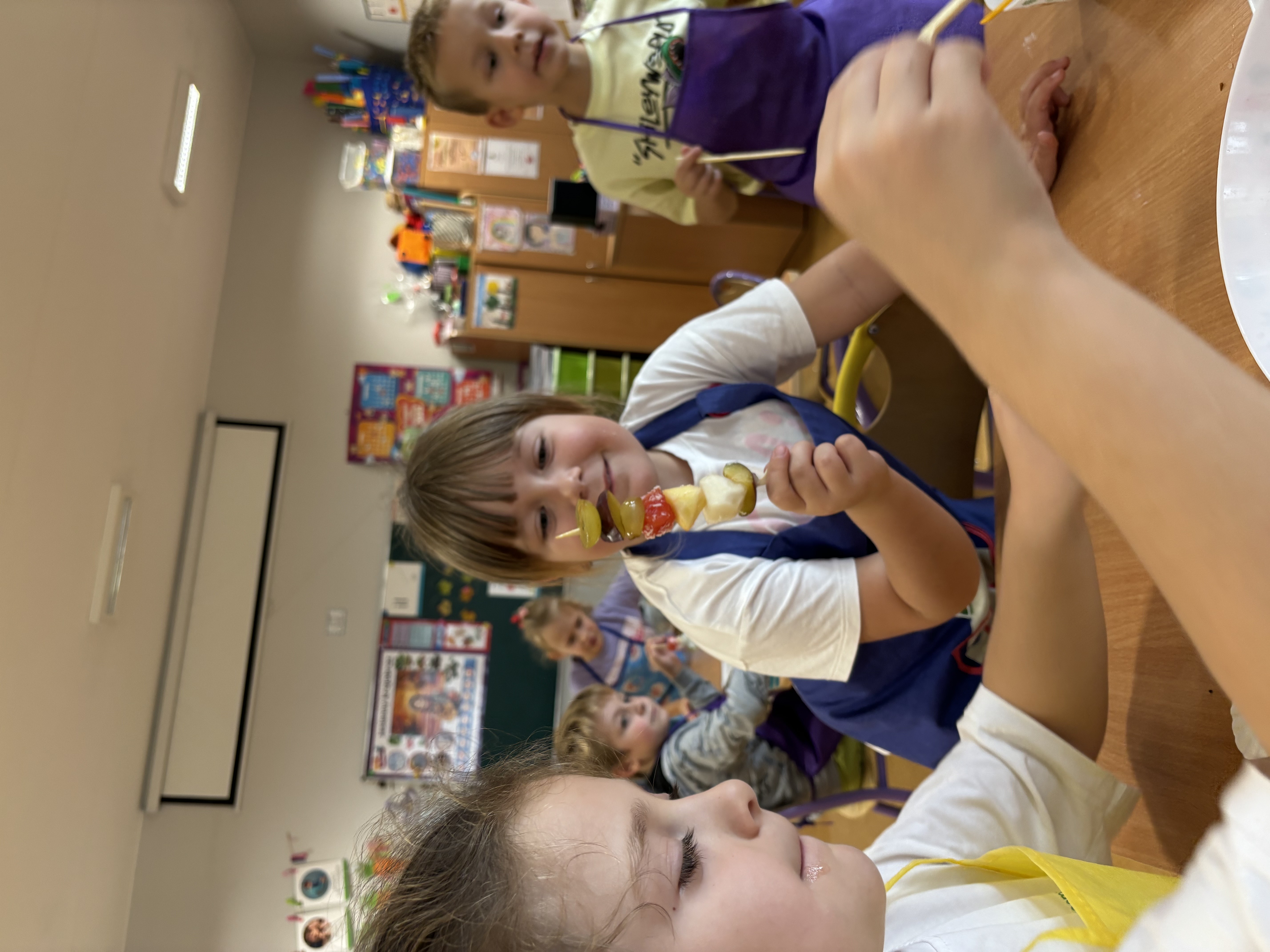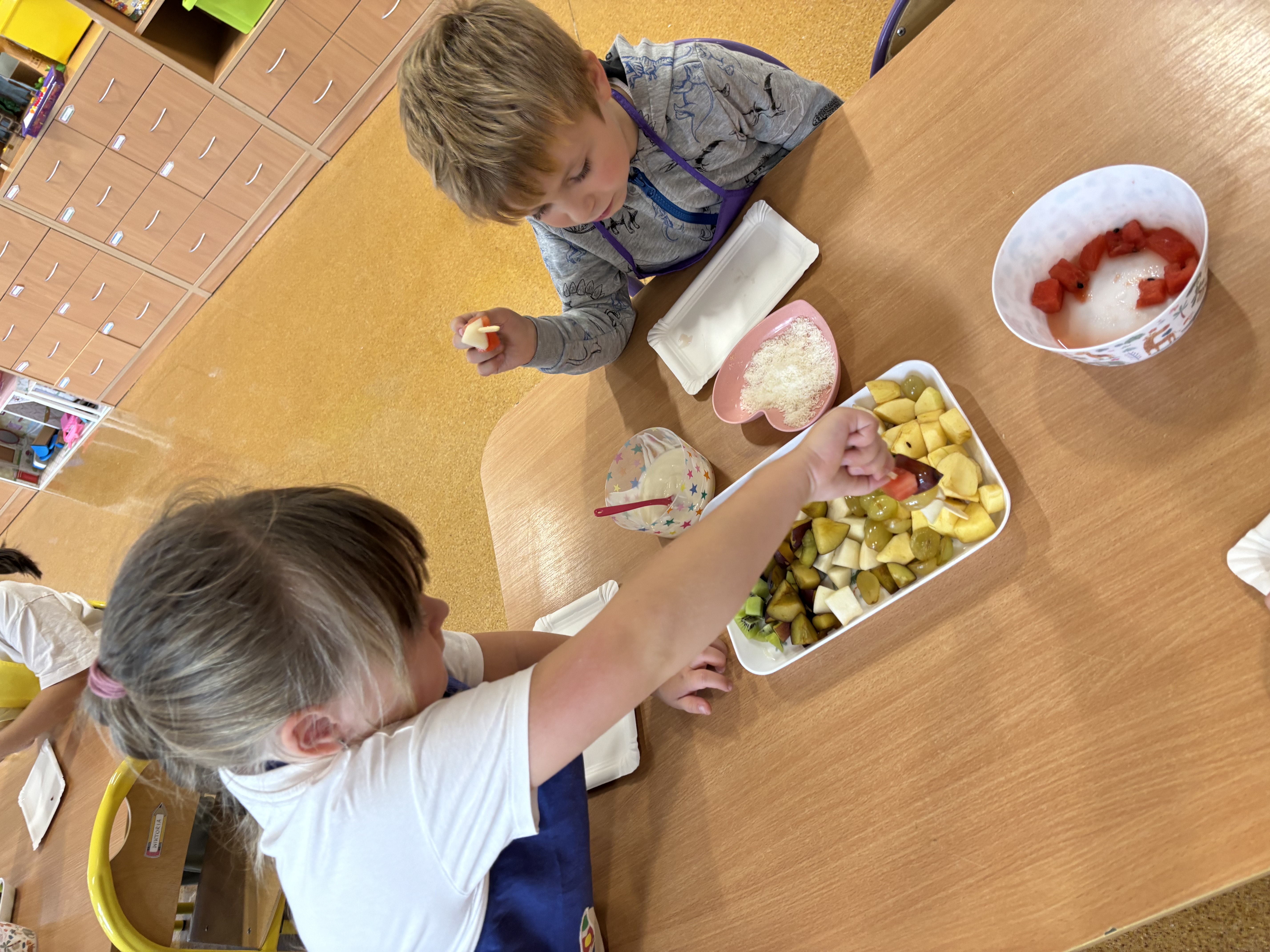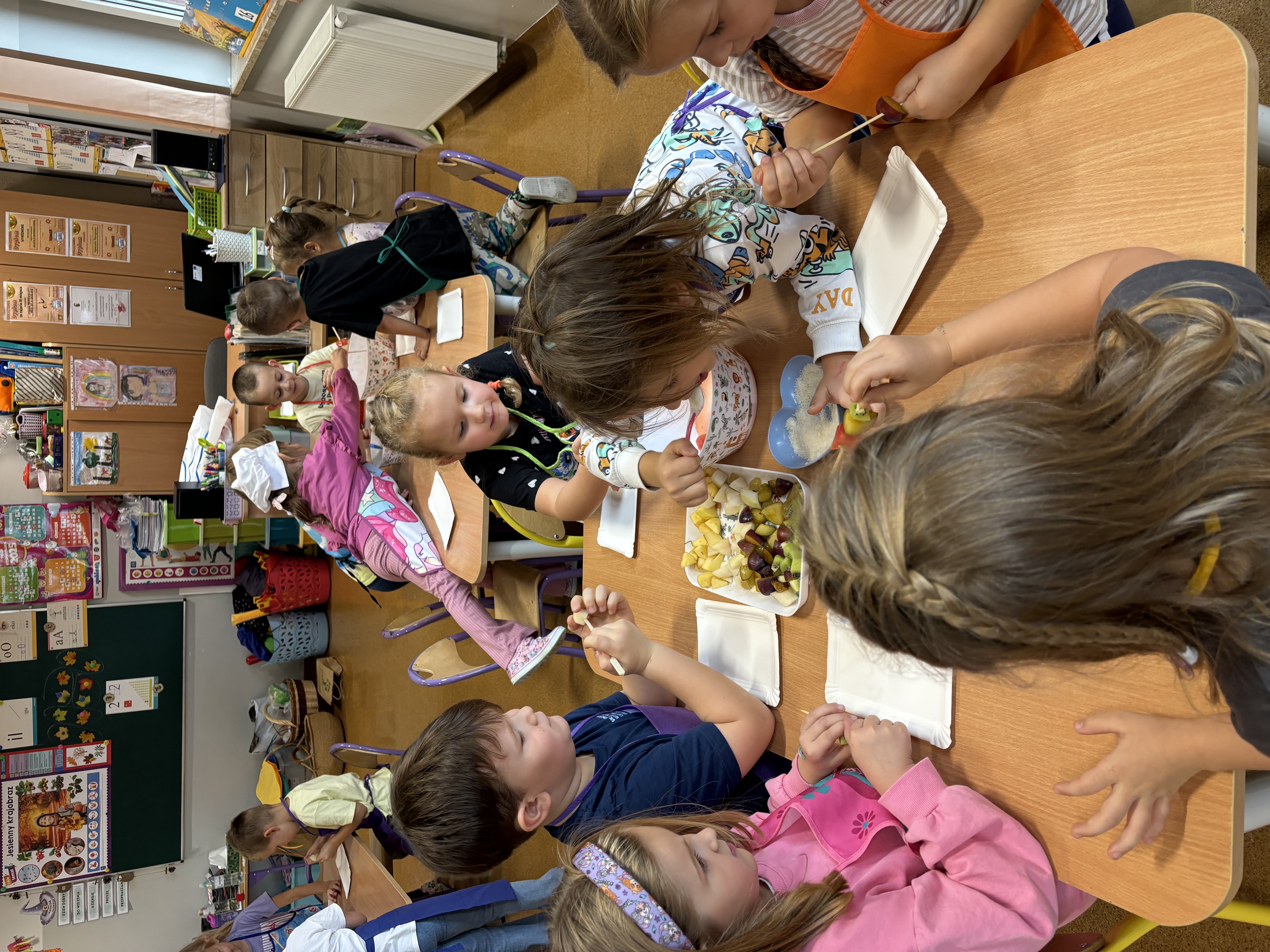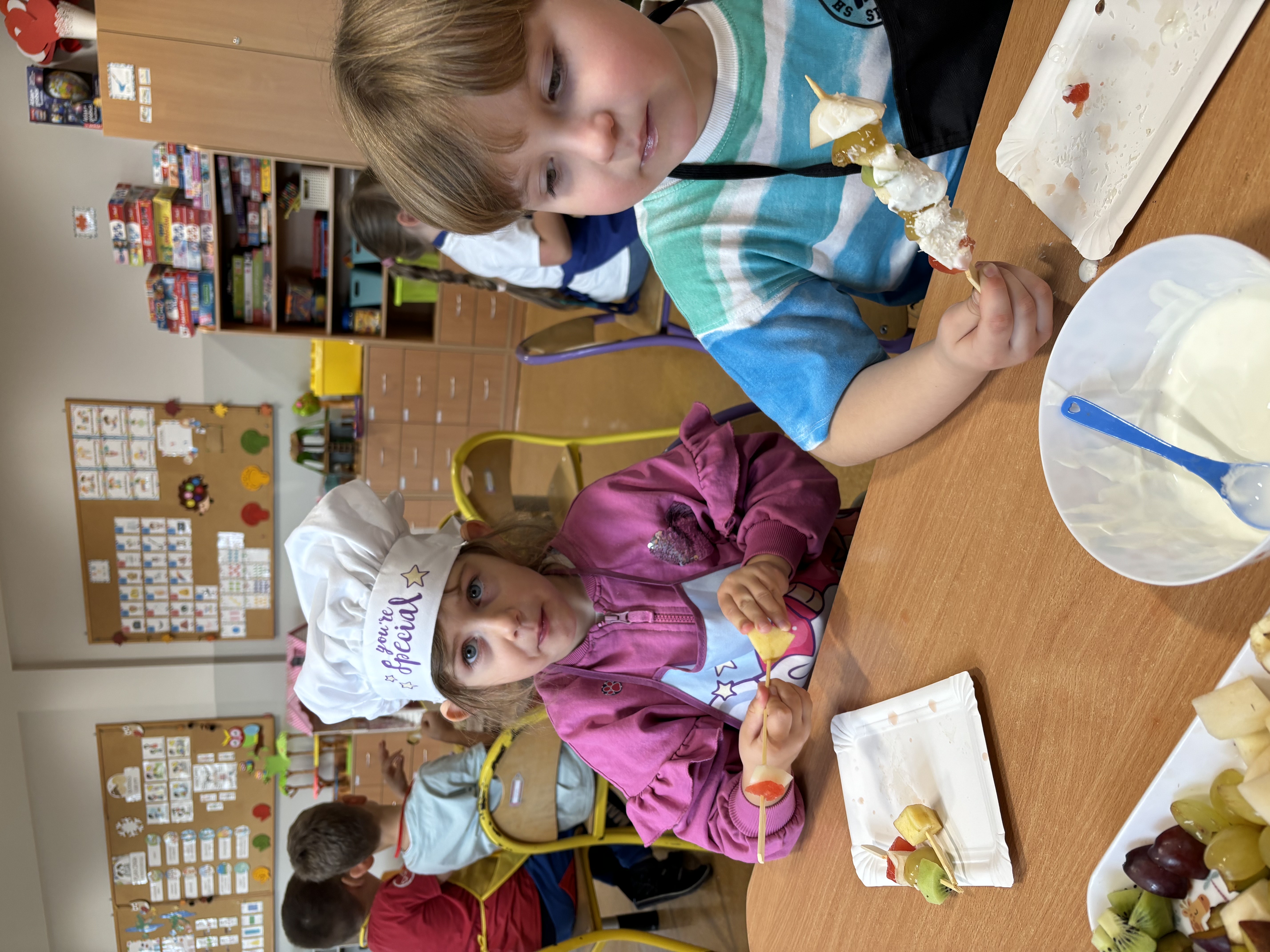 Nie zabrakło również części praktycznej – przedszkolaki z wielkim zaangażowaniem przygotowywały zdrowe przekąski, rozpoznawały owoce i warzywa po smaku i zapachu, a także brały udział w wesołych zabawach ruchowych związanych z tematem zdrowego stylu życia.