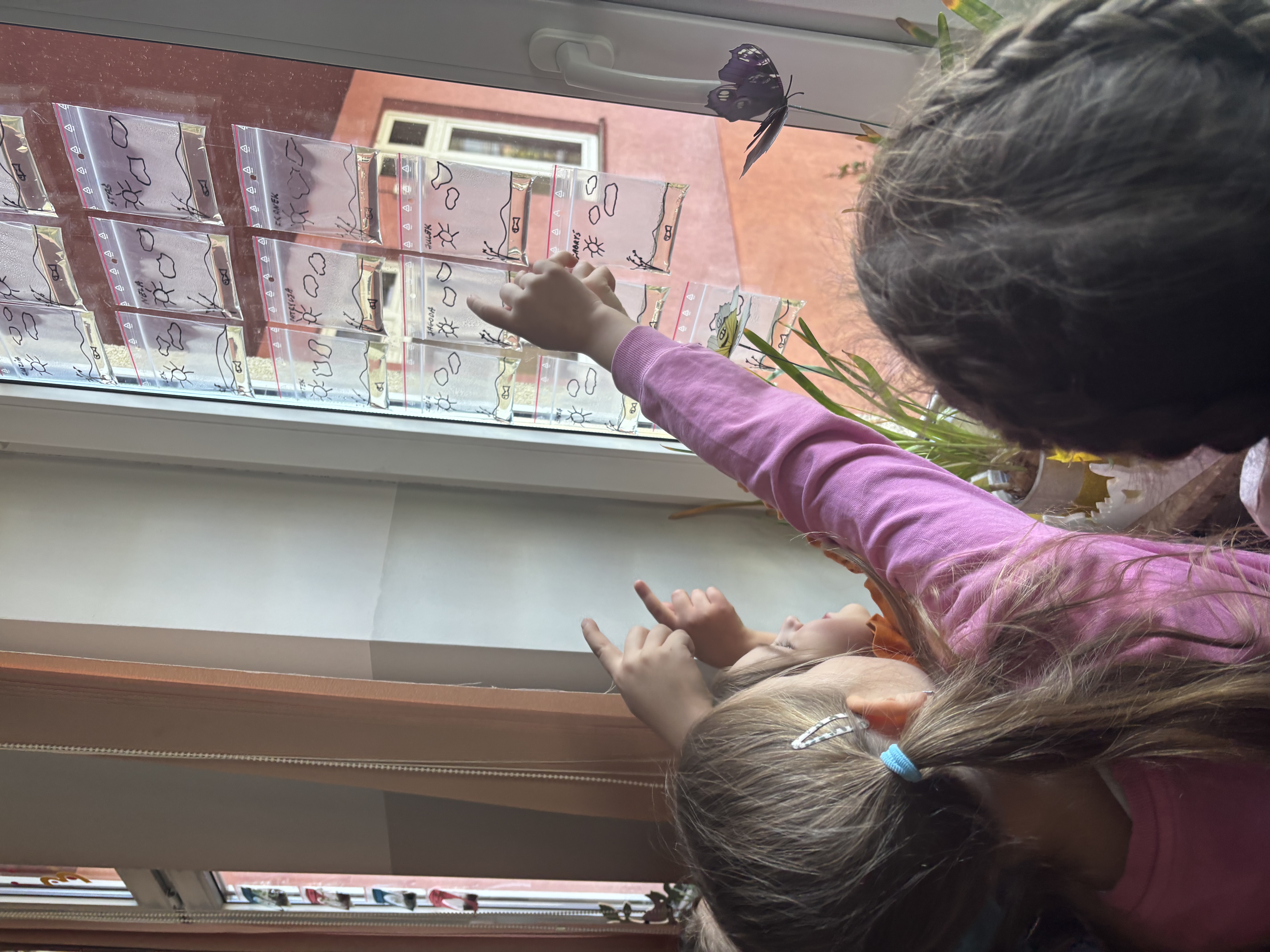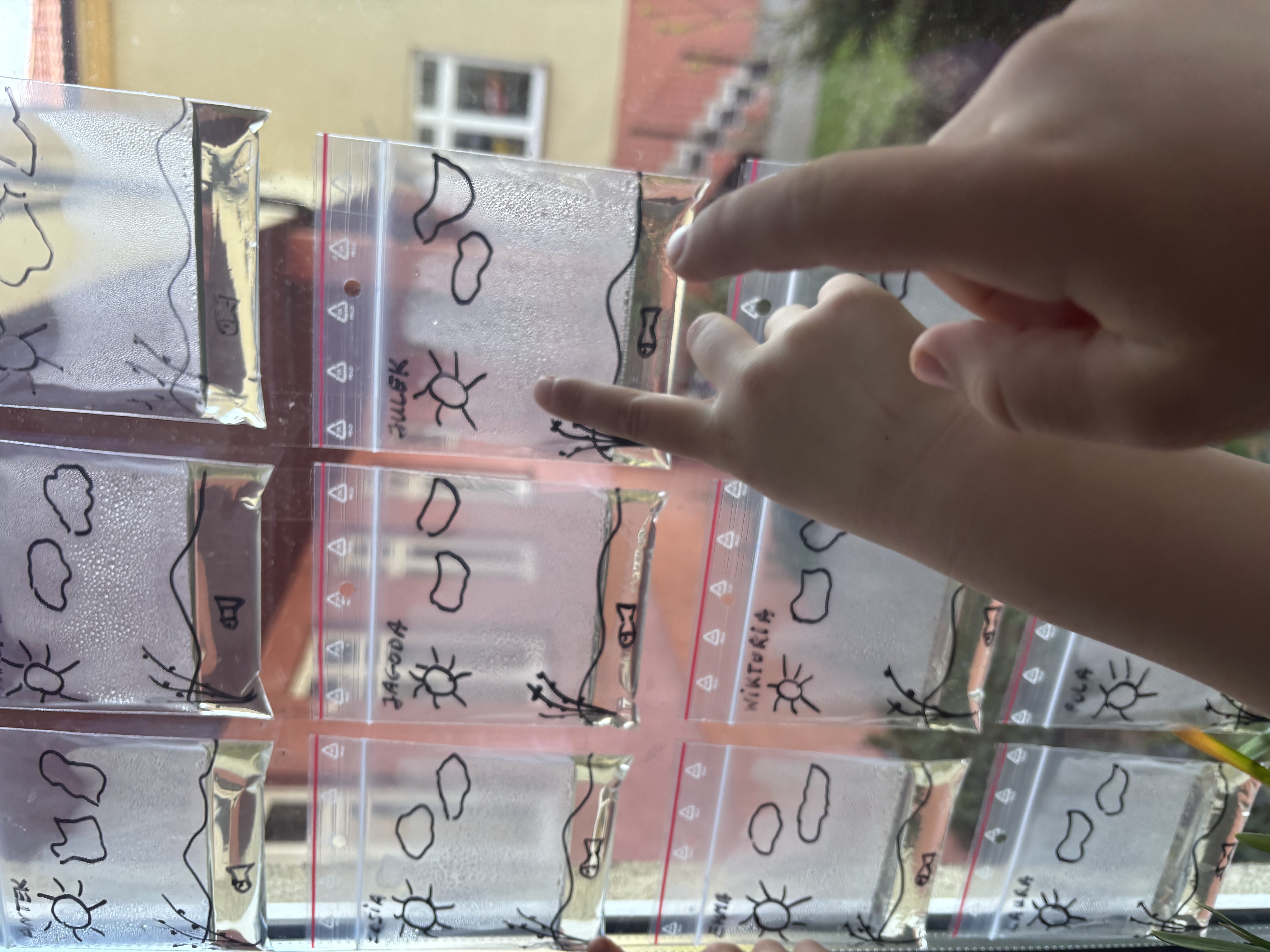 Dużym zainteresowaniem cieszył się również eksperyment przyrodniczy pokazujący, jak powstaje deszcz. W tym celu wykorzystaliśmy foliowe woreczki strunowe, do których wlaliśmy niewielką ilość wody. Po zawieszeniu ich przy oknie dzieci mogły obserwować, jak pod wpływem ciepła woda paruje, a następnie skrapla się na ściankach woreczka, tworząc krople przypominające deszcz. Eksperyment w prosty i atrakcyjny sposób przybliżył dzieciom zjawiska zachodzące w przyrodzie.