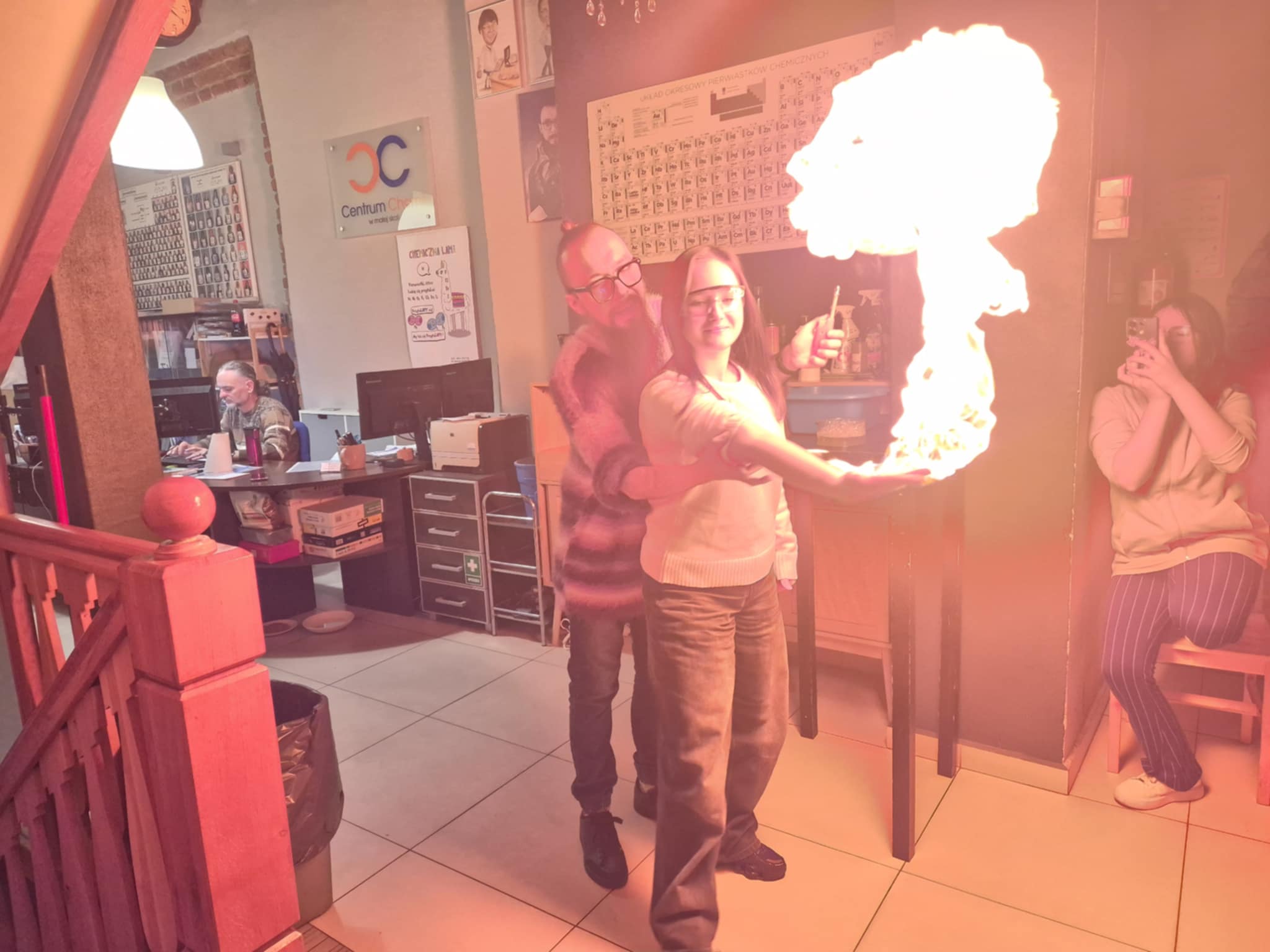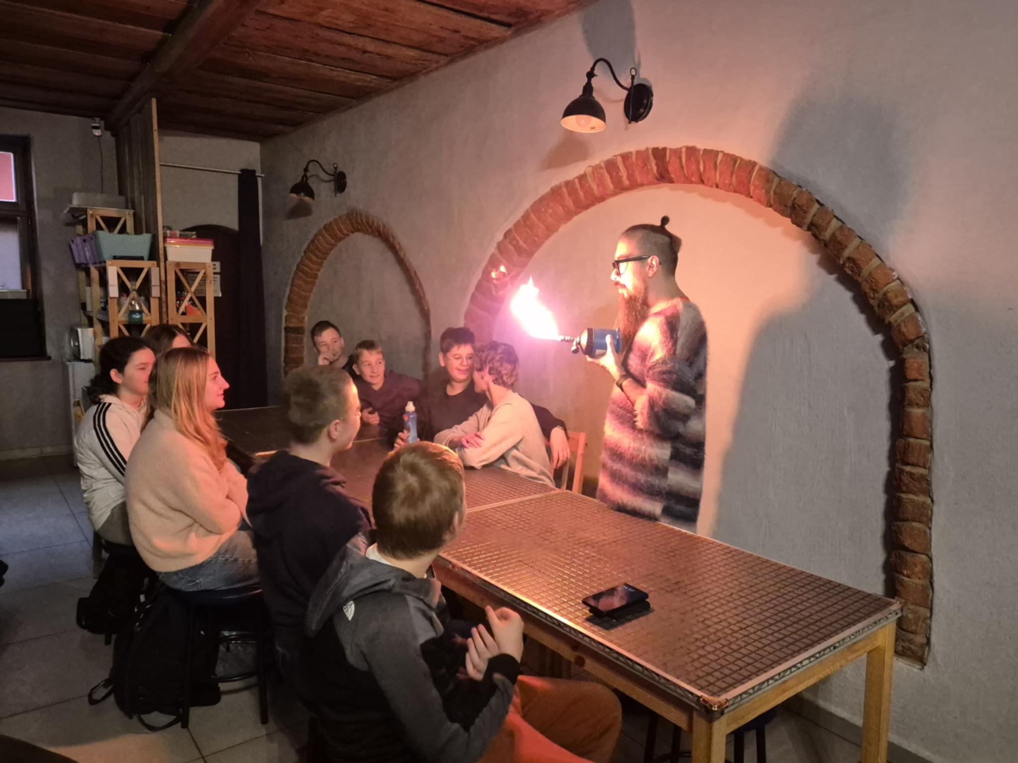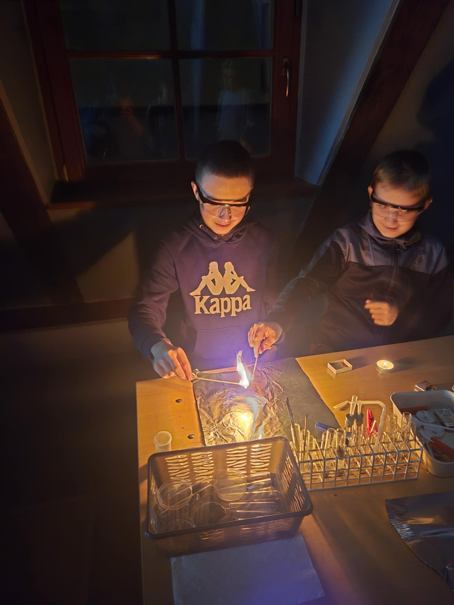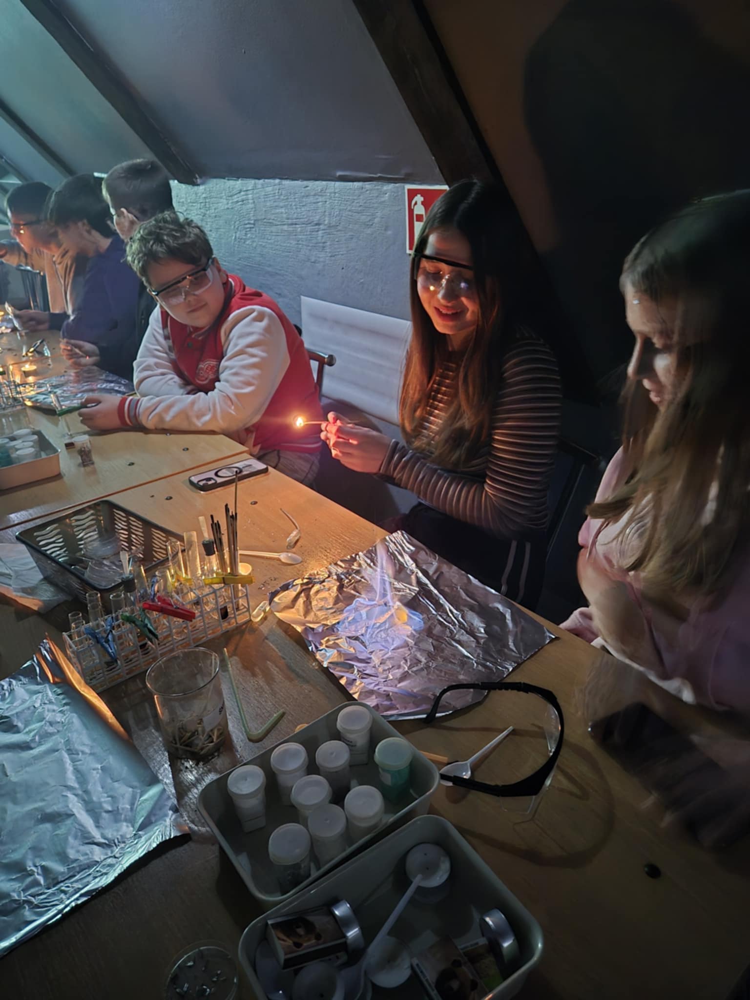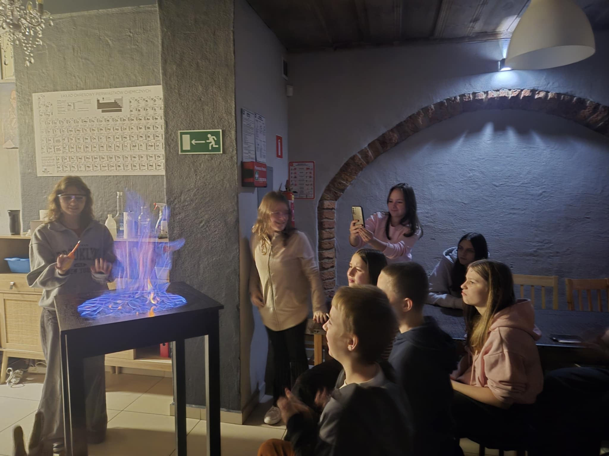 Po zajęciach geograficznych przyszedł czas na warsztaty chemiczne w Centrum Chemii w Małej Skali. Siódmoklasiści uczestniczyli w pokazach i samodzielnych eksperymentach chemicznych pod okiem charyzmatycznych prowadzących. Brali udział w otrzymywaniu wodoru, sprawdzali jego właściwości, przeprowadzali destylację cieczy a także mogli wykonać serię doświadczeń z udziałem ognia.
